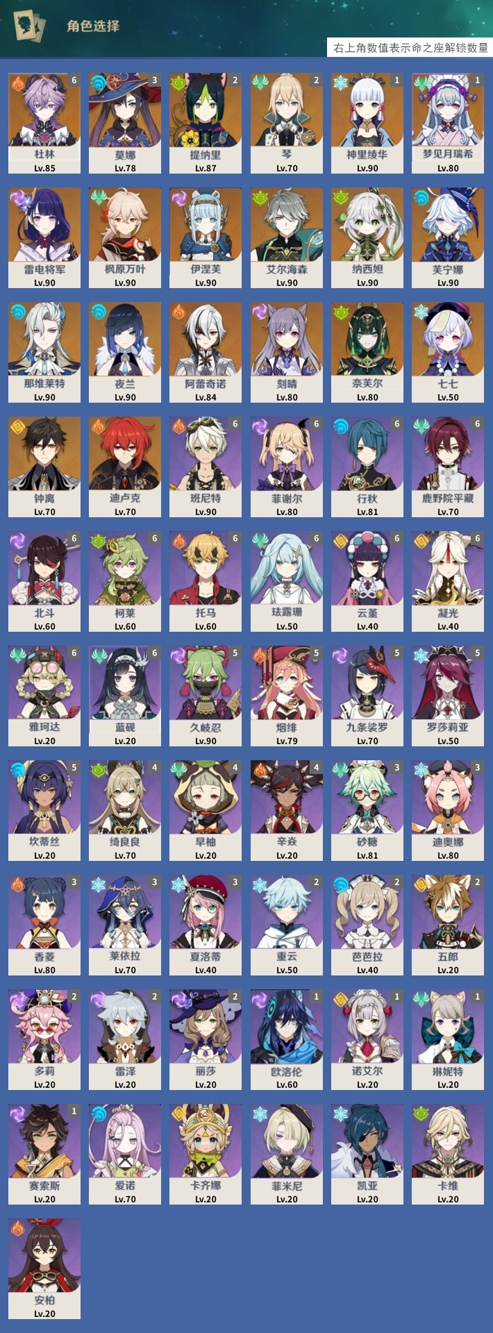 [14564523]48黄 风元素:0命枫原万叶 火元素:6命杜林 0命阿蕾奇诺 水元素:0命芙宁娜 0命那维莱特 0命夜兰 雷元素:0命雷电将军 0命伊涅芙 冰元素:1命神里绫华 岩元素:0命钟离 草元素:0命艾尔海森 0命纳西妲 0命奈芙尔 【常驻五星角色及命座】 风元素:2命琴 1命梦见月瑞希 火元素:0命迪卢克 水元素:3命莫娜 雷元素:0命刻晴 冰元素:0命七七 草元素:2命提纳里 单手剑:精1天空之刃 精1天空之刃 精1裁叶萃光 精1雾切之回光 精1风鹰剑 精1黑蚀 双手剑:精1狼的末路 长柄武器:精1息灾 精1贯虹之槊 精1赤月之形 法器:精1天空之卷 弓:精1若水 精1黎明破晓之史 【角色皮肤】 五星角色:神里绫华-花时来信 夜兰-静暇雅宴 四星角色:菲谢尔-极夜真梦 凝光-纱中幽兰 丽莎-叶隐芳名 行秋-雨化竹身 绮良良-倩影游侠