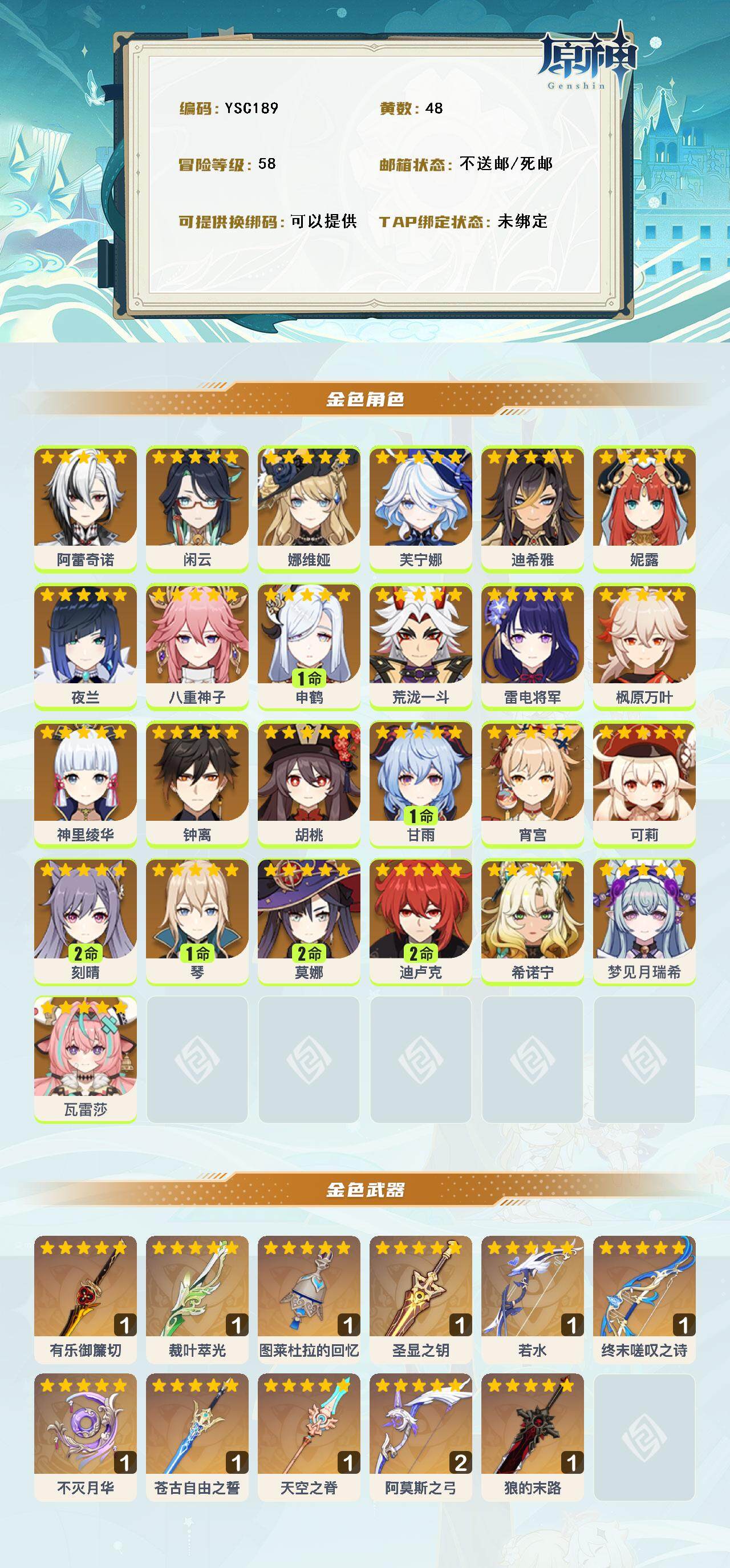 【ysc189】58级/48黄/女主/25个五星角色/13个五星武器/0命瓦雷莎/0命雷电将军/0命神里绫华/0命娜维娅/1命申鹤/1命甘雨/0命夜兰/0命宵宫/0命胡桃/0命妮露/0命可莉/2命刻晴/2命莫娜/0命希诺宁/0命阿蕾奇诺/2命迪卢克/0命钟离/0命枫原万叶/0命八重神子/0命芙宁娜/0命闲云/0命荒泷一斗/0命梦见月瑞希/1命琴/0命迪希雅/精2阿莫斯之弓/精1图莱杜拉的回忆/精1天空之脊/精1狼的末路/精1有乐御簾切/精1圣显之钥/精1若水/精1终末嗟叹之诗/精1裁叶萃光/精1苍古自由之誓/精1不灭月华