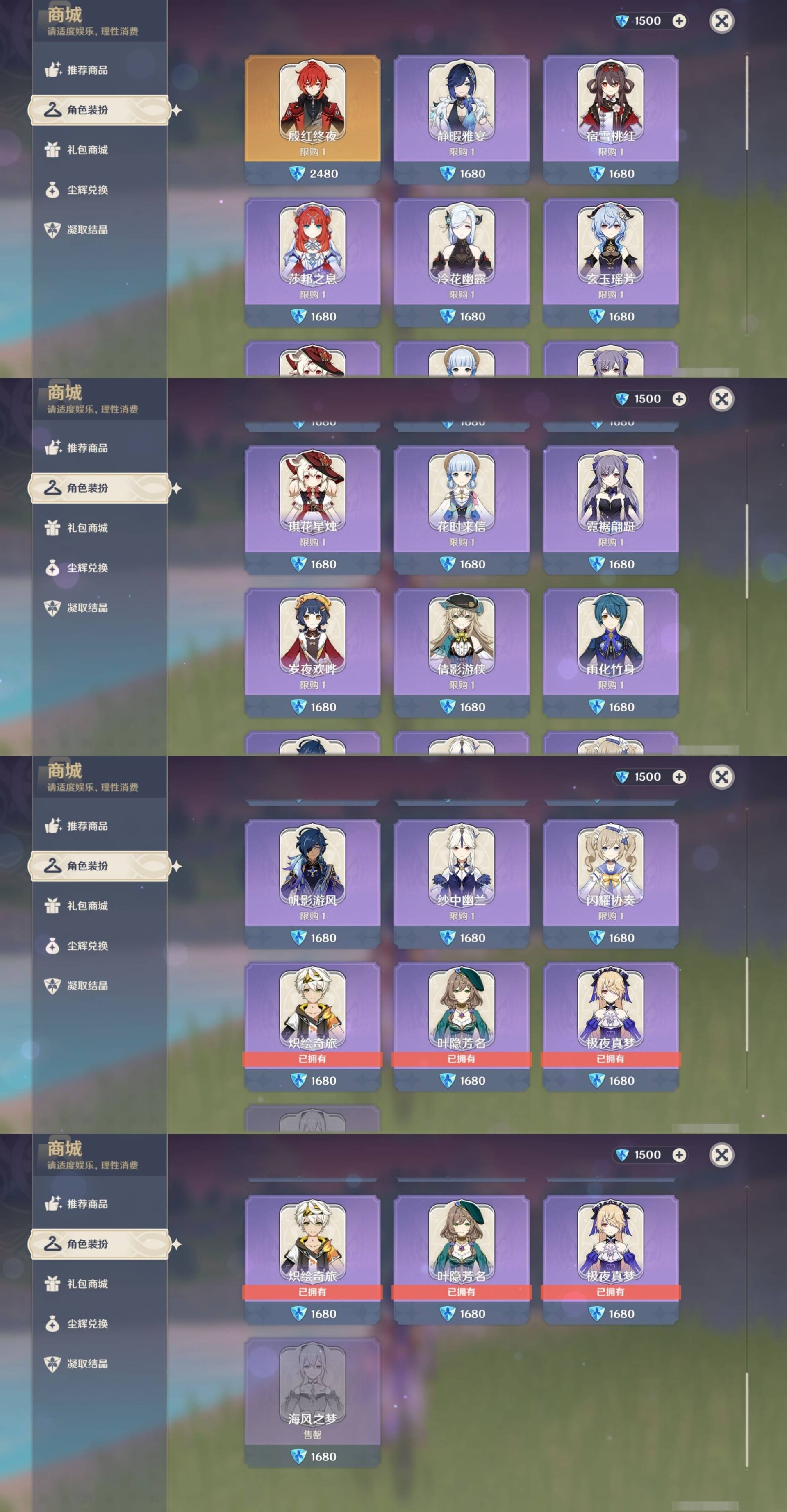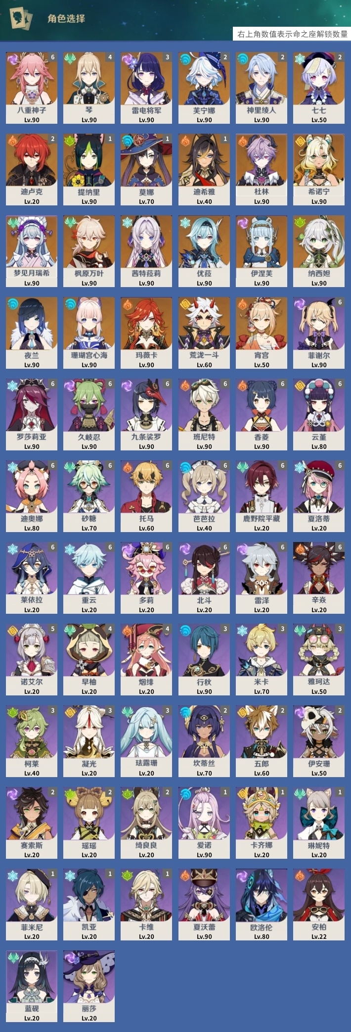 [14601380]70黄 风系:0命梦见月瑞希/0命枫原万叶/4命琴 火系:0命杜林/0命玛薇卡/0命宵宫/1命迪希雅/2命迪卢克 水系:2命芙宁娜/2命神里绫人/0命夜兰/0命珊瑚宫心海/1命莫娜 冰系:0命茜特菈莉/0命优菈/2命七七 岩系:0命希诺宁/0命荒泷一斗 雷系:3命雷电将军/0命伊涅芙/6命八重神子 草系:0命纳西妲/1命提纳里 [四星角色等级及命座] 风系: 6命砂糖/0命蓝砚/1命琳妮特/3命珐露珊/6命鹿野院平藏/4命早柚 火系: 0命夏沃蕾/6命班尼特/6命香菱/6命托马/0命安柏/4命烟绯/6命辛焱 水系:1命爱诺/3命行秋/2命坎蒂丝/6命芭芭拉 冰系:6命罗莎莉亚/6命迪奥娜/3命米卡/6命夏洛蒂/1命菲米尼/6命莱依拉/6命重云/1命凯亚 岩系:6命云堇/2命五郎/5命诺艾尔/3命凝光 雷系:6命菲谢尔/6命久岐忍/6命九条裟罗/0命欧洛伦/2命伊安珊/2命赛索斯/6命多莉/6命北斗/6命雷泽/0命丽莎 草系:3命柯莱/1命卡维/2命瑶瑶/2命绮良良