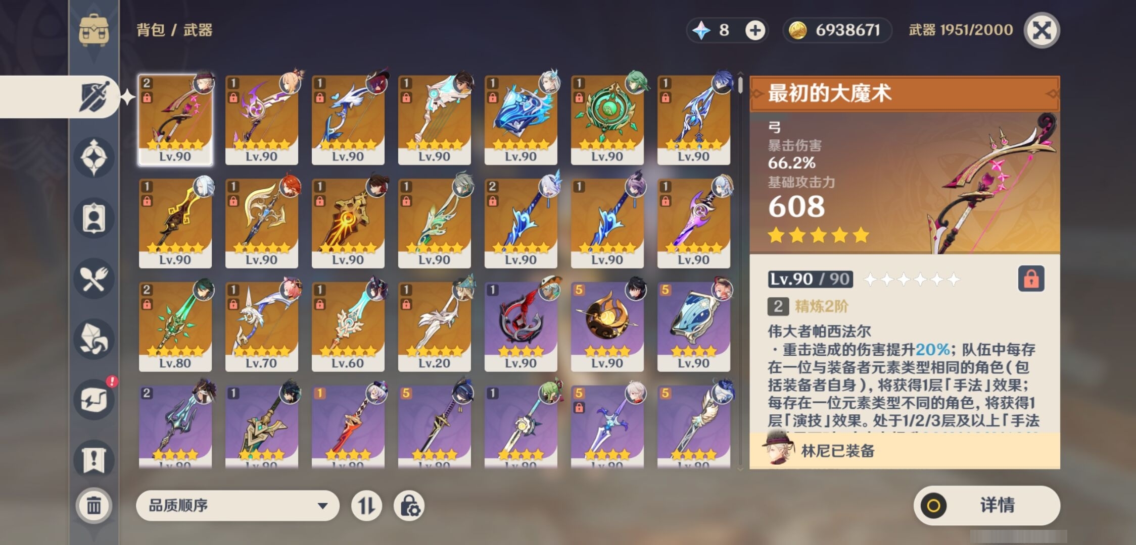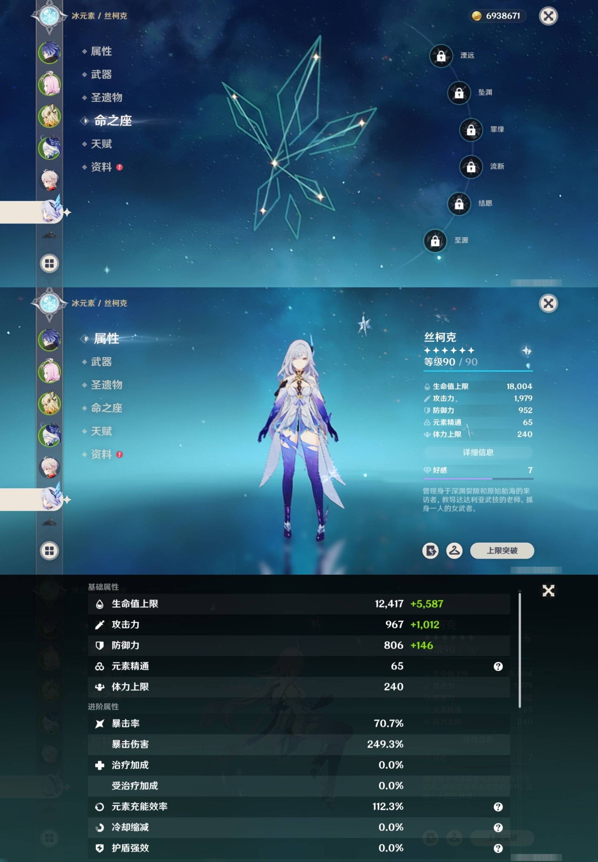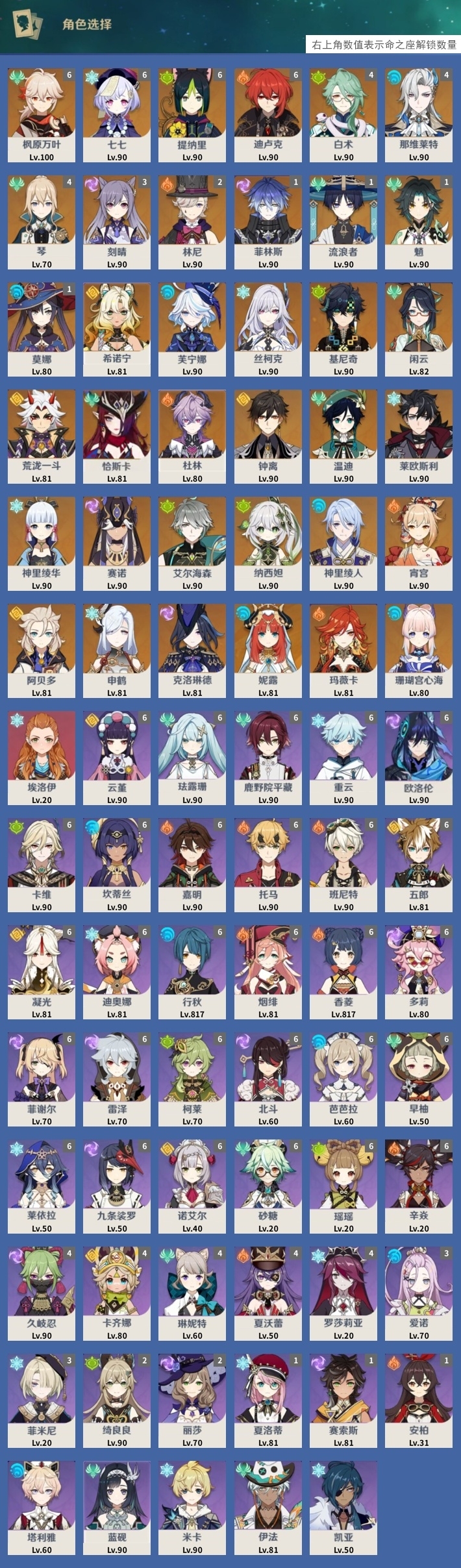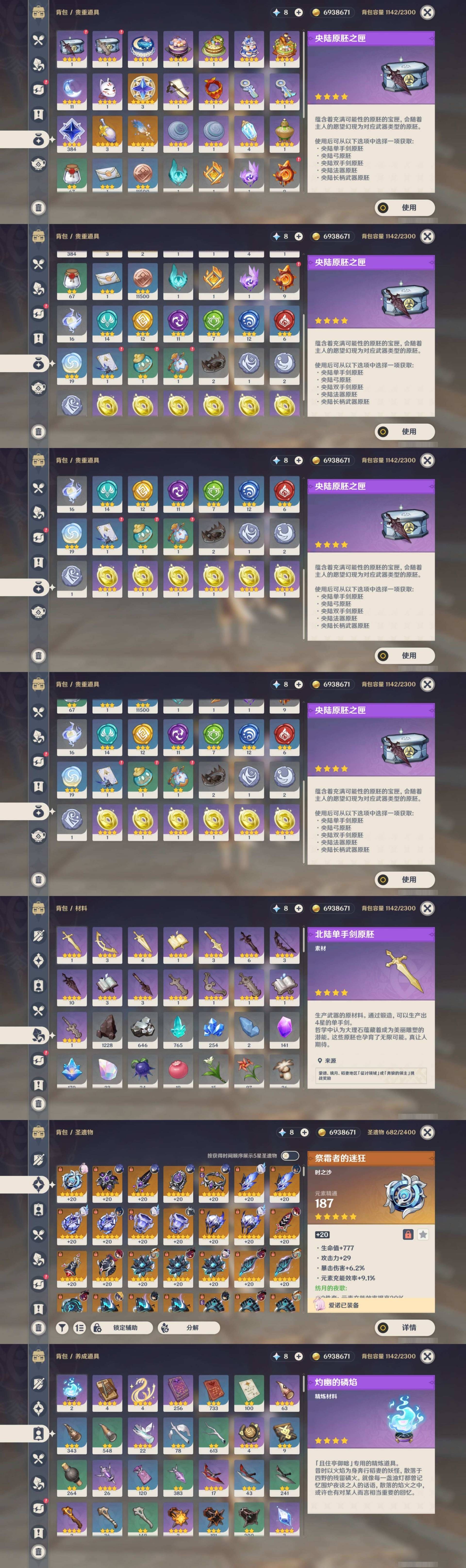 [14601879]102黄 风系:6命枫原万叶/0命闲云/0命恰斯卡/1命流浪者/1命魈/0命温迪/4命琴 火系:0命杜林/2命林尼/0命宵宫/6命迪卢克/0命玛薇卡 水系:0命芙宁娜/4命那维莱特/0命神里绫人/0命妮露/0命珊瑚宫心海/1命莫娜 冰系:0命丝柯克/0命莱欧斯利/6命七七/0命神里绫华/0命申鹤/0命埃洛伊 岩系:0命希诺宁/0命荒泷一斗/0命钟离/0命阿贝多 雷系:0命赛诺/3命刻晴/0命克洛琳德/1命菲林斯 草系:0命基尼奇/4命白术/0命艾尔海森/0命纳西妲/6命提纳里 [四星角色等级及命座] 风系: 0命蓝砚/6命珐露珊/6命鹿野院平藏/0命伊法/4命琳妮特/6命早柚/6命砂糖 火系: 6命嘉明/6命托马/6命班尼特/6命烟绯/6命香菱/4命夏沃蕾/1命安柏/6命辛焱 水系:0命塔利雅/6命坎蒂丝/6命行秋/6命芭芭拉/3命爱诺 冰系:0命米卡/6命重云/1命夏洛蒂/6命迪奥娜/6命莱依拉/0命凯亚/3命菲米尼/4命罗莎莉亚 岩系:6命云堇/6命五郎/6命凝光/6命诺艾尔 雷系:6命欧洛伦/4命久岐忍/1命赛索斯/6命多莉/6命菲谢尔/2命丽莎/6命雷泽/6命北斗/6命九条裟罗 草系:6命卡维/2命绮良良/6命柯莱/6命瑶瑶 [角色经验书] 紫色256/蓝色733/绿色100 [小物品] 脆弱树脂11/异梦溶媒4/嬗变之尘67 [特殊材料] 东风之翎3/东风之爪4/东风的吐息7/北风之尾2/北风之环2/北风的魂匣1/吞天之鲸·只角6 魔王之刃·残片7/武炼之魂·孤影8/龙王之冕6/血玉之枝6/鎏金之鳞12/智识之冕17