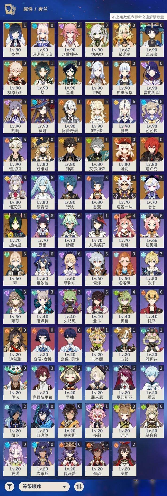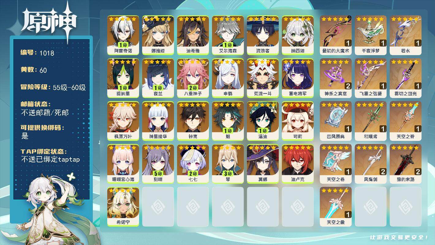 [14611450]60级/60黄/女主/25个五星角色/14个五星武器 1命阿蕾奇诺0命娜维娅0命迪希雅1命艾尔海森0命流浪者0命纳西妲1命提纳里1命夜兰2命八重神子0命申鹤0命荒泷一斗0命雷电将军0命枫原万叶0命神里绫华0命钟离1命魈1命温迪0命可莉0命珊瑚宫心海5命刻晴2命七七3命琴0命莫娜0命迪卢克0命希诺宁精1最初的大魔术精1千夜浮梦精1若水精2神乐之真意精1飞雷之弦振精1雾切之回光精1四风原典精1和璞鸢精1天空之脊精1天空之卷精2风鹰剑精2狼的末路精1天空之傲