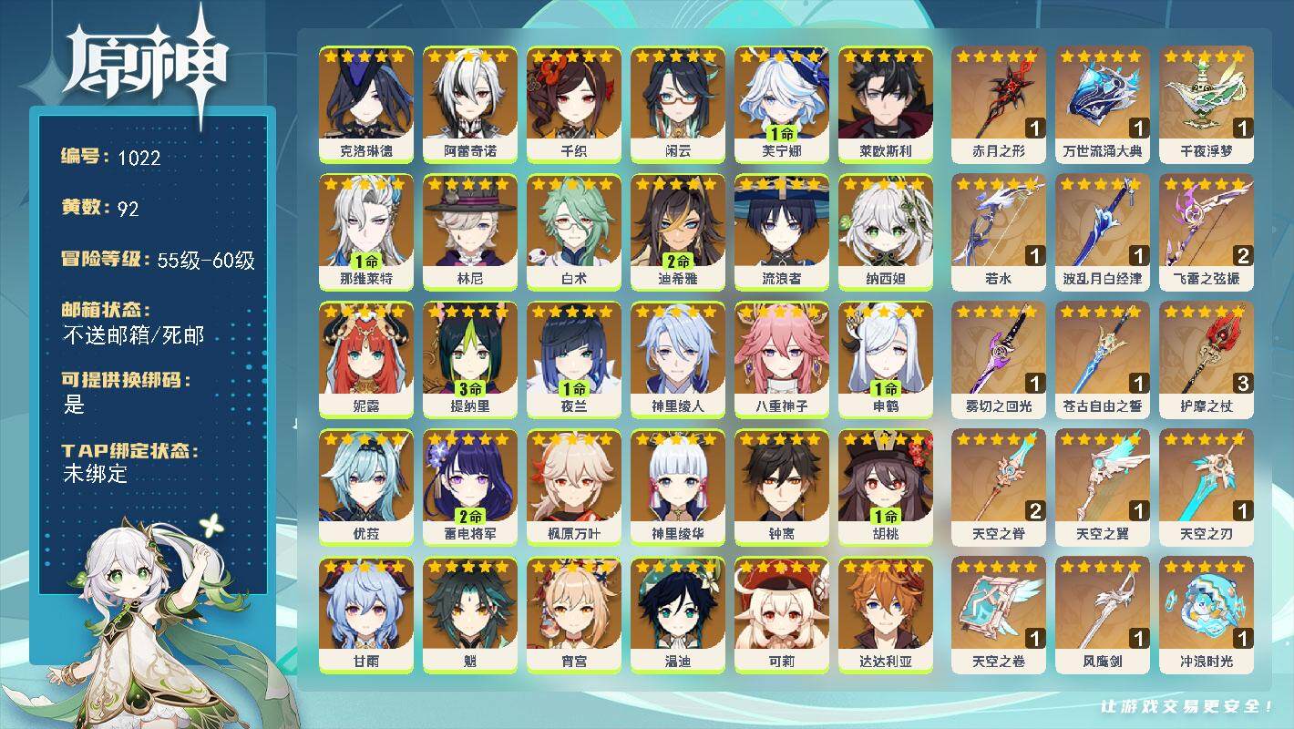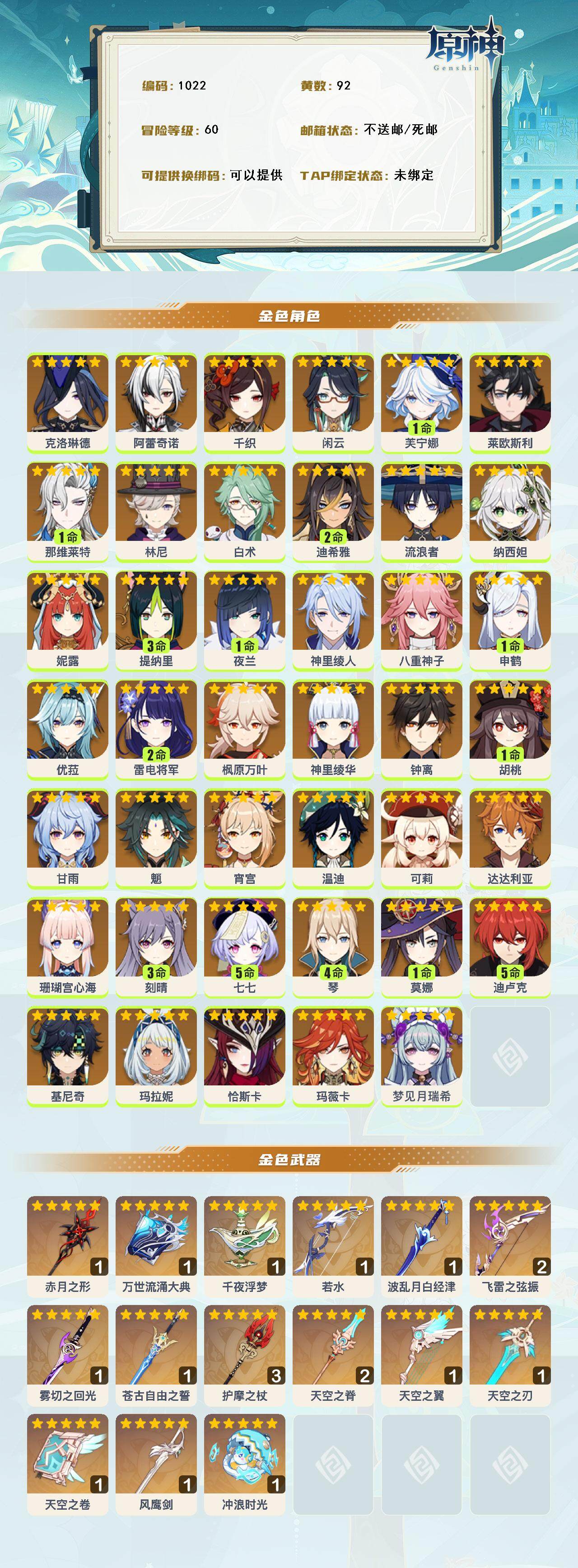 [14613176]60级/92黄/女主/41个五星角色/17个五星武器 0命克洛琳德0命阿蕾奇诺0命千织0命闲云1命芙宁娜0命莱欧斯利1命那维莱特0命林尼0命白术2命迪希雅0命流浪者0命纳西妲0命妮露3命提纳里1命夜兰0命神里绫人0命八重神子1命申鹤0命优菈2命雷电将军0命枫原万叶0命神里绫华0命钟离1命胡桃0命甘雨0命魈0命宵宫0命温迪0命可莉0命达达利亚0命珊瑚宫心海3命刻晴5命七七4命琴1命莫娜5命迪卢克0命基尼奇0命玛拉妮0命恰斯卡0命玛薇卡0命梦见月瑞希精1赤月之形精1万世流涌大典精1千夜浮梦精1若水精1波乱月白经津精2飞雷之弦振精1雾切之回光精1苍古自由之誓精3护摩之杖精2天空之脊精1天空之翼精1天空之刃精1天空之卷精1风鹰剑精1冲浪时光