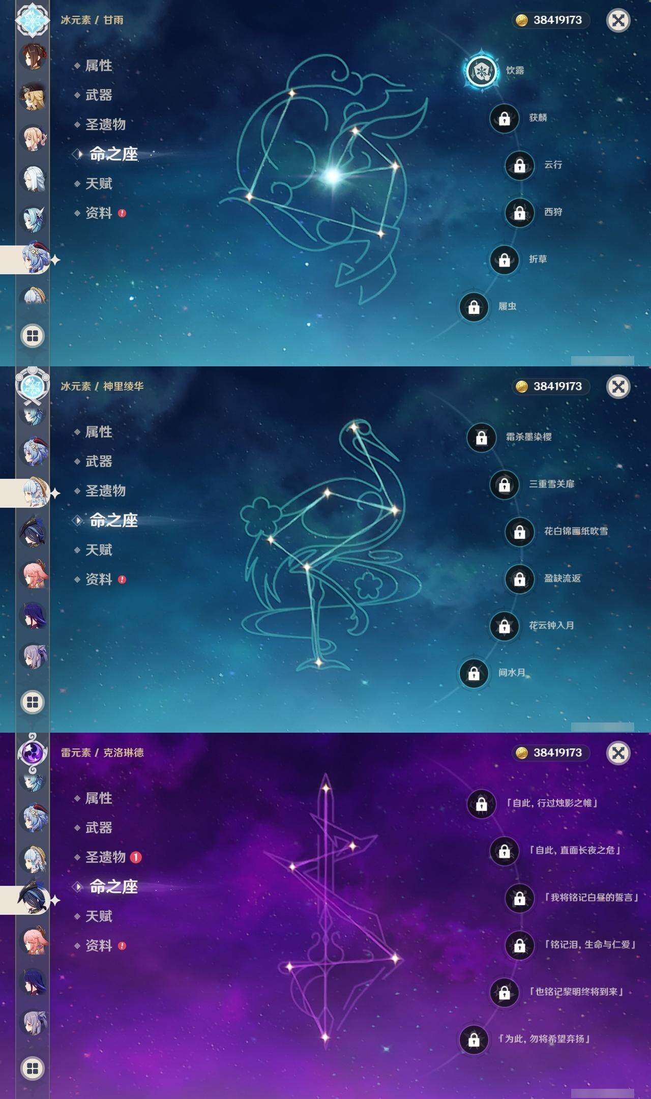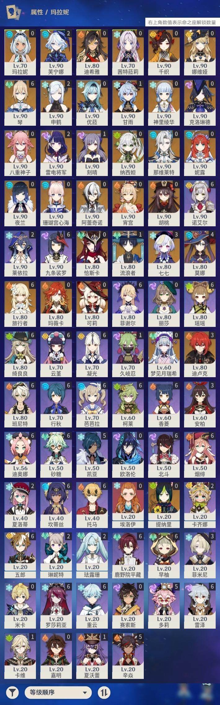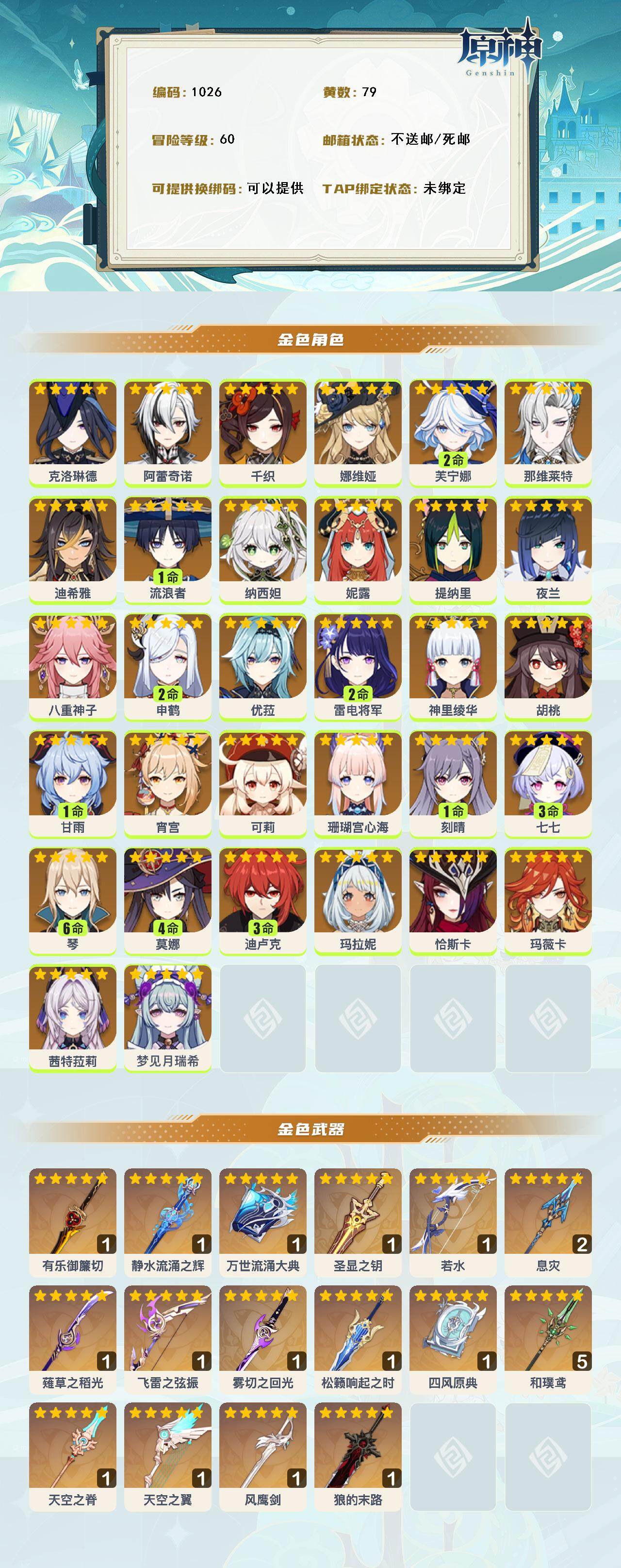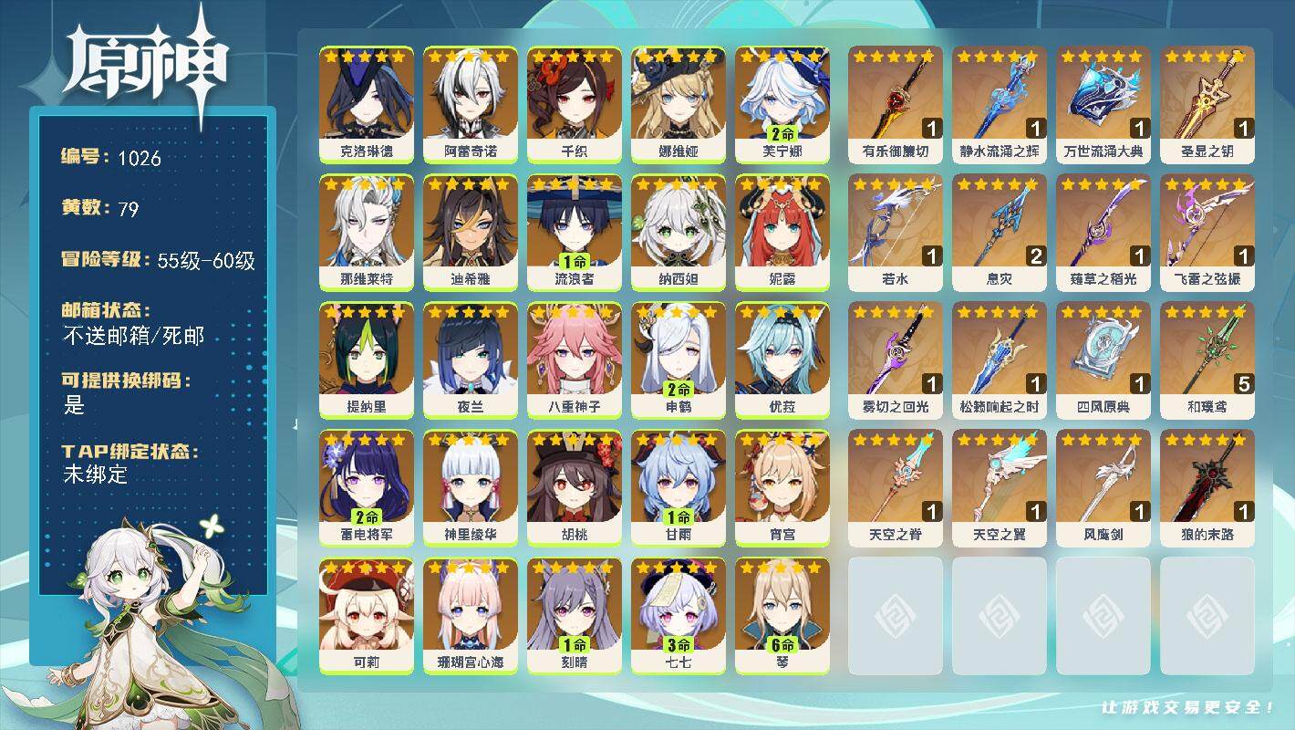 [14613443]60级/79黄/女主/32个五星角色/17个五星武器 0命克洛琳德0命阿蕾奇诺0命千织0命娜维娅2命芙宁娜0命那维莱特0命迪希雅1命流浪者0命纳西妲0命妮露0命提纳里0命夜兰0命八重神子2命申鹤0命优菈2命雷电将军0命神里绫华0命胡桃1命甘雨0命宵宫0命可莉0命珊瑚宫心海1命刻晴3命七七满命琴4命莫娜3命迪卢克0命玛拉妮0命恰斯卡0命玛薇卡0命茜特菈莉0命梦见月瑞希精1有乐御簾切精1静水流涌之辉精1万世流涌大典精1圣显之钥精1若水精2息灾精1薙草之稻光精1飞雷之弦振精1雾切之回光精1松籁响起之时精1四风原典精5和璞鸢精1天空之脊精1天空之翼精1风鹰剑精1狼的末路