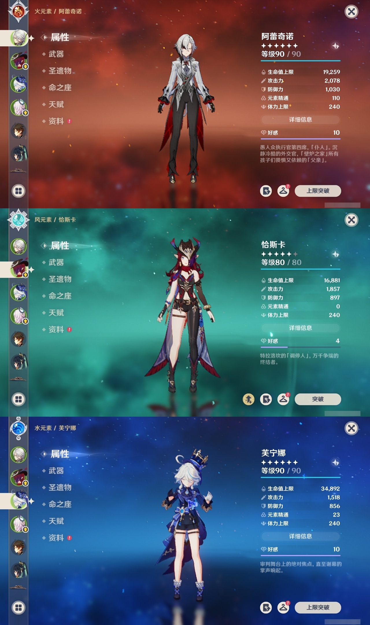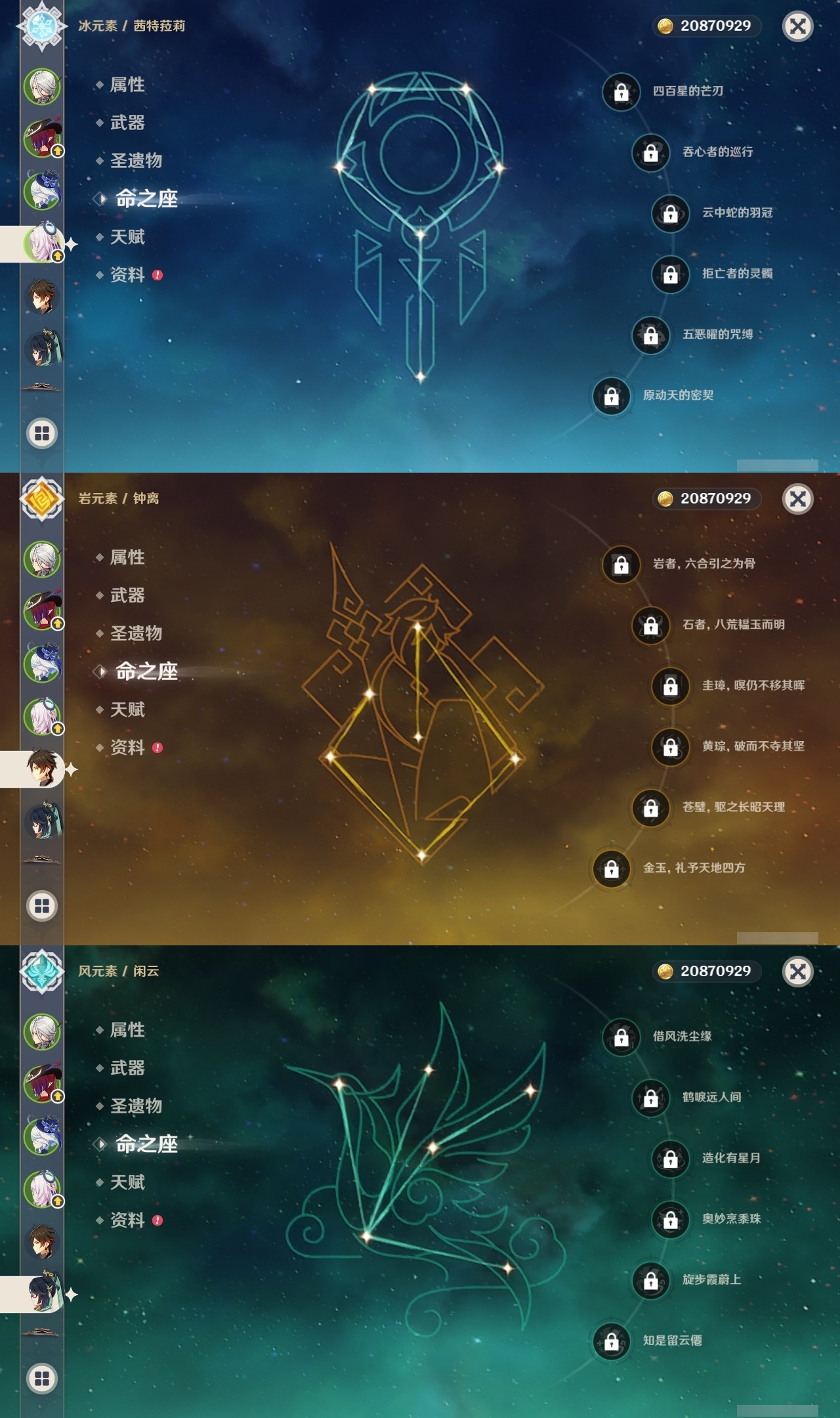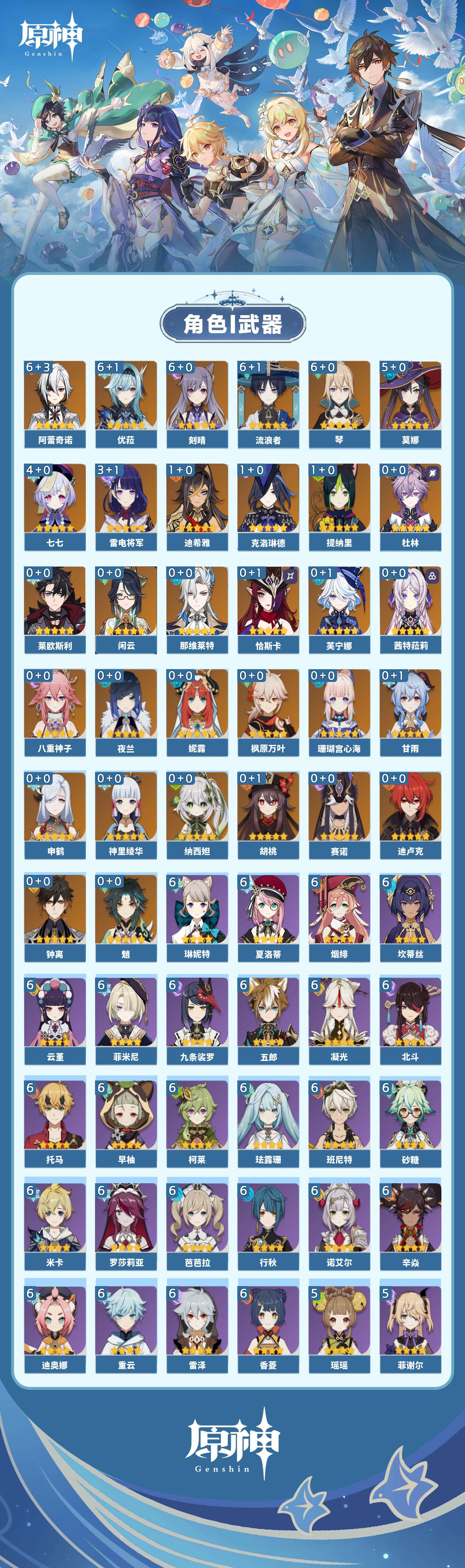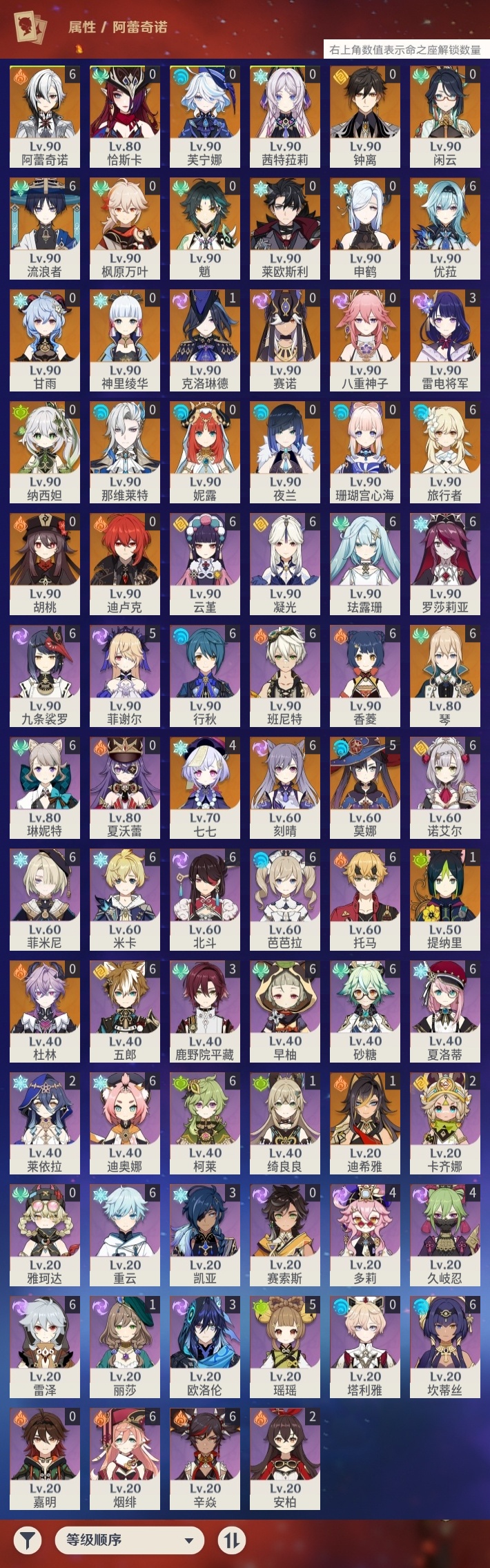 【原神】满命,冒险等级:60,五星数量:45,五星角色:阿蕾奇诺 6命刻晴 6命琴 6命优菈 6命流浪者 6命莫娜 5命七七 4命雷电将军 3命迪希雅 1命提纳里 1命克洛琳德 1命珊瑚宫心海神里绫华恰斯卡茜特菈莉钟离申鹤八重神子那维莱特莱欧斯利夜兰芙宁娜闲云赛诺妮露纳西妲杜林迪卢克枫原万叶甘雨魈胡桃__五星武器:赤月之形 3精风鹰剑 2精碧落之珑星鹫赤羽静水流涌之辉图莱杜拉的回忆阿莫斯之弓护摩之杖四风原典松籁响起之时天空之傲天空之刃薙草之稻光__四星角色:班尼特 6命行秋 6命九条裟罗 6命香菱 6命珐露珊 6命凝光 6命迪奥娜 6命砂糖 6命米卡 6命坎蒂丝 6命柯莱 6命芭芭拉 6命云堇 6命早柚 6命托马 6命五郎 6命烟绯 6命重云 6命辛焱 6命诺艾尔 6命罗莎莉亚 6命雷泽 6命北斗 6命菲米尼 6命琳妮特 6命夏洛蒂 6命瑶瑶 5命菲谢尔 5命久岐忍 4命多莉 4命鹿野院平藏 3命欧洛伦 3命卡齐娜 2命莱依拉 2命绮良良 1命夏沃蕾嘉明塔利雅赛索斯