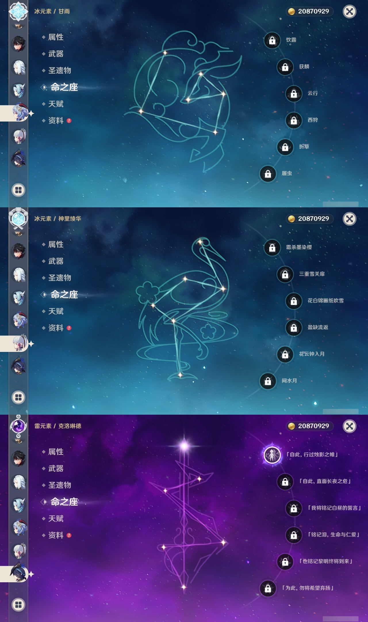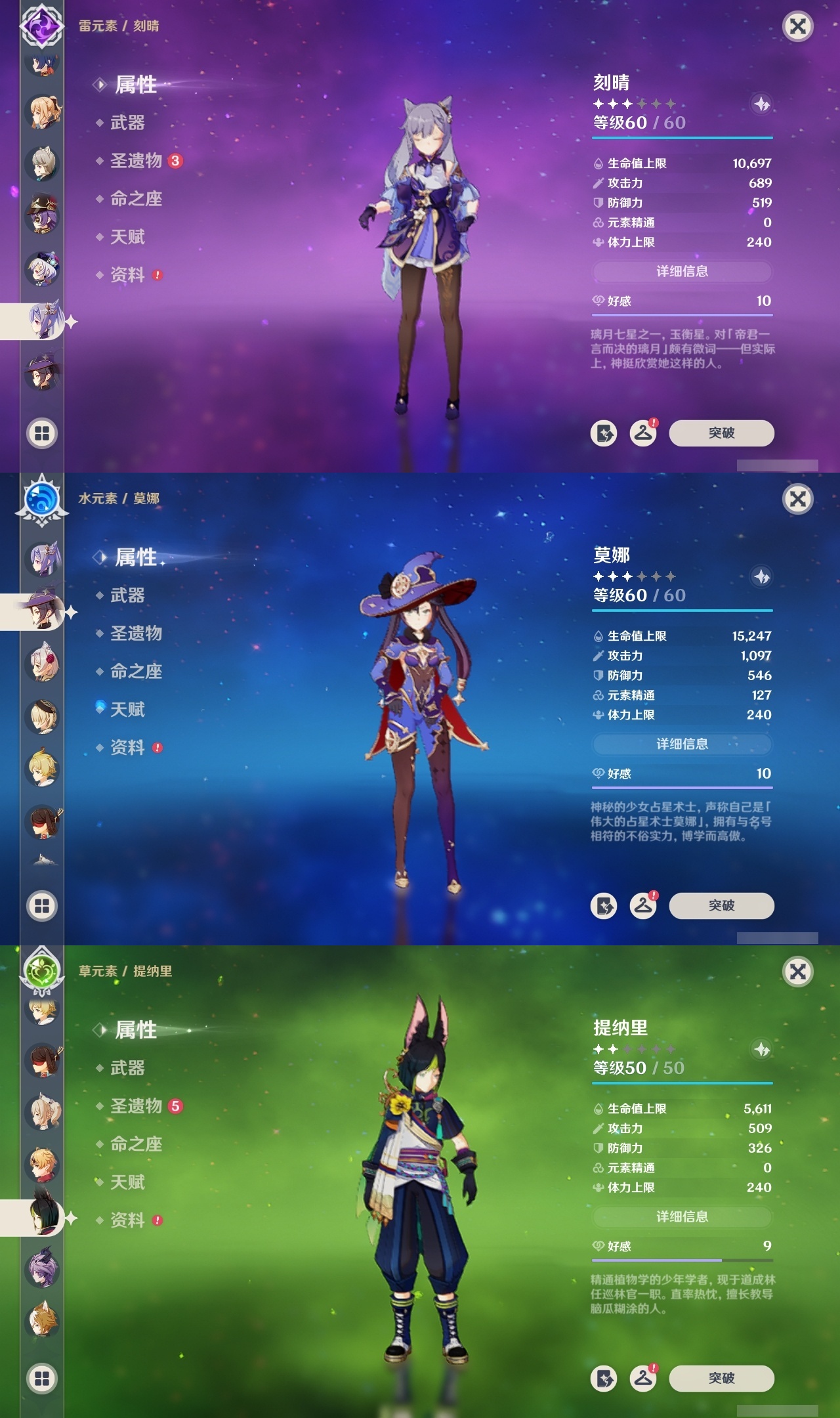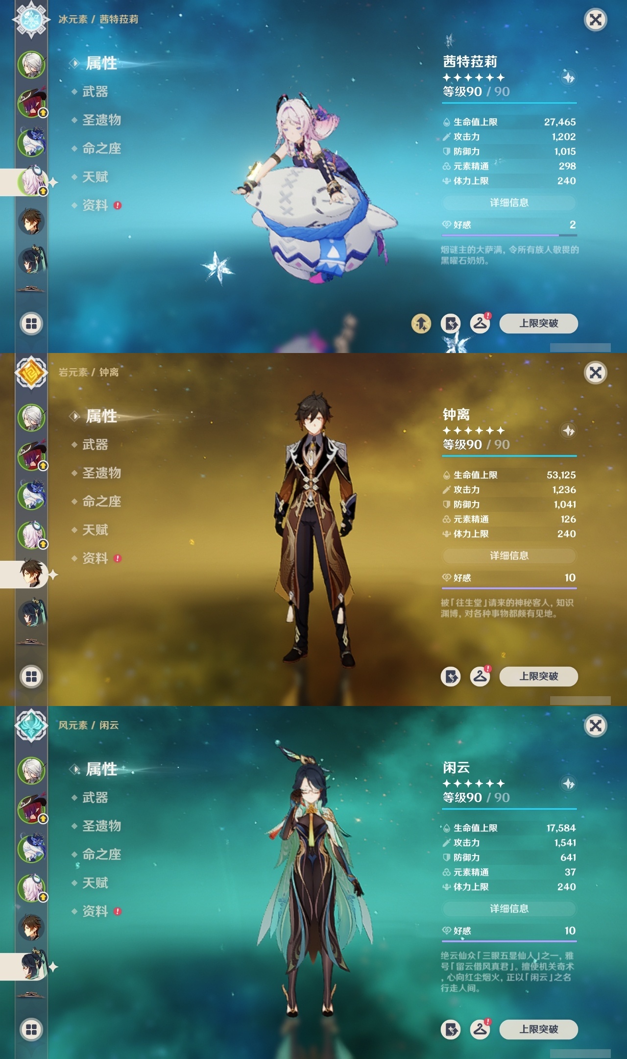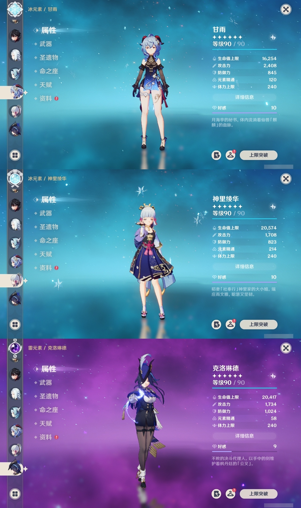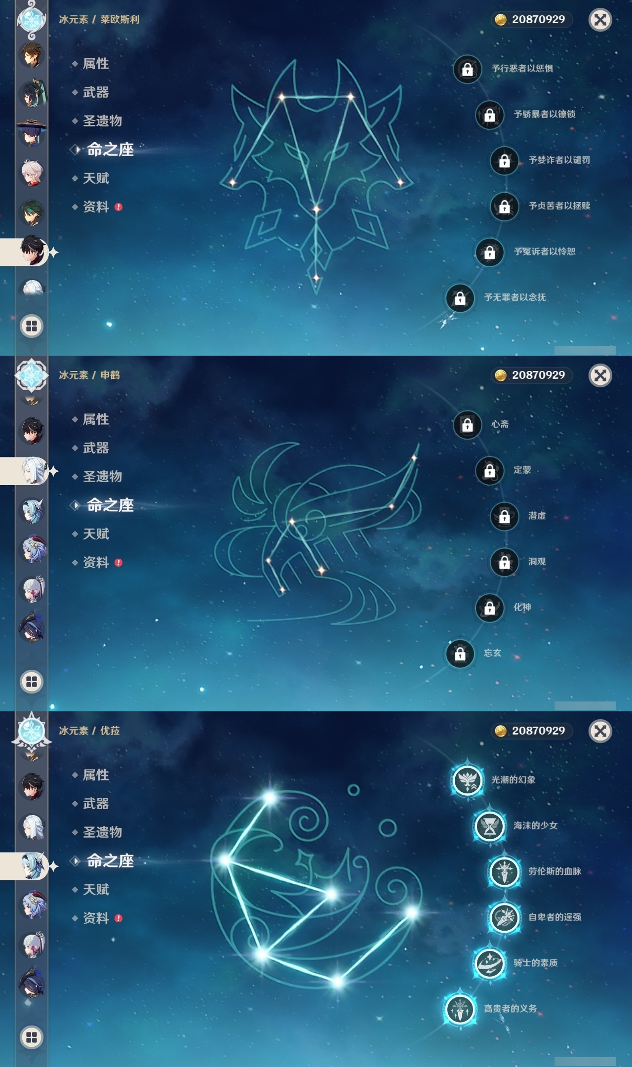 【原神】满命,冒险等级:60,五星数量:45,五星角色:阿蕾奇诺 6命刻晴 6命琴 6命优菈 6命流浪者 6命莫娜 5命七七 4命雷电将军 3命迪希雅 1命提纳里 1命克洛琳德 1命珊瑚宫心海神里绫华恰斯卡茜特菈莉钟离申鹤八重神子那维莱特莱欧斯利夜兰芙宁娜闲云赛诺妮露纳西妲杜林迪卢克枫原万叶甘雨魈胡桃__五星武器:赤月之形 3精风鹰剑 2精碧落之珑星鹫赤羽静水流涌之辉图莱杜拉的回忆阿莫斯之弓护摩之杖四风原典松籁响起之时天空之傲天空之刃薙草之稻光__四星角色:班尼特 6命行秋 6命九条裟罗 6命香菱 6命珐露珊 6命凝光 6命迪奥娜 6命砂糖 6命米卡 6命坎蒂丝 6命柯莱 6命芭芭拉 6命云堇 6命早柚 6命托马 6命五郎 6命烟绯 6命重云 6命辛焱 6命诺艾尔 6命罗莎莉亚 6命雷泽 6命北斗 6命菲米尼 6命琳妮特 6命夏洛蒂 6命瑶瑶 5命菲谢尔 5命久岐忍 4命多莉 4命鹿野院平藏 3命欧洛伦 3命卡齐娜 2命莱依拉 2命绮良良 1命夏沃蕾嘉明塔利雅赛索斯