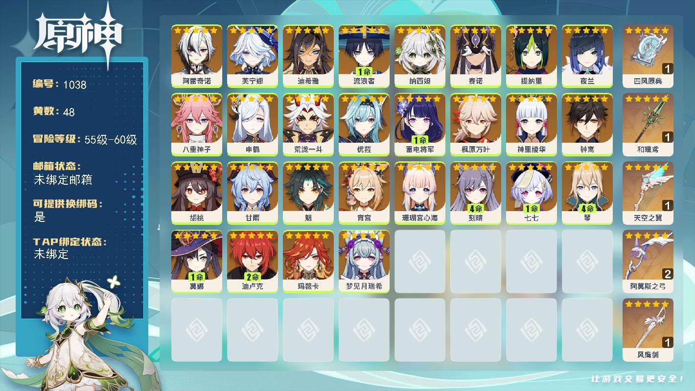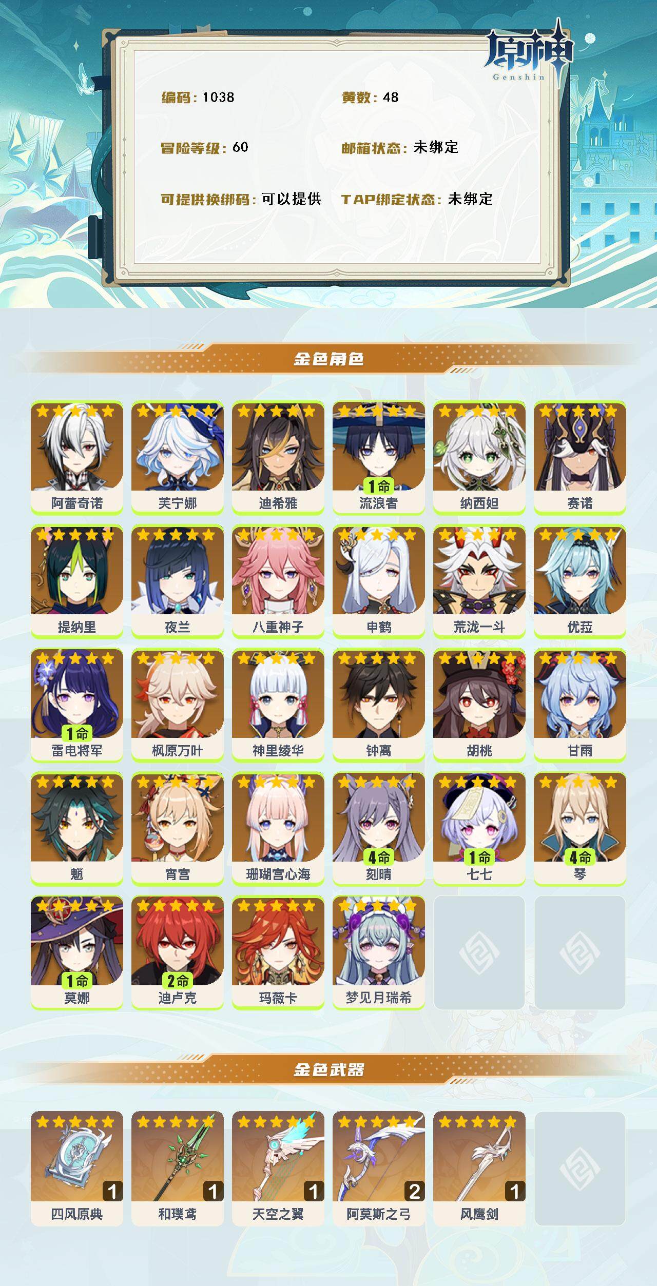 [14613866]60级/48黄/男主/28个五星角色/5个五星武器 0命阿蕾奇诺0命芙宁娜0命迪希雅1命流浪者0命纳西妲0命赛诺0命提纳里0命夜兰0命八重神子0命申鹤0命荒泷一斗0命优菈1命雷电将军0命枫原万叶0命神里绫华0命钟离0命胡桃0命甘雨0命魈0命宵宫0命珊瑚宫心海4命刻晴1命七七4命琴1命莫娜2命迪卢克0命玛薇卡0命梦见月瑞希精1四风原典精1和璞鸢精1天空之翼精2阿莫斯之弓精1风鹰剑