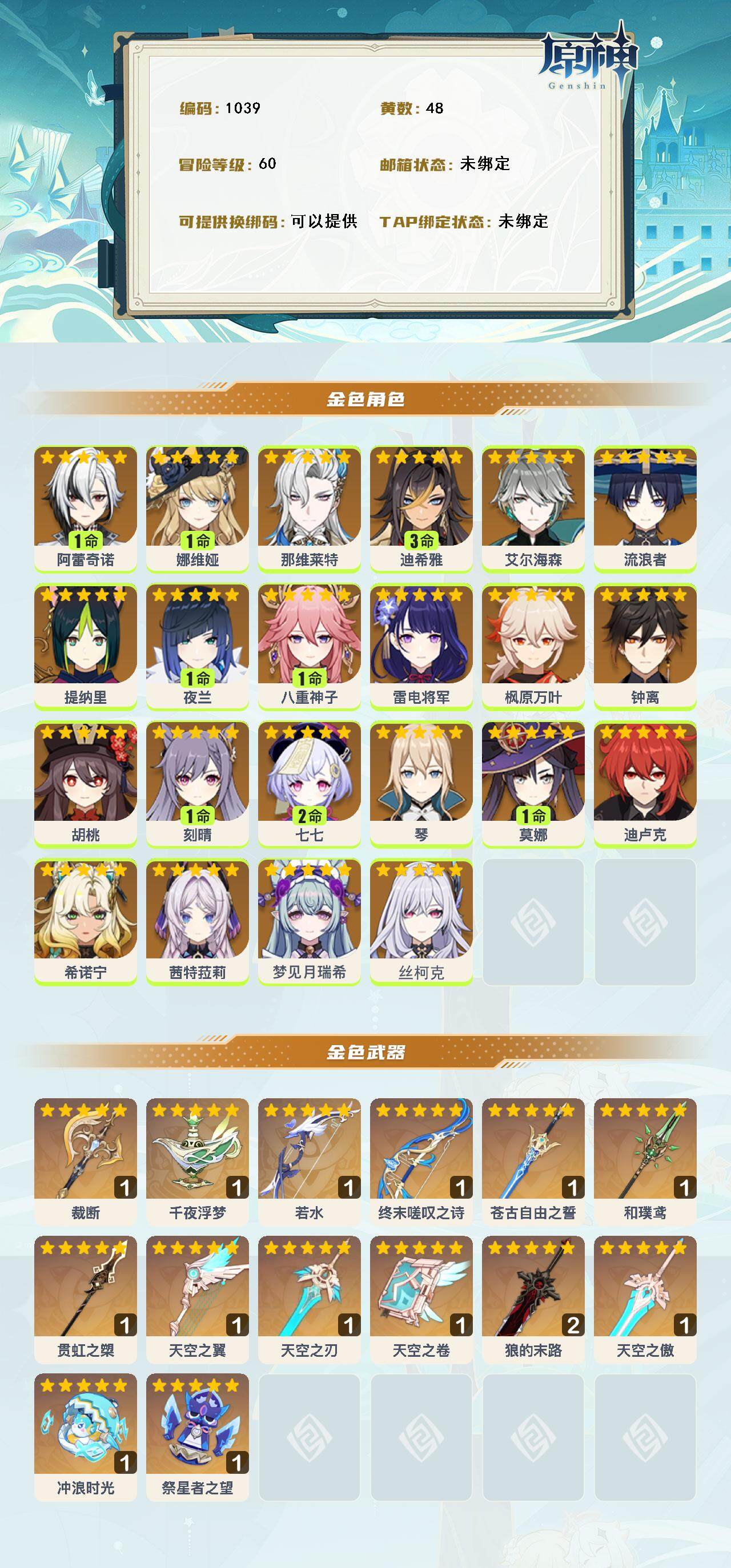 [14613932]60级/48黄/女主/22个五星角色/14个五星武器 1命阿蕾奇诺1命娜维娅0命那维莱特3命迪希雅0命艾尔海森0命流浪者0命提纳里1命夜兰1命八重神子0命雷电将军0命枫原万叶0命钟离0命胡桃1命刻晴2命七七0命琴1命莫娜0命迪卢克0命希诺宁0命茜特菈莉0命梦见月瑞希0命丝柯克精1裁断精1千夜浮梦精1若水精1终末嗟叹之诗精1苍古自由之誓精1和璞鸢精1贯虹之槊精1天空之翼精1天空之刃精1天空之卷精2狼的末路精1天空之傲精1冲浪时光精1祭星者之望