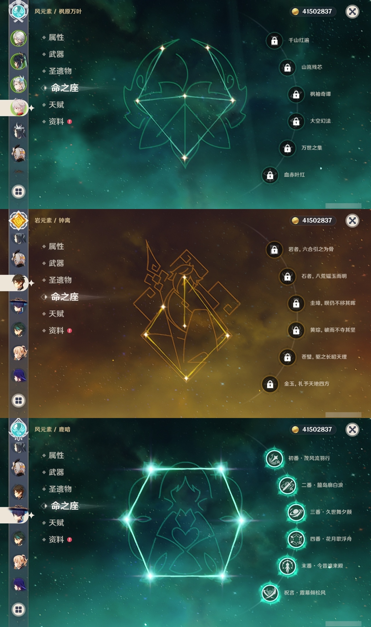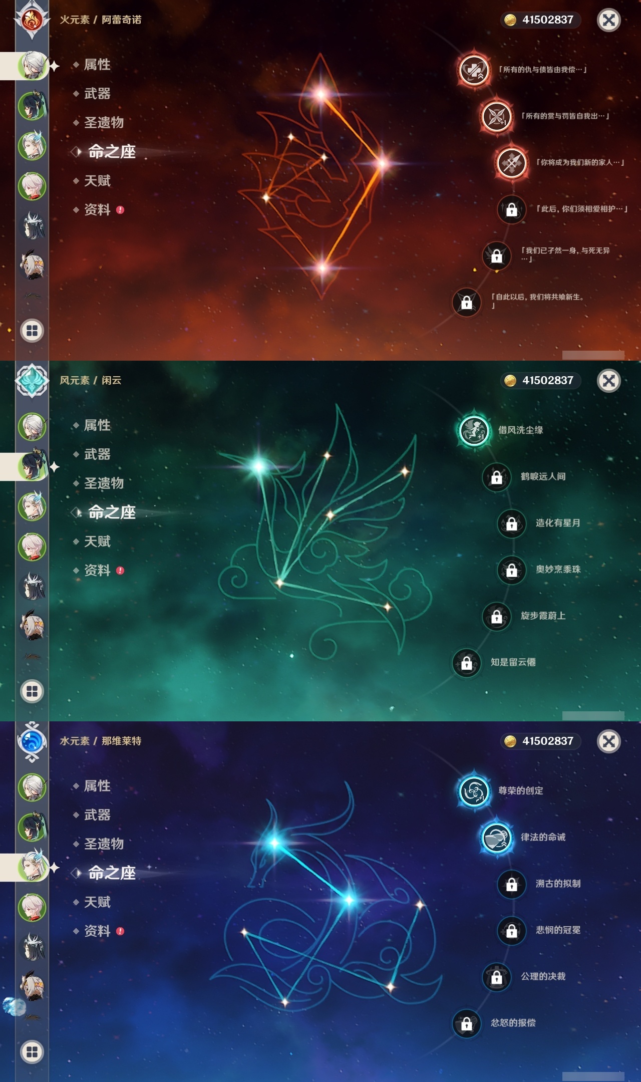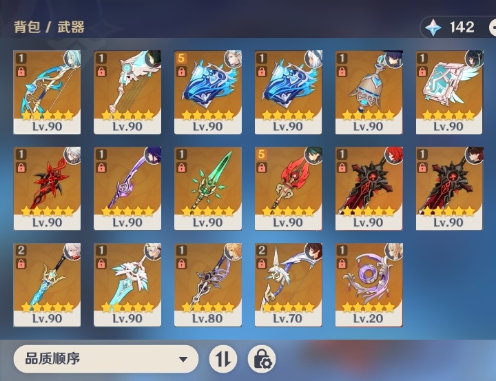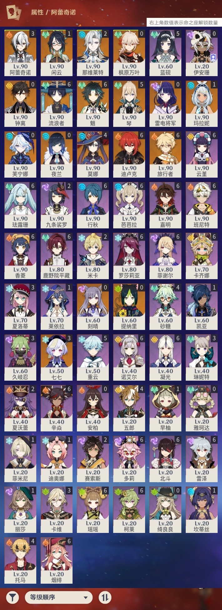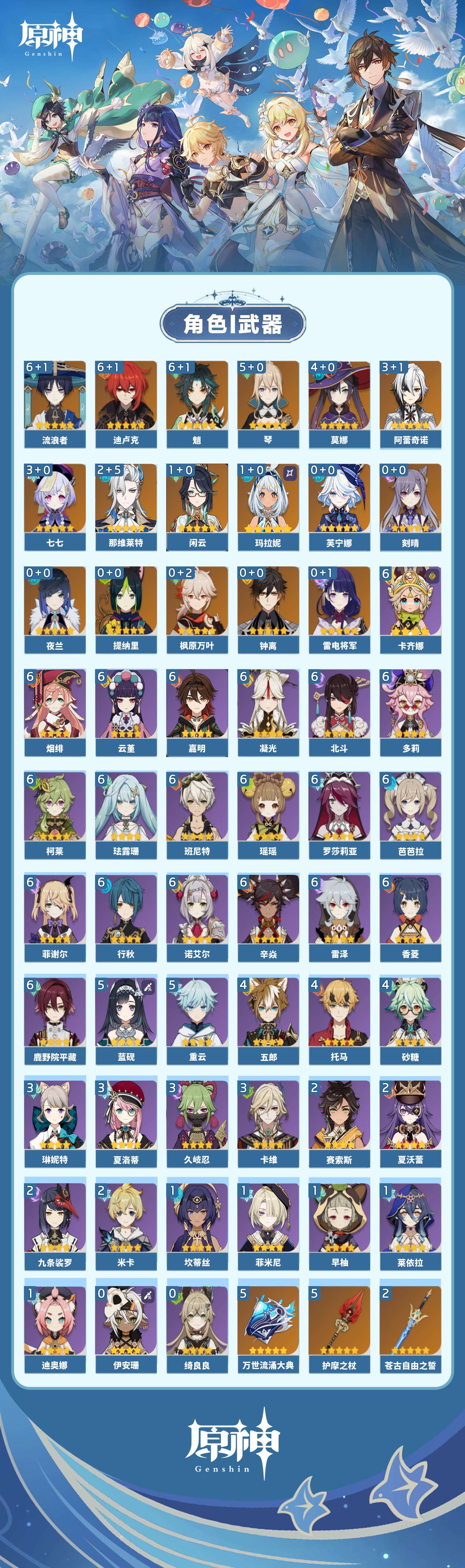 【原神】满命,冒险等级:60,五星数量:32,五星角色:迪卢克 6命魈 6命流浪者 6命琴 5命莫娜 4命阿蕾奇诺 3命七七 3命那维莱特 2命玛拉妮 1命闲云 1命钟离夜兰芙宁娜提纳里枫原万叶刻晴雷电将军__五星武器:万世流涌大典 5精护摩之杖 5精阿莫斯之弓 2精苍古自由之誓 2精赤月之形图莱杜拉的回忆不灭月华和璞鸢狼的末路天空之卷天空之刃天空之翼薙草之稻光终末嗟叹之诗赦罪__四星角色:卡齐娜 6命班尼特 6命行秋 6命香菱 6命鹿野院平藏 6命珐露珊 6命凝光 6命瑶瑶 6命多莉 6命柯莱 6命芭芭拉 6命云堇 6命烟绯 6命辛焱 6命诺艾尔 6命罗莎莉亚 6命雷泽 6命菲谢尔 6命北斗 6命嘉明 6命蓝砚 5命重云 5命砂糖 4命托马 4命五郎 4命久岐忍 3命卡维 3命琳妮特 3命夏洛蒂 3命九条裟罗 2命米卡 2命夏沃蕾 2命赛索斯 2命迪奥娜 1命莱依拉 1命坎蒂丝 1命早柚 1命菲米尼 1命绮良良伊安珊