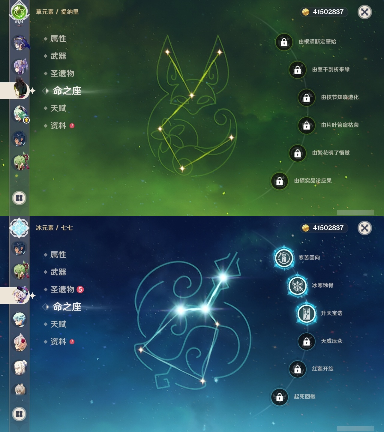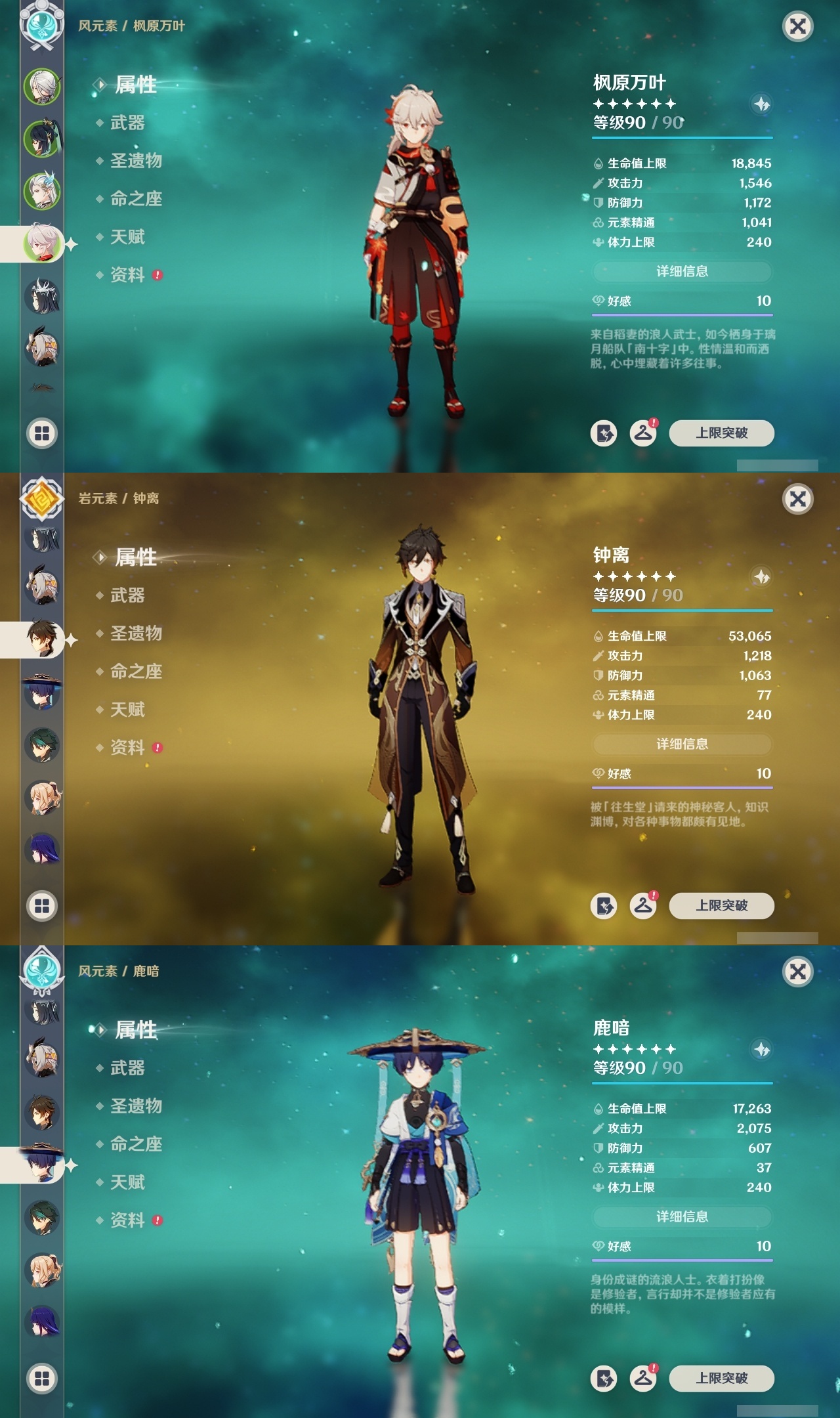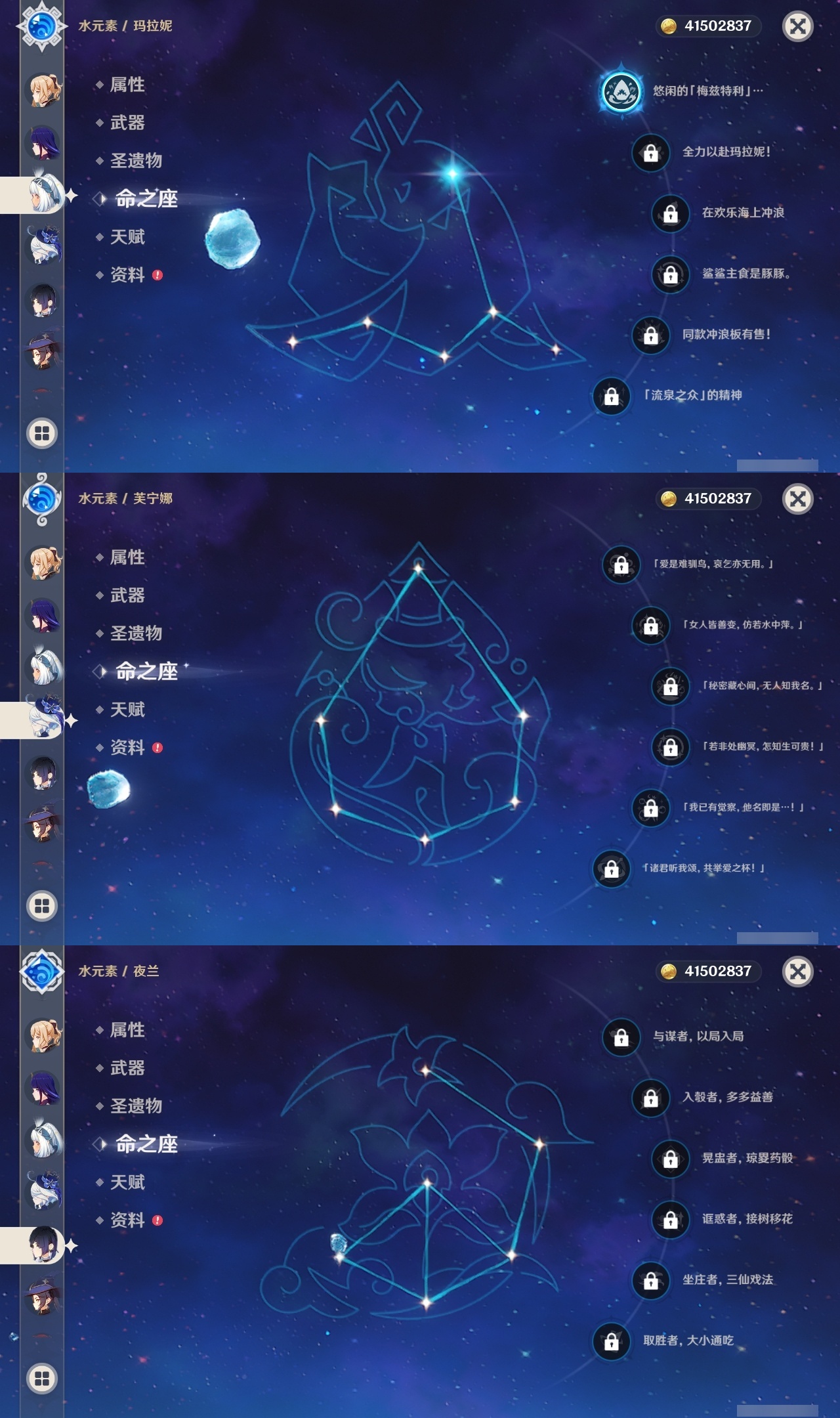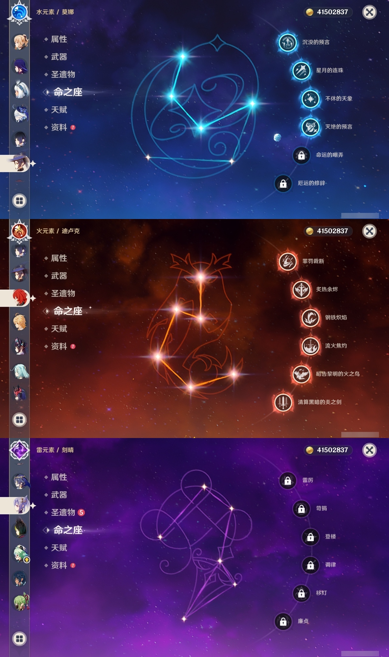 【原神】满命,冒险等级:60,五星数量:32,五星角色:迪卢克 6命魈 6命流浪者 6命琴 5命莫娜 4命阿蕾奇诺 3命七七 3命那维莱特 2命玛拉妮 1命闲云 1命钟离夜兰芙宁娜提纳里枫原万叶刻晴雷电将军__五星武器:万世流涌大典 5精护摩之杖 5精阿莫斯之弓 2精苍古自由之誓 2精赤月之形图莱杜拉的回忆不灭月华和璞鸢狼的末路天空之卷天空之刃天空之翼薙草之稻光终末嗟叹之诗赦罪__四星角色:卡齐娜 6命班尼特 6命行秋 6命香菱 6命鹿野院平藏 6命珐露珊 6命凝光 6命瑶瑶 6命多莉 6命柯莱 6命芭芭拉 6命云堇 6命烟绯 6命辛焱 6命诺艾尔 6命罗莎莉亚 6命雷泽 6命菲谢尔 6命北斗 6命嘉明 6命蓝砚 5命重云 5命砂糖 4命托马 4命五郎 4命久岐忍 3命卡维 3命琳妮特 3命夏洛蒂 3命九条裟罗 2命米卡 2命夏沃蕾 2命赛索斯 2命迪奥娜 1命莱依拉 1命坎蒂丝 1命早柚 1命菲米尼 1命绮良良伊安珊