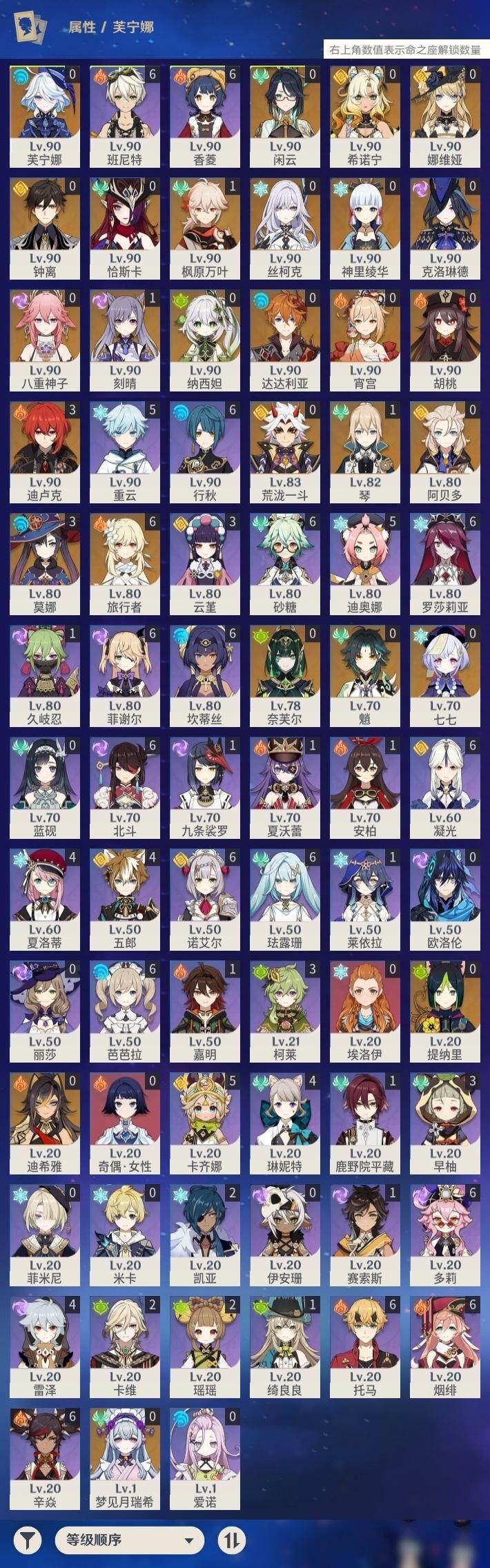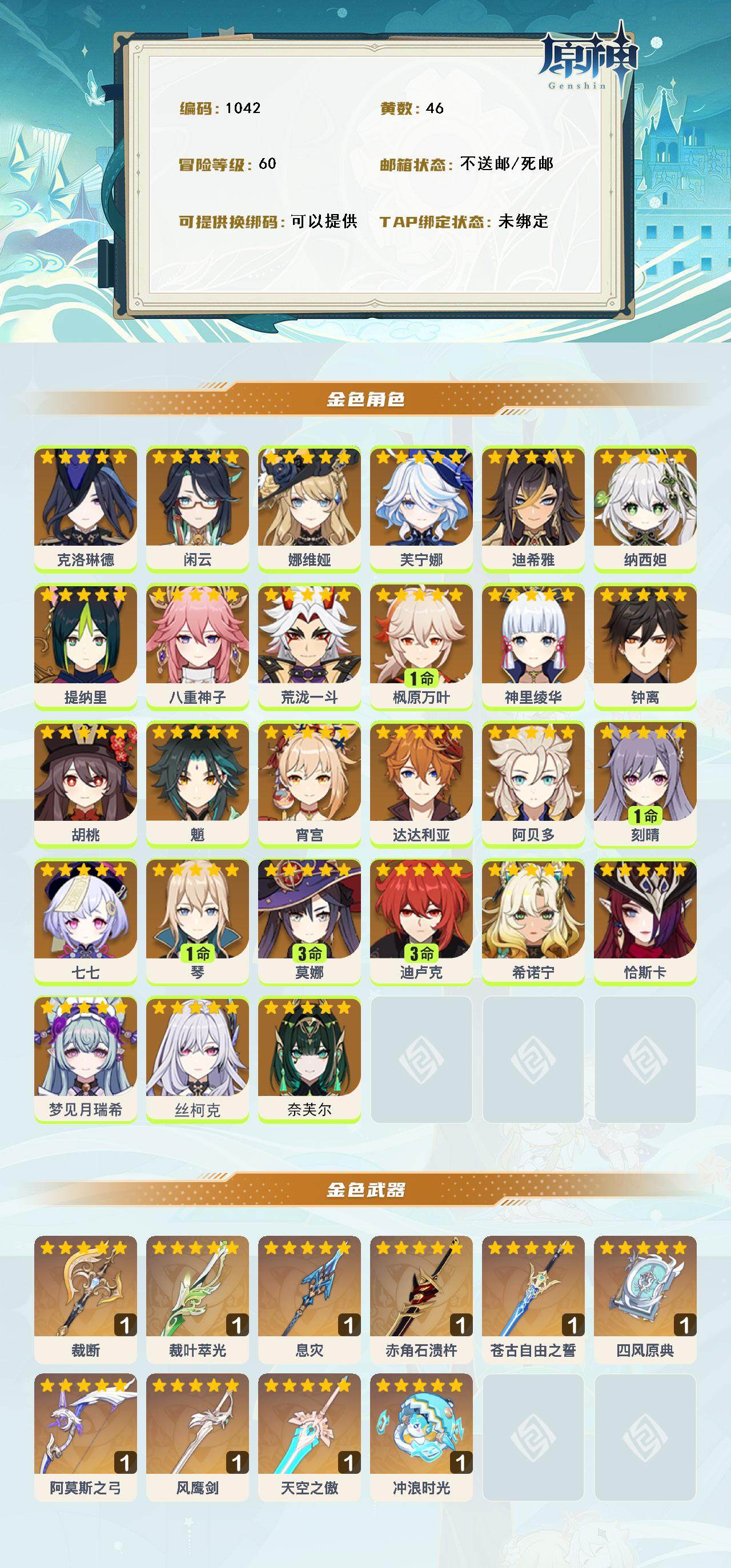 [14614083]60级/46黄/女主/27个五星角色/10个五星武器 0命克洛琳德0命闲云0命娜维娅0命芙宁娜0命迪希雅0命纳西妲0命提纳里0命八重神子0命荒泷一斗1命枫原万叶0命神里绫华0命钟离0命胡桃0命魈0命宵宫0命达达利亚0命阿贝多1命刻晴0命七七1命琴3命莫娜3命迪卢克0命希诺宁0命恰斯卡0命梦见月瑞希0命丝柯克0命奈芙尔精1裁断精1裁叶萃光精1息灾精1赤角石溃杵精1苍古自由之誓精1四风原典精1阿莫斯之弓精1风鹰剑精1天空之傲精1冲浪时光