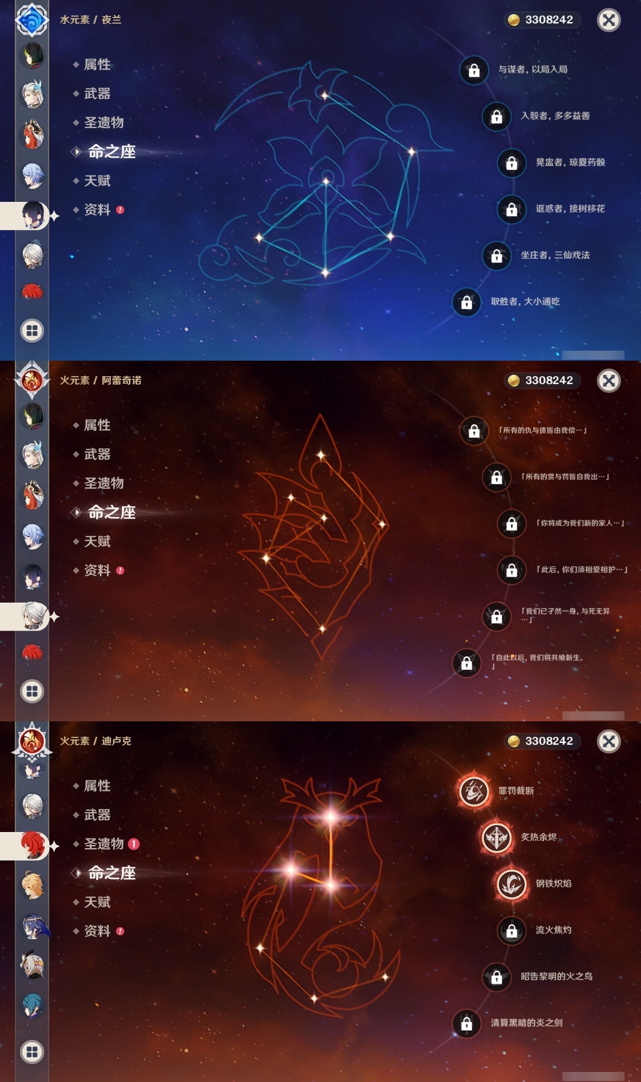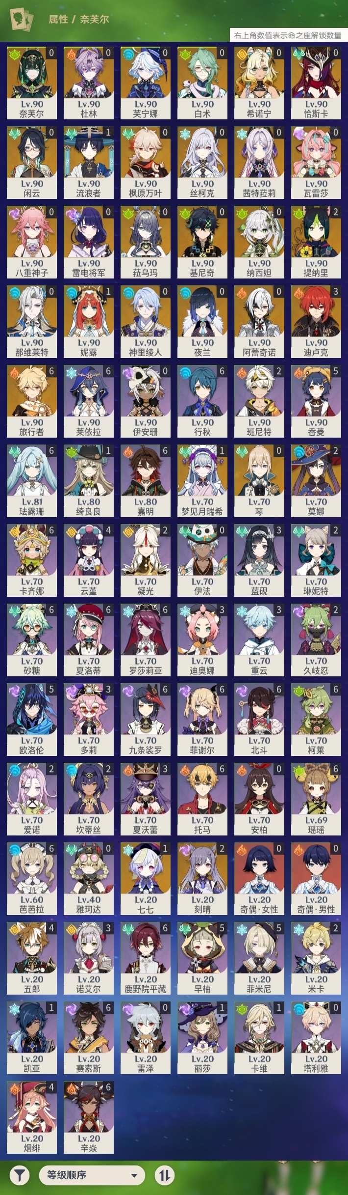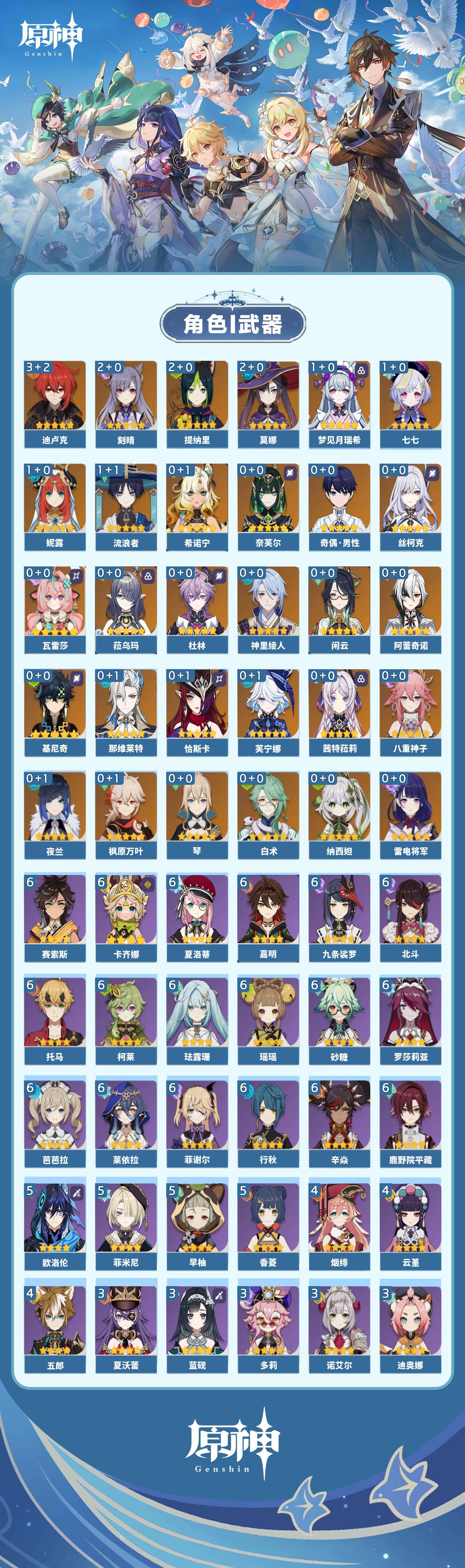 【原神】【lyys9268】冒险等级:60,五星数量:43,五星角色:迪卢克 3命刻晴 2命莫娜 2命提纳里 2命梦见月瑞希 1命七七 1命妮露 1命流浪者 1命琴基尼奇希诺宁白术恰斯卡茜特菈莉瓦雷莎八重神子神里绫人那维莱特夜兰芙宁娜闲云阿蕾奇诺丝柯克纳西妲菈乌玛奈芙尔杜林枫原万叶雷电将军__五星武器:狼的末路 2精岩峰巡歌星鹫赤羽万世流涌大典静水流涌之辉支离轮光图莱杜拉的回忆苍古自由之誓天空之卷天空之刃息灾若水__四星角色:卡齐娜 6命行秋 6命九条裟罗 6命鹿野院平藏 6命珐露珊 6命砂糖 6命瑶瑶 6命莱依拉 6命柯莱 6命芭芭拉 6命托马 6命辛焱 6命罗莎莉亚 6命菲谢尔 6命北斗 6命夏洛蒂 6命嘉明 6命赛索斯 6命香菱 5命欧洛伦 5命早柚 5命菲米尼 5命云堇 4命五郎 4命烟绯 4命迪奥娜 3命多莉 3命蓝砚 3命重云 3命诺艾尔 3命夏沃蕾 3命班尼特 2命久岐忍 2命凝光 2命米卡 2命坎蒂丝 2命琳妮特 2命爱诺 2命绮良良 1命卡维 1命奇偶·女性奇偶·男性雷泽伊法伊安珊塔利雅