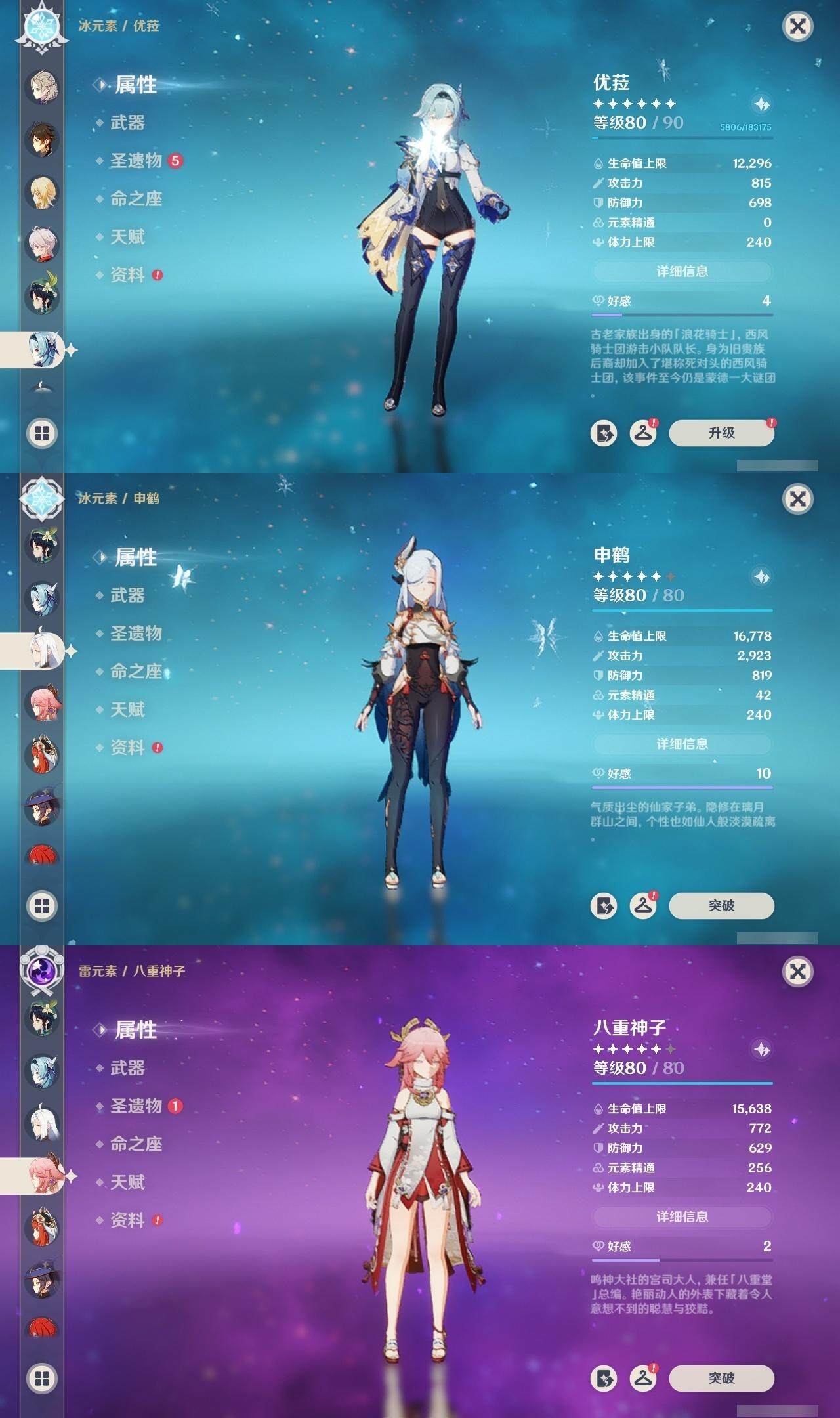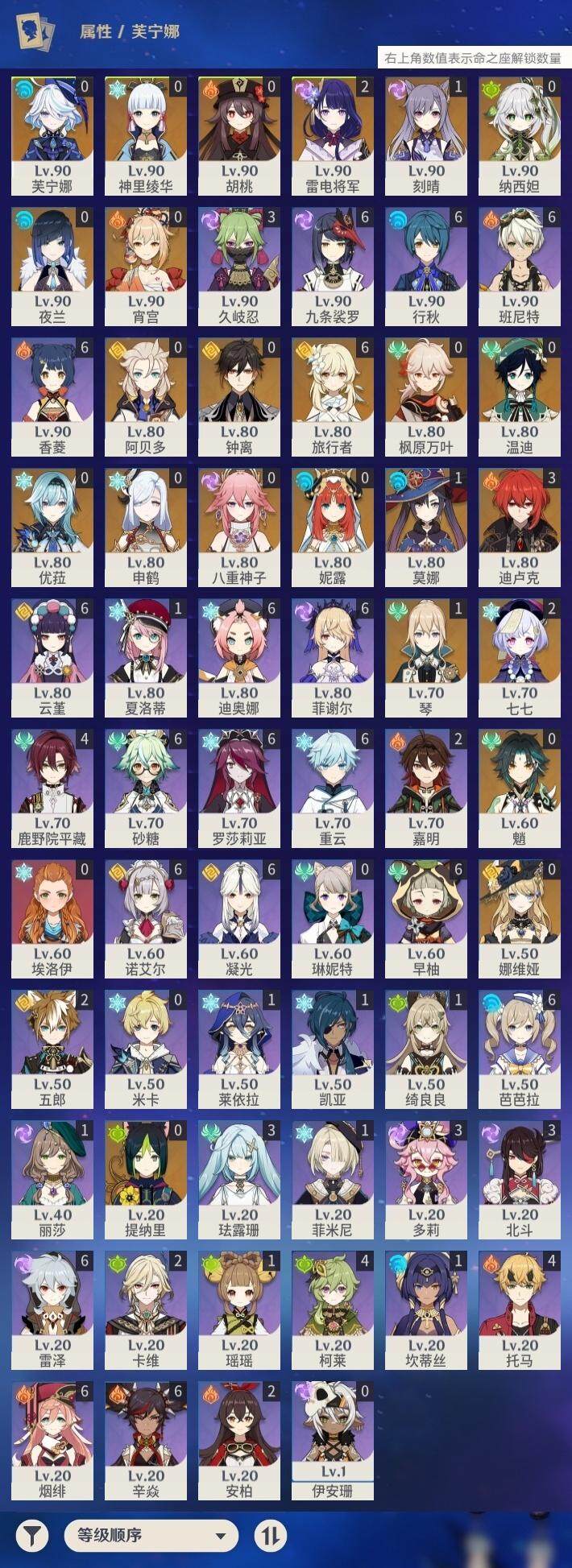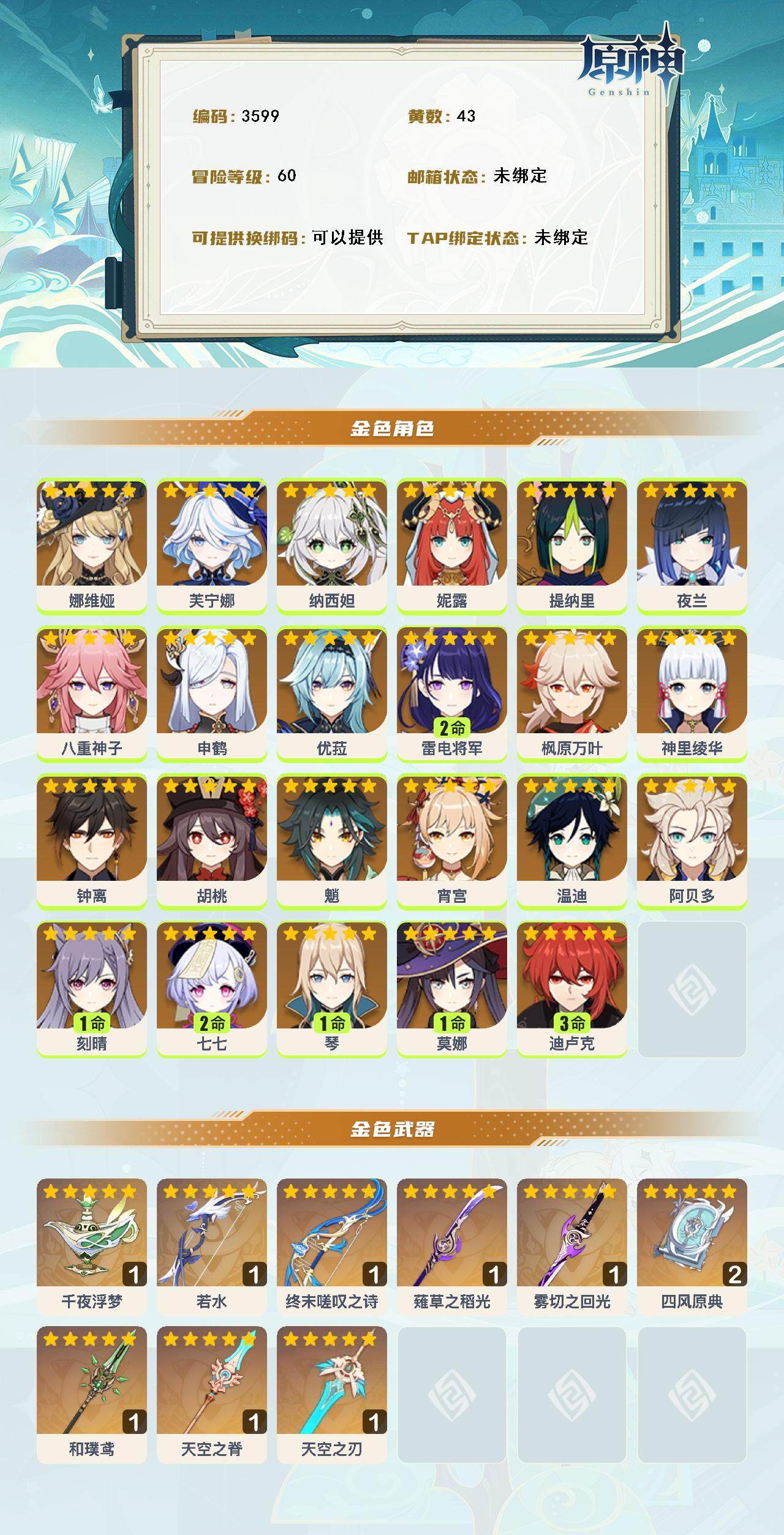 60级/43黄/女主/23个五星角色/9个五星武器 0命娜维娅0命芙宁娜0命纳西妲0命妮露0命提纳里0命夜兰0命八重神子0命申鹤0命优菈2命雷电将军0命枫原万叶0命神里绫华0命钟离0命胡桃0命魈0命宵宫0命温迪0命阿贝多1命刻晴2命七七1命琴1命莫娜3命迪卢克精1千夜浮梦精1若水精1终末嗟叹之诗精1薙草之稻光精1雾切之回光精2四风原典精1和璞鸢精1天空之脊精1天空之刃