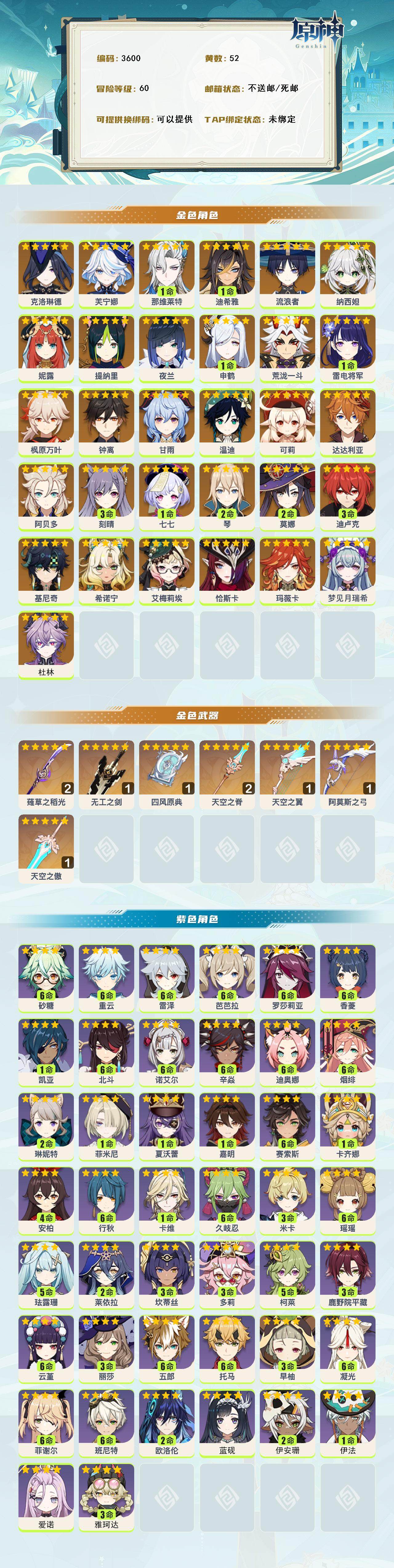 【金色角色】:杜林0命,梦见月瑞希0命,玛薇卡0命,恰斯卡0命,希诺宁0命,基尼奇0命,艾梅莉埃0命,克洛琳德0命,芙宁娜0命,那维莱特1命,迪希雅1命,流浪者0命,纳西妲0命,妮露0命,提纳里0命,夜兰0命,申鹤1命,荒泷一斗0命,雷电将军1命,枫原万叶0命,甘雨0命,阿贝多0命,钟离0命,达达利亚0命,可莉0命,温迪0命,琴2命,刻晴3命,迪卢克3命,莫娜2命,七七1命 【拥有武器】:薙草之稻光精2,无工之剑精1,天空之傲精1,四风原典精1,阿莫斯之弓精1,天空之脊精2,天空之翼精1 【紫色角色】:雅珂达3命,爱诺0命,伊法1命,伊安珊2命,蓝砚0命,欧洛伦2命,卡齐娜1命,赛索斯满命,嘉明0命,夏沃蕾0命,菲米尼1命,琳妮特2命,卡维0命,米卡3命,瑶瑶满命,珐露珊5命,莱依拉2命,坎蒂丝3命,多莉3命,柯莱5命,鹿野院平藏3命,久岐忍满命,云堇满命,五郎满命,托马满命,早柚3命,烟绯满命,罗莎莉亚满命,辛焱满命,迪奥娜满命,砂糖满命,雷泽满命,菲谢尔满命,丽莎3命,北斗满命,香菱满命,安柏4命,班尼特满命,行秋满命,芭芭拉满命,凝光满命,诺艾尔满命,凯亚0命,重云满命