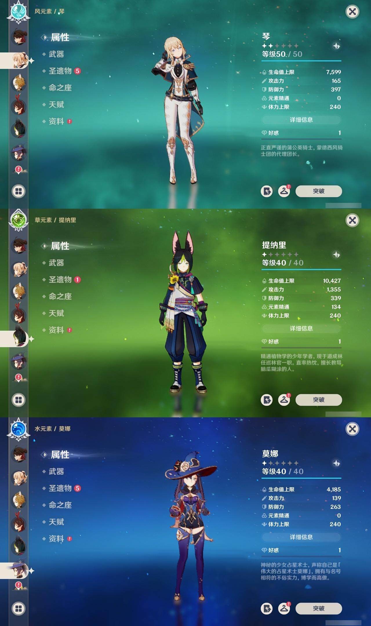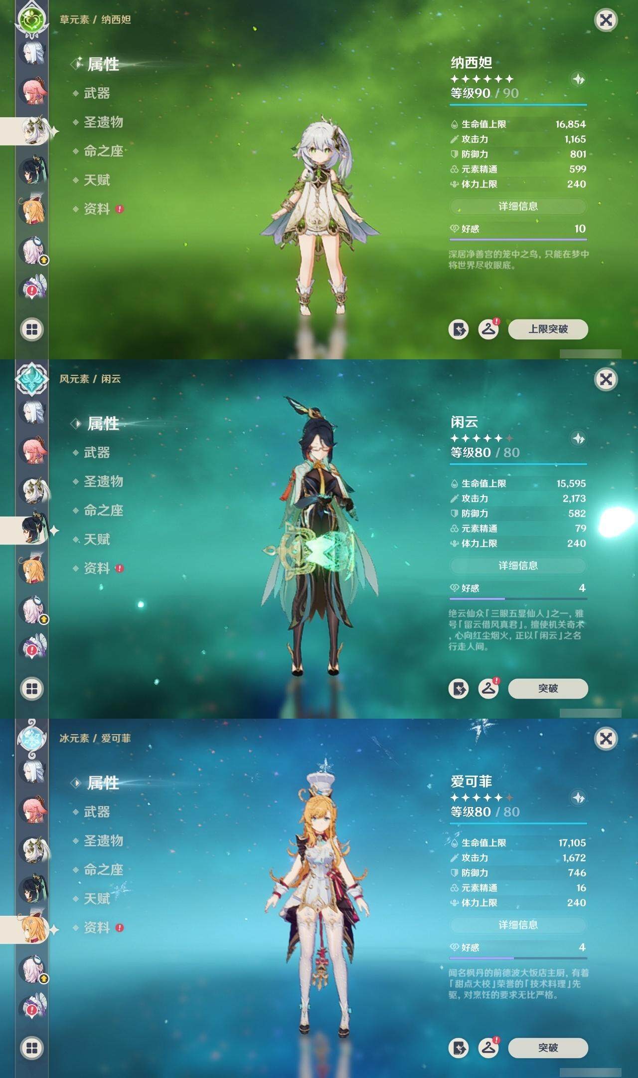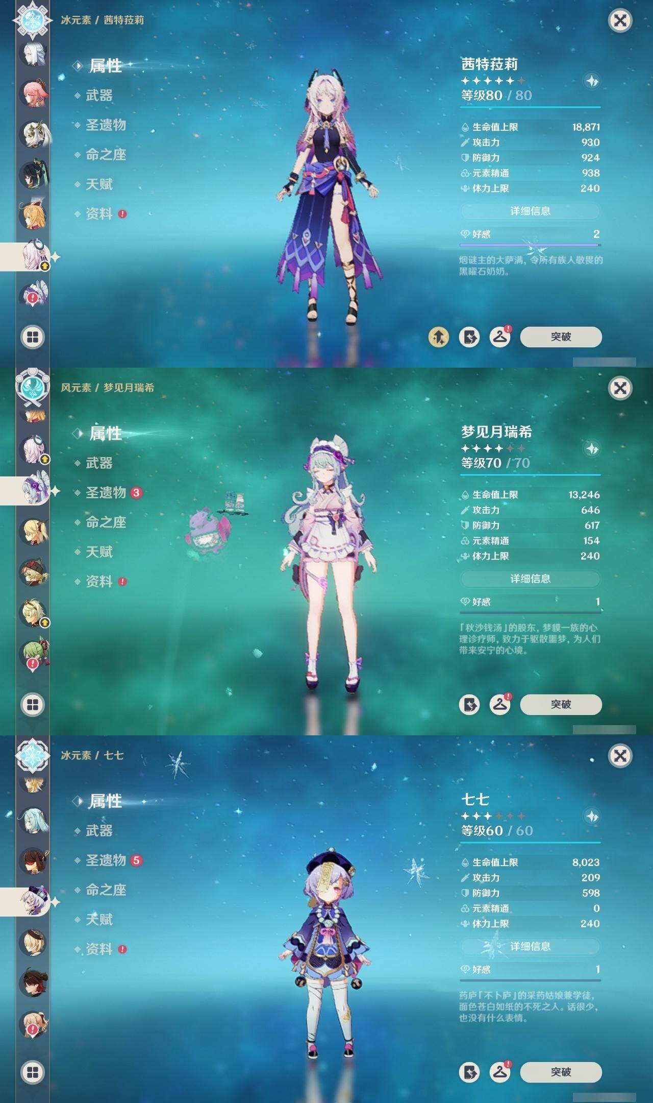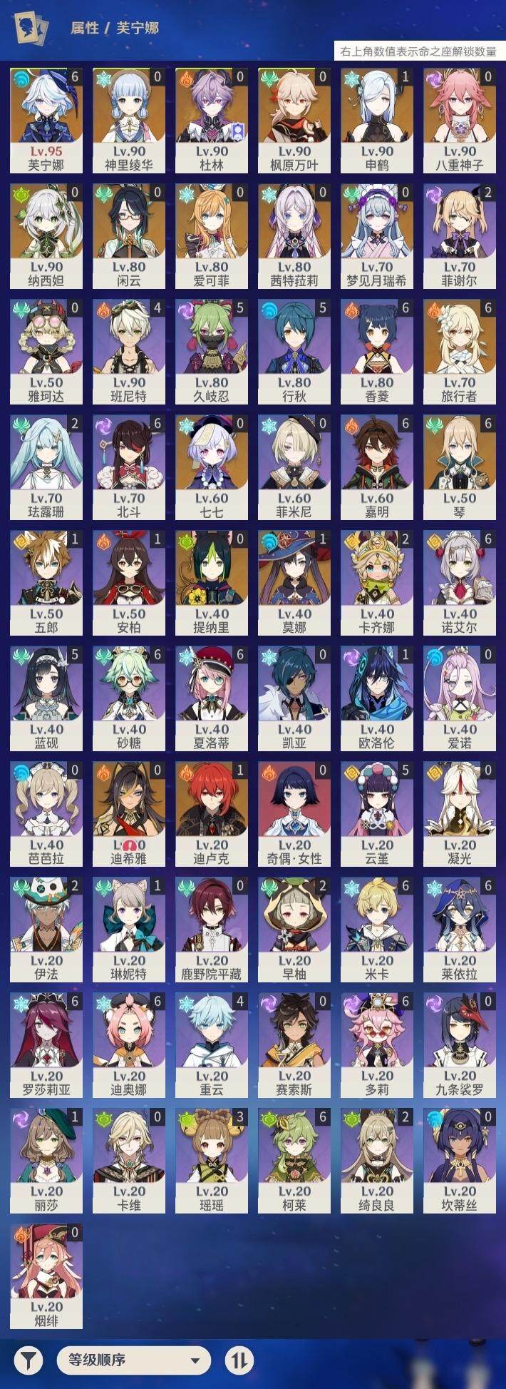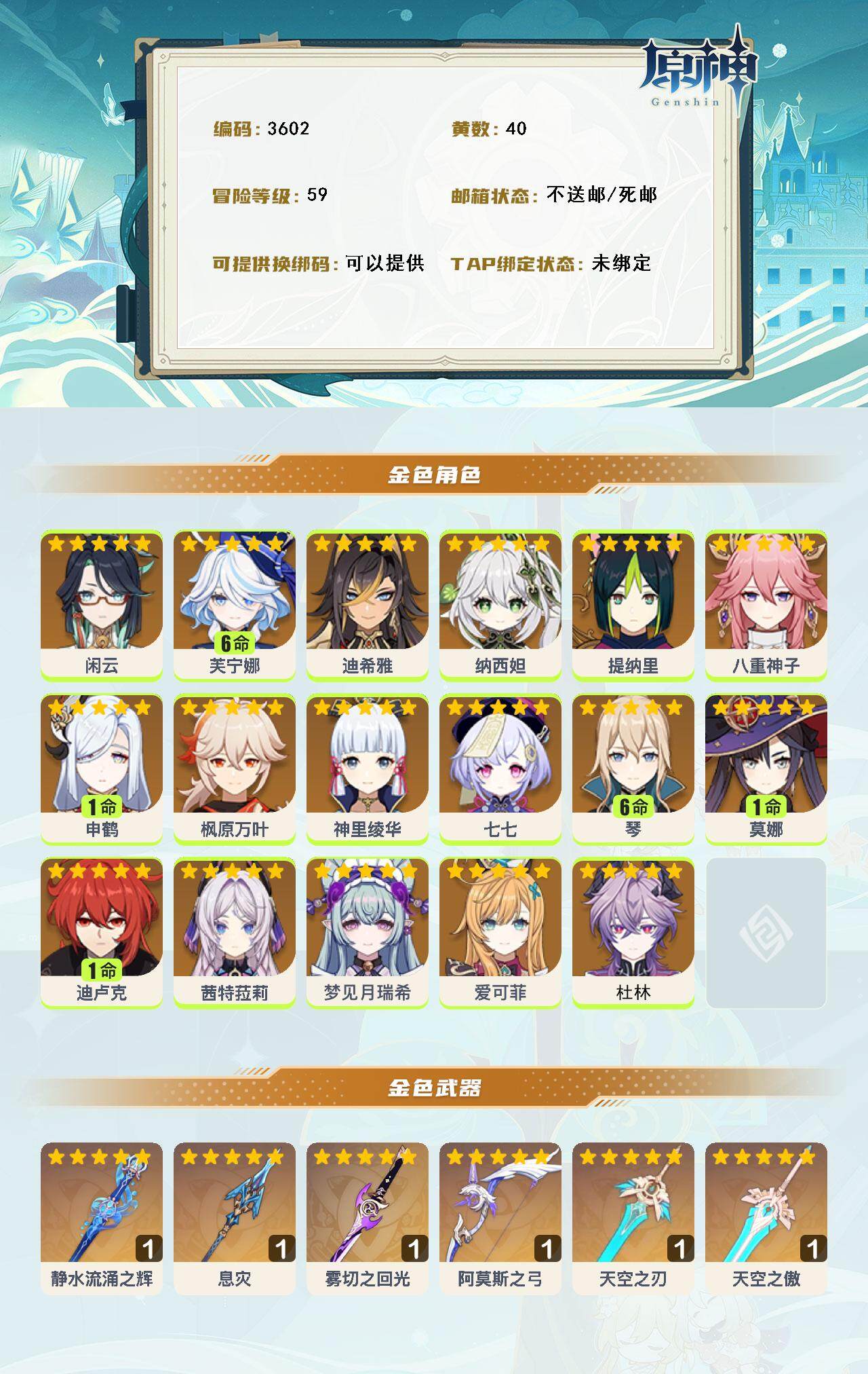 59级/40黄/女主/17个五星角色/8个五星武器 0命闲云满命芙宁娜0命迪希雅0命纳西妲0命提纳里0命八重神子1命申鹤0命枫原万叶0命神里绫华0命七七满命琴1命莫娜1命迪卢克0命茜特菈莉0命梦见月瑞希0命爱可菲0命杜林精1静水流涌之辉精1息灾精1雾切之回光精1阿莫斯之弓精1天空之刃精1天空之傲精1黑蚀精1黎明破晓之史