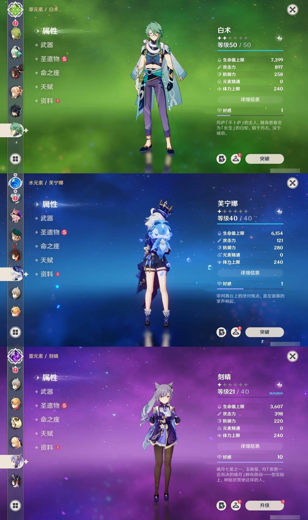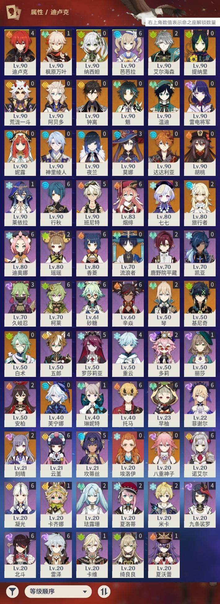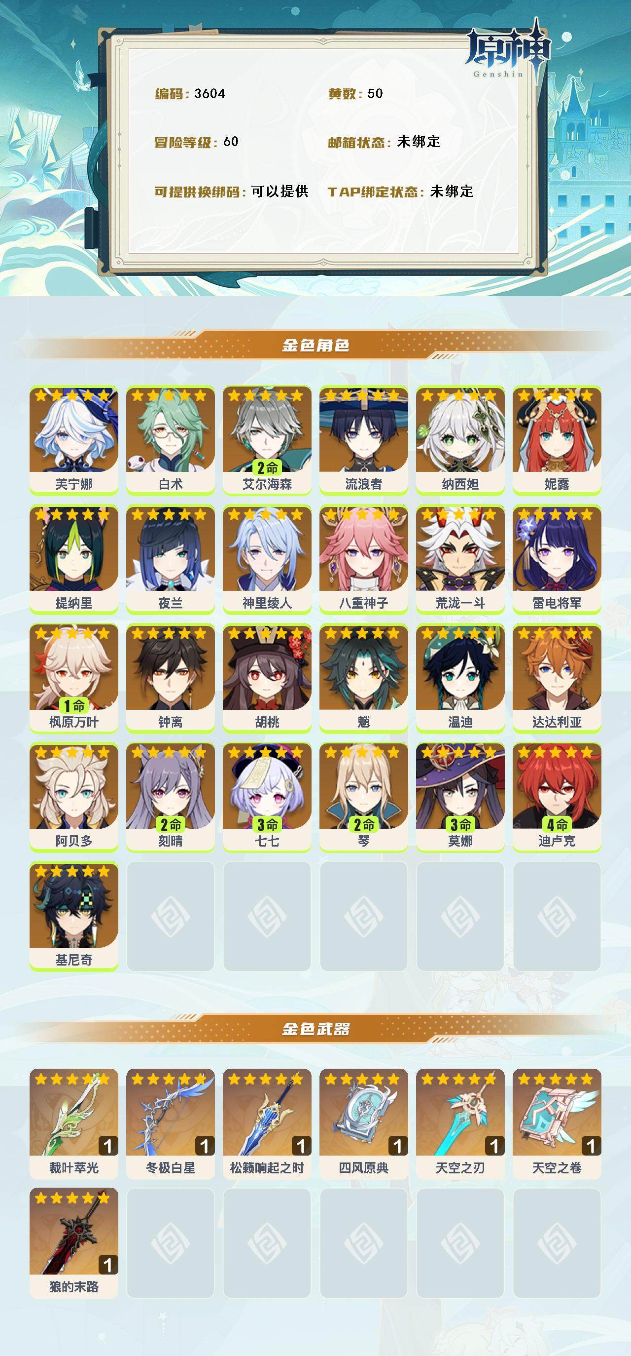 60级/50黄/女主/25个五星角色/8个五星武器 0命芙宁娜0命白术2命艾尔海森0命流浪者0命纳西妲0命妮露0命提纳里0命夜兰0命神里绫人0命八重神子0命荒泷一斗0命雷电将军1命枫原万叶0命钟离0命胡桃0命魈0命温迪0命达达利亚0命阿贝多2命刻晴3命七七2命琴3命莫娜4命迪卢克0命基尼奇精1裁叶萃光精1冬极白星精1松籁响起之时精1四风原典精1天空之刃精1天空之卷精1狼的末路