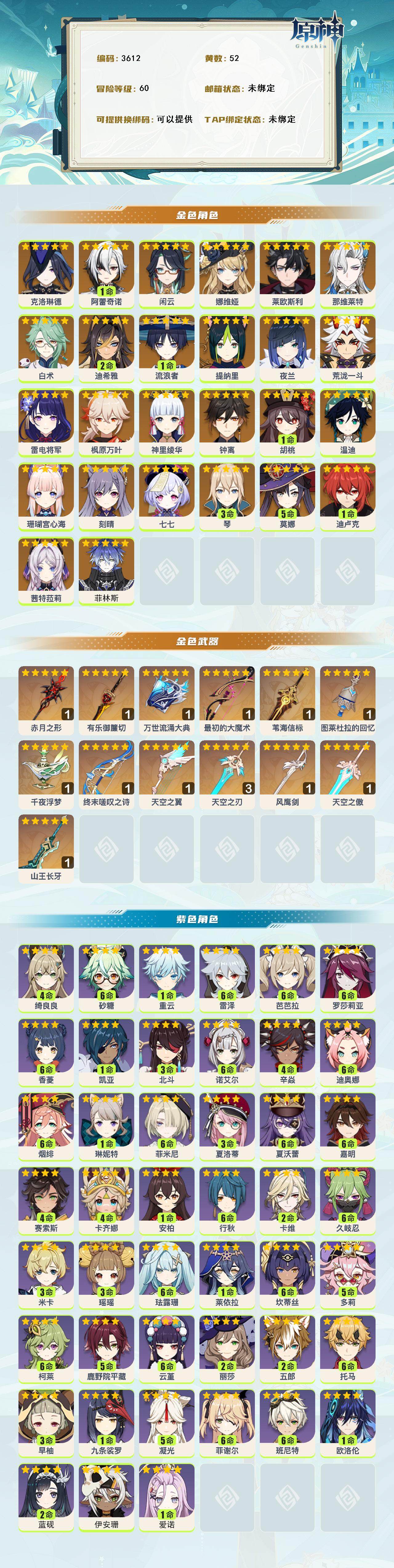 【金色角色】:菲林斯0命,茜特菈莉0命,克洛琳德0命,阿蕾奇诺1命,闲云0命,娜维娅0命,莱欧斯利0命,那维莱特0命,白术0命,迪希雅2命,流浪者1命,提纳里0命,夜兰0命,荒泷一斗0命,珊瑚宫心海0命,雷电将军0命,神里绫华0命,枫原万叶0命,胡桃1命,钟离0命,温迪0命,琴3命,刻晴0命,迪卢克1命,莫娜5命,七七0命 【拥有武器】:山王长牙精1,赤月之形精1,有乐御簾切精1,万世流涌大典精1,最初的大魔术精1,苇海信标精1,图莱杜拉的回忆精1,千夜浮梦精1,终末嗟叹之诗精1,天空之傲精1,风鹰剑精1,天空之刃精3,天空之翼精1 【紫色角色】:爱诺1命,伊安珊0命,蓝砚2命,欧洛伦1命,卡齐娜4命,赛索斯4命,嘉明满命,夏沃蕾满命,夏洛蒂3命,菲米尼满命,琳妮特1命,绮良良4命,卡维2命,米卡3命,瑶瑶3命,珐露珊满命,莱依拉1命,坎蒂丝满命,多莉5命,柯莱满命,鹿野院平藏5命,久岐忍满命,云堇满命,五郎2命,托马满命,九条裟罗0命,早柚3命,烟绯满命,罗莎莉亚满命,辛焱4命,迪奥娜满命,砂糖满命,雷泽满命,菲谢尔满命,丽莎2命,北斗3命,香菱满命,安柏0命,班尼特满命,行秋满命,芭芭拉满命,凝光5命,诺艾尔满命,凯亚1命,重云0命