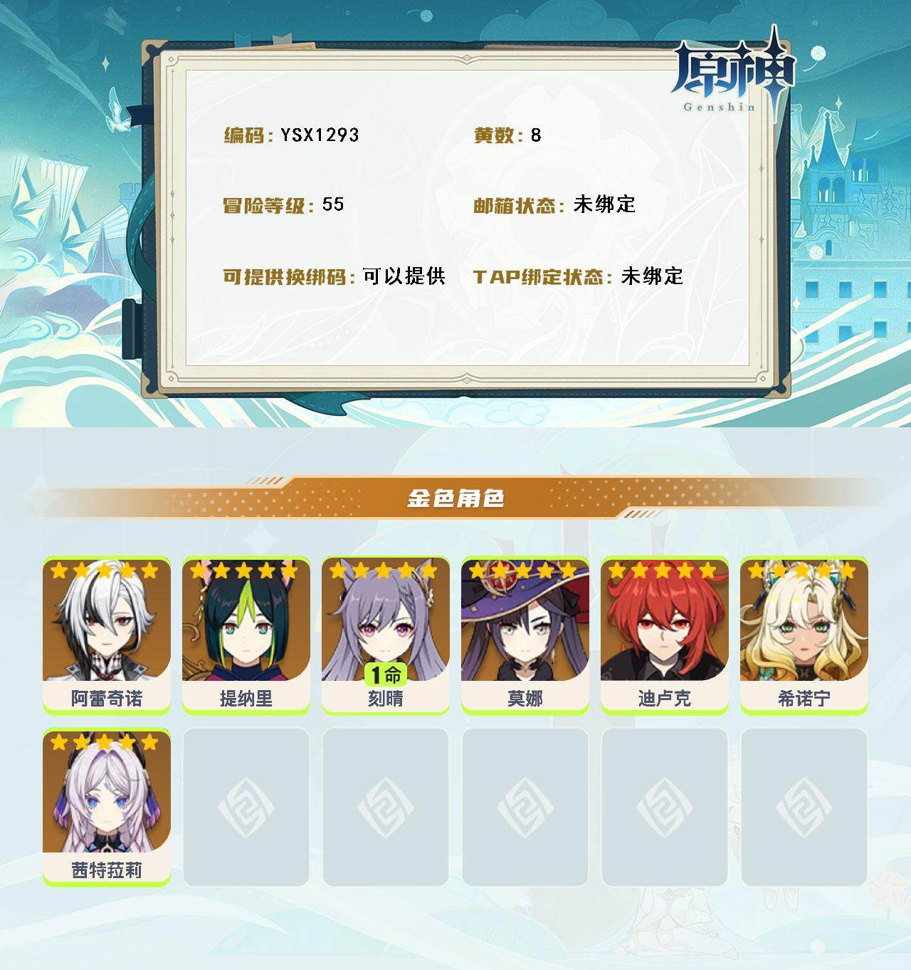【ysx1293】55级/8黄/女主/7个五星角色/0命阿蕾奇诺/0命茜特菈莉/0命希诺宁/0命提纳里/0命莫娜/1命刻晴/0命迪卢克