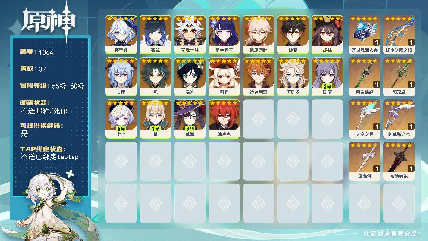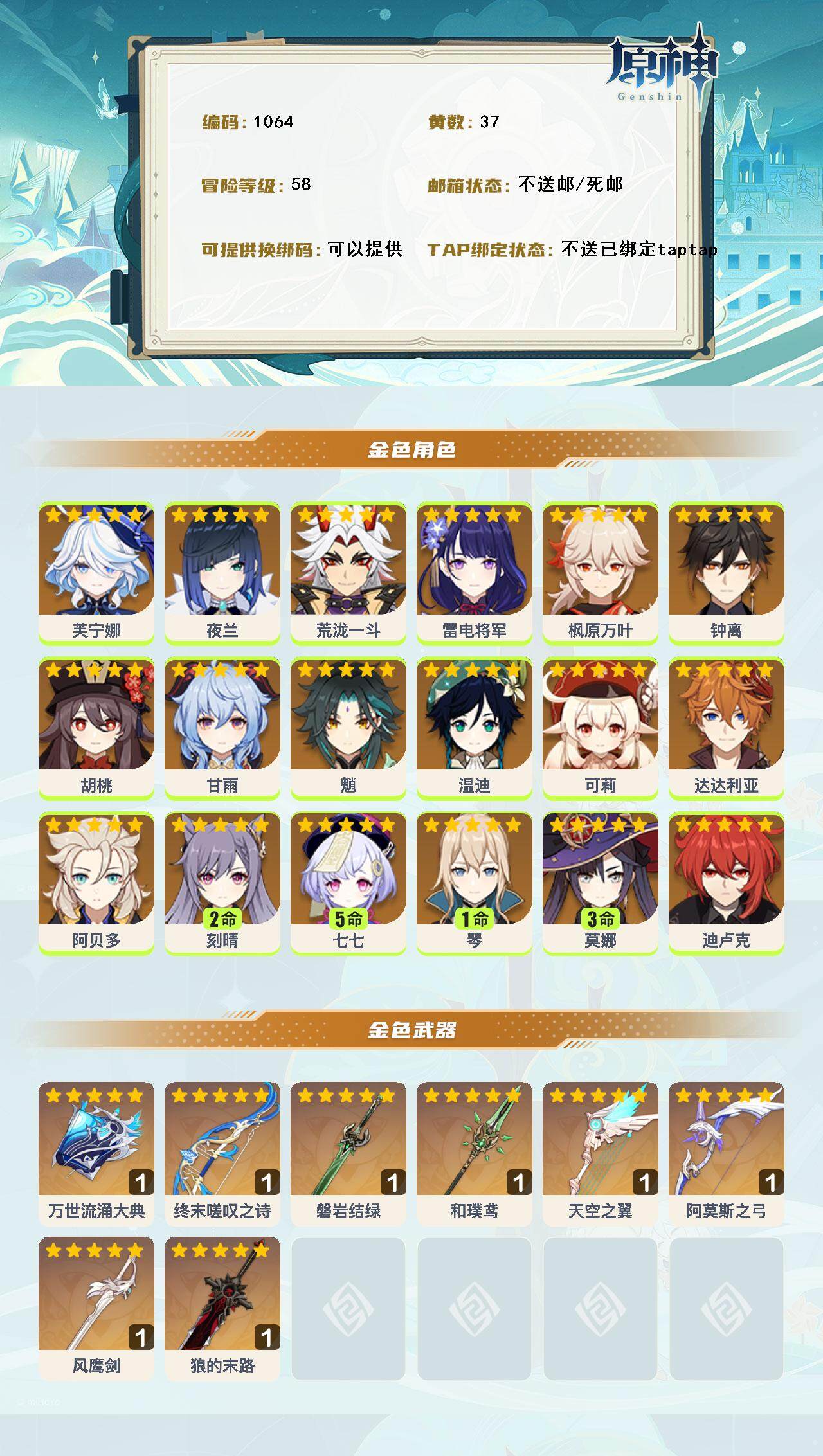 [14647324]58级/37黄/女主/18个五星角色/8个五星武器 0命芙宁娜0命夜兰0命荒泷一斗0命雷电将军0命枫原万叶0命钟离0命胡桃0命甘雨0命魈0命温迪0命可莉0命达达利亚0命阿贝多2命刻晴5命七七1命琴3命莫娜0命迪卢克精1万世流涌大典精1终末嗟叹之诗精1磐岩结绿精1和璞鸢精1天空之翼精1阿莫斯之弓精1风鹰剑精1狼的末路