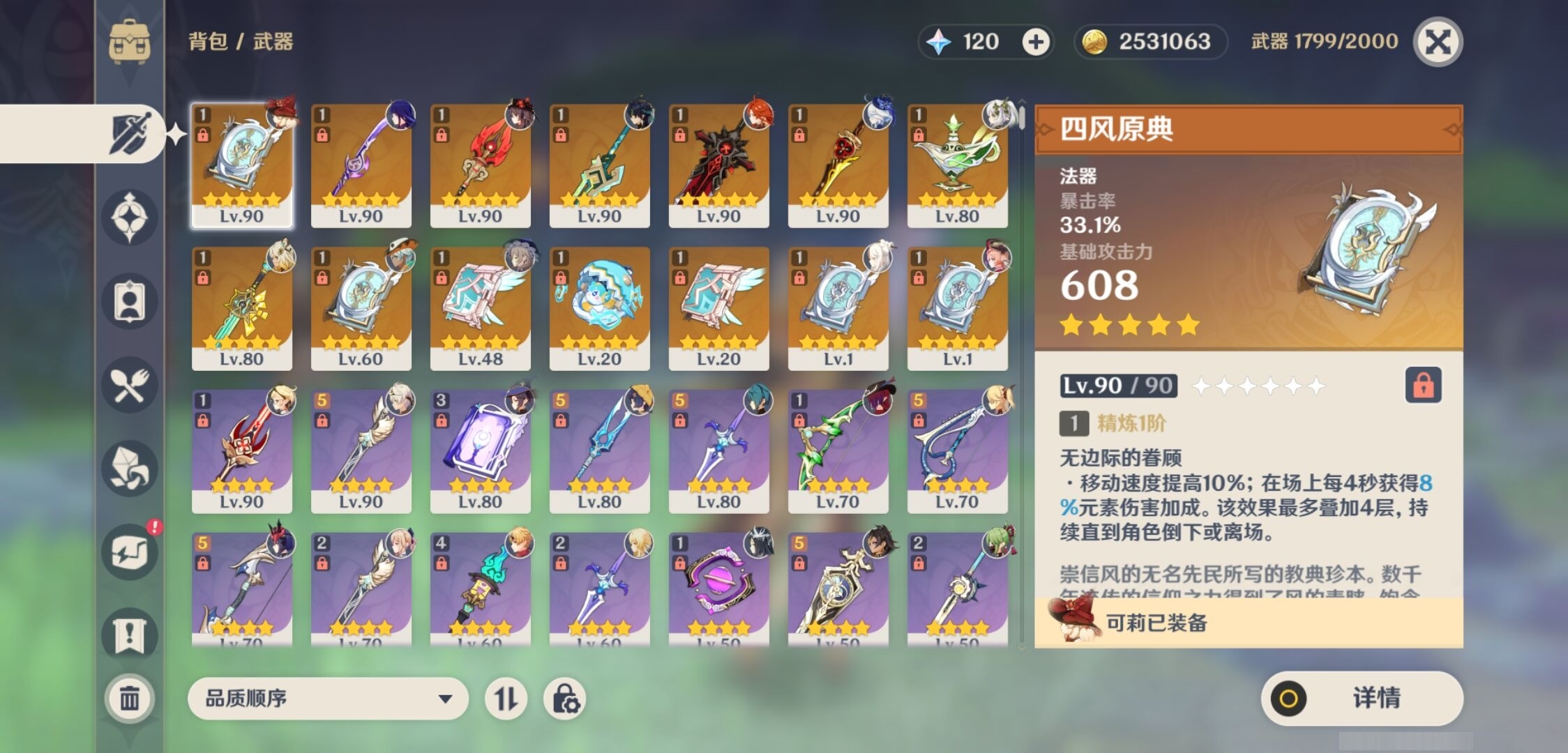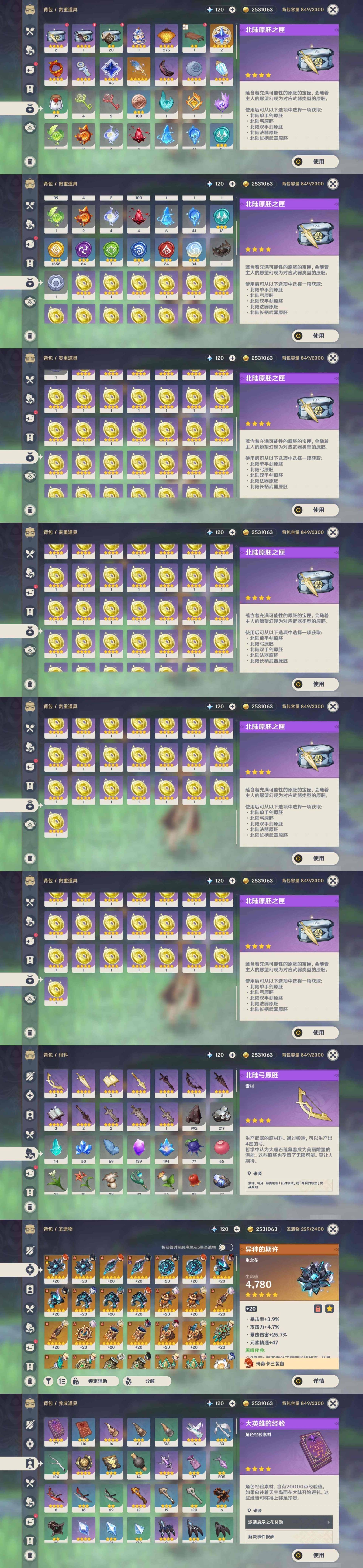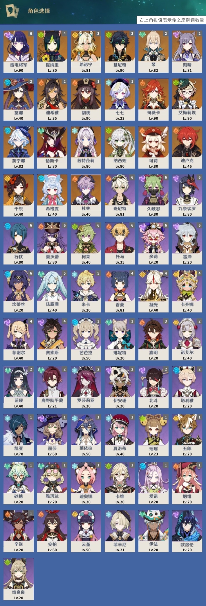 [14659261]61黄 风系:2命琴/0命恰斯卡 火系:1命胡桃/0命可莉/0命迪卢克/0命杜林/2命迪希雅/0命玛薇卡 水系:0命芙宁娜/2命莫娜/0命希格雯 冰系:0命茜特菈莉/1命七七 岩系:3命希诺宁/0命千织 雷系:6命雷电将军/2命刻晴 草系:3命基尼奇/0命艾梅莉埃/0命纳西妲/4命提纳里 [四星角色等级及命座] 风系: 5命珐露珊/2命蓝砚/2命鹿野院平藏/0命伊法/3命琳妮特/1命砂糖 火系: 6命班尼特/4命香菱/6命夏沃蕾/0命安柏/6命托马/3命嘉明/1命烟绯/1命辛焱 水系:6命行秋/3命芭芭拉/1命爱诺/2命塔利雅/6命坎蒂丝 冰系:1命凯亚/1命莱依拉/1命夏洛蒂/0命菲米尼/5命米卡/2命罗莎莉亚/1命迪奥娜 岩系:0命云堇/4命凝光/2命诺艾尔/1命五郎 雷系:6命久岐忍/6命九条裟罗/1命丽莎/4命菲谢尔/2命伊安珊/0命欧洛伦/4命赛索斯/6命多莉/2命北斗/6命雷泽 草系:6命柯莱/1命瑶瑶/1命卡维/0命绮良良 [角色经验书] 紫色77/蓝色116 [小物品] 异梦溶媒11/嬗变之尘39 [特殊材料] 东风之爪3/东风的吐息3/北风之尾1/北风之环1/北风的魂匣6/吞天之鲸·只角3/魔王之刃·残片1 武炼之魂·孤影5/龙王之冕1/血玉之枝1/鎏金之鳞3/智识之冕19