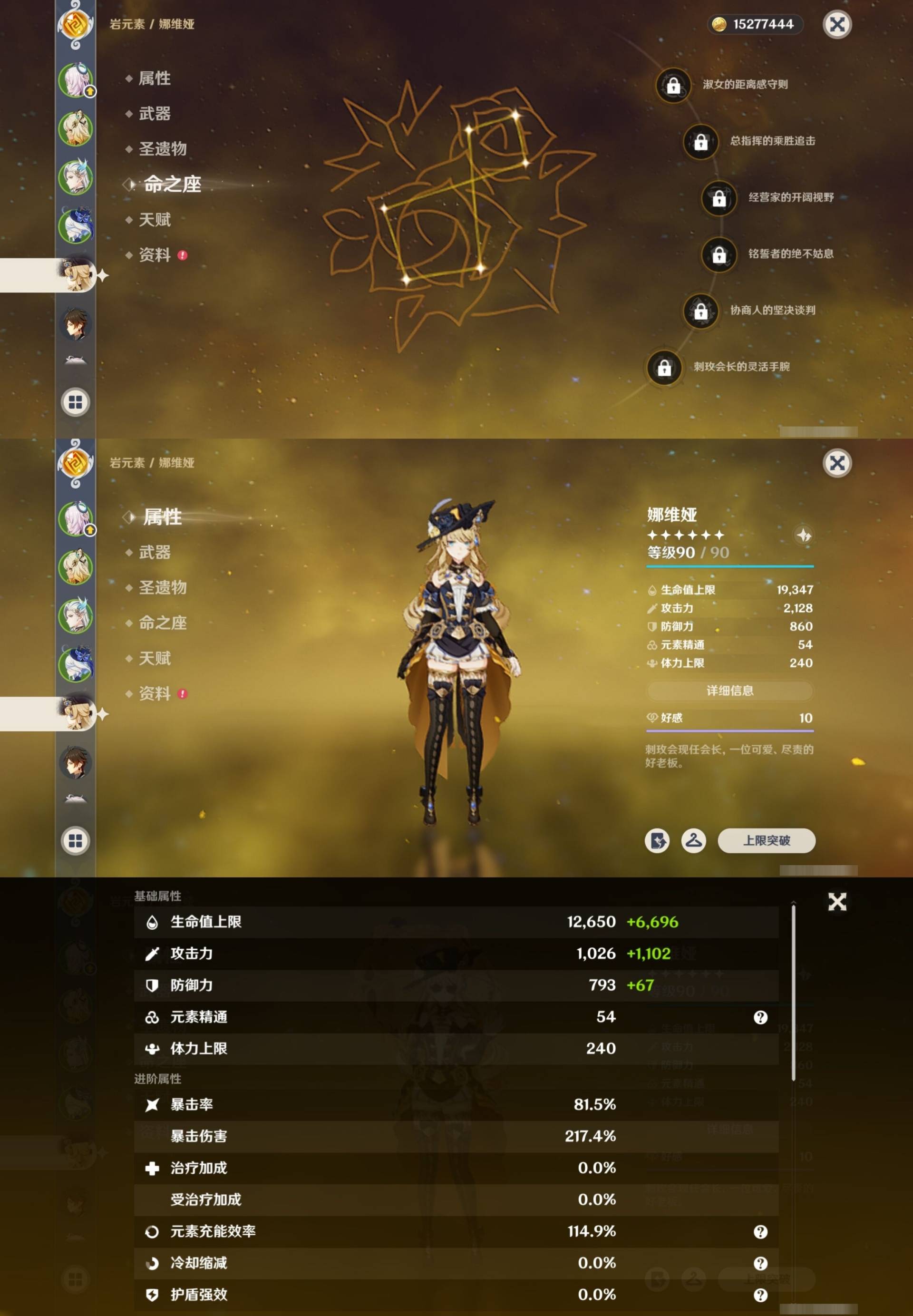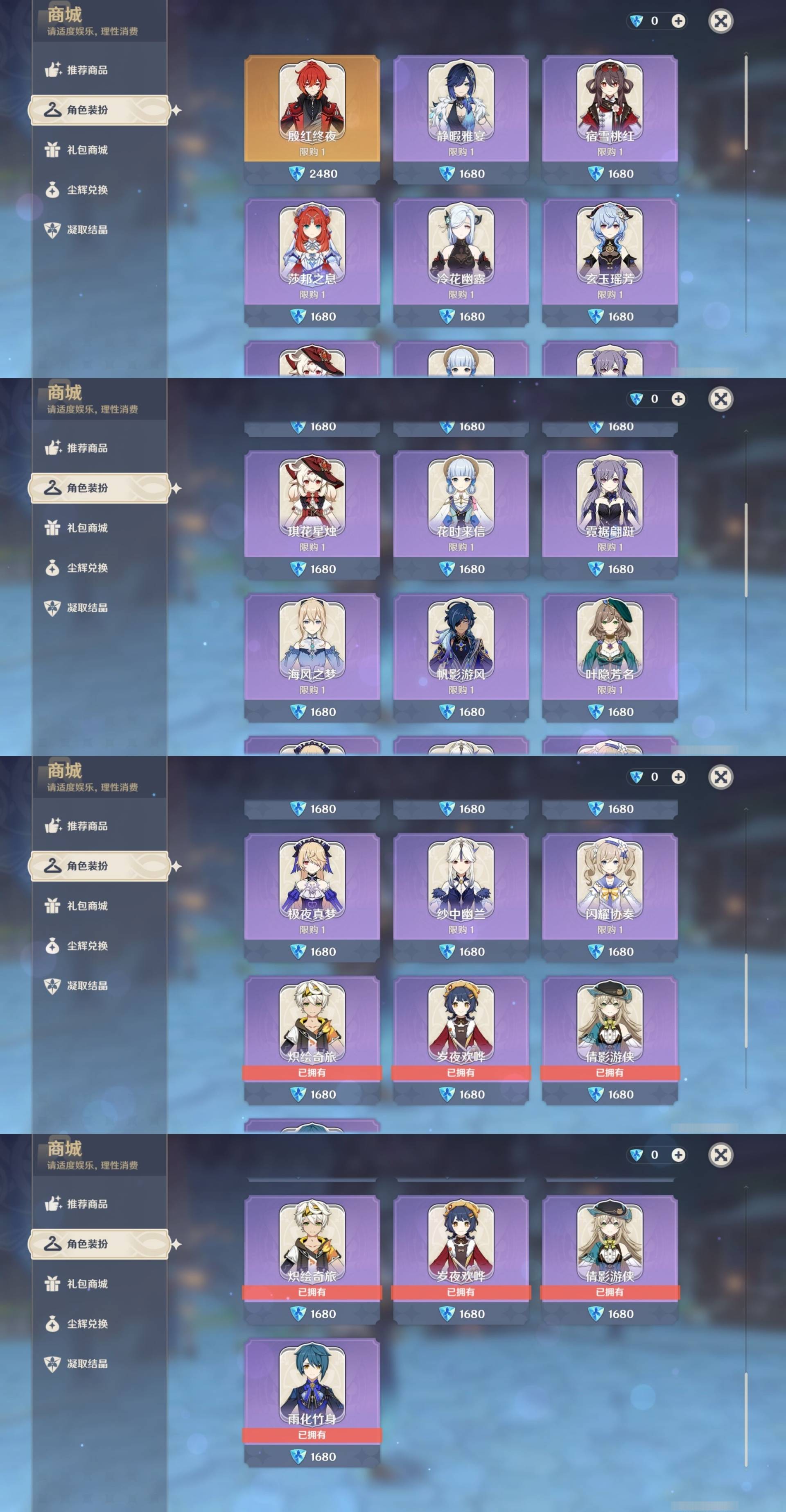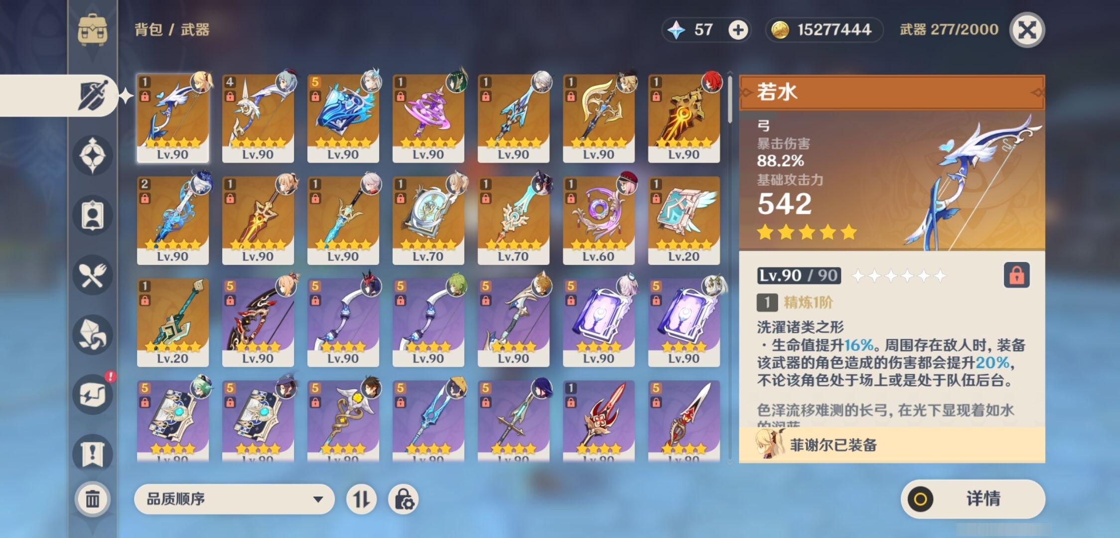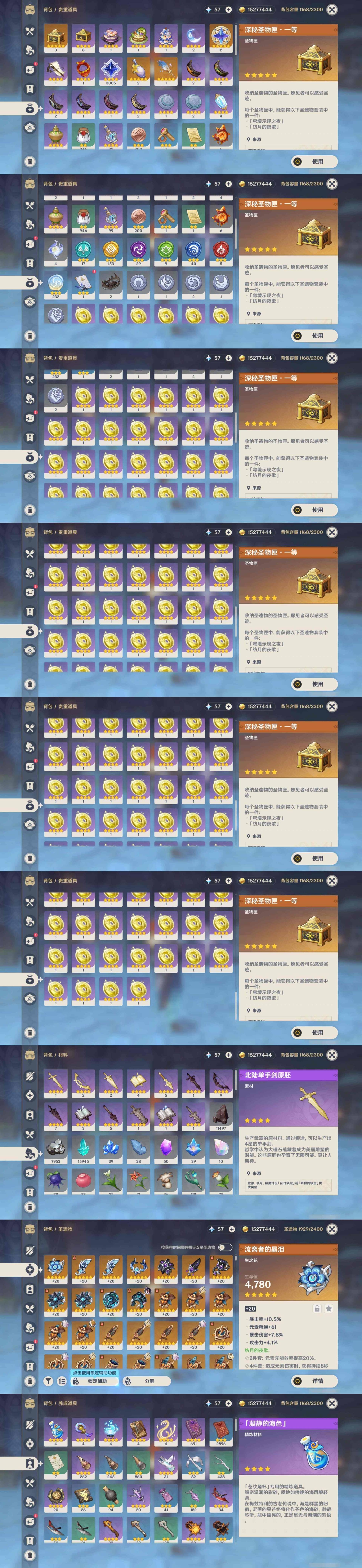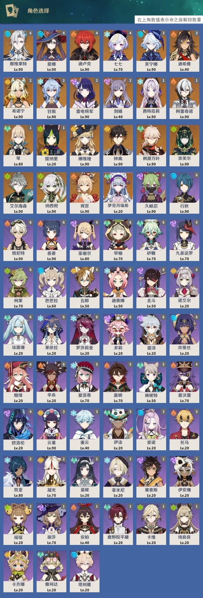 [14659370]81黄 风元素:0命枫原万叶 火元素:1命阿蕾奇诺 0命宵宫 水元素:6命那维莱特 3命芙宁娜 雷元素:2命雷电将军 冰元素:1命茜特菈莉 2命甘雨 岩元素:2命希诺宁 0命娜维娅 0命钟离 草元素:0命奈芙尔 0命艾尔海森 0命纳西妲 【常驻五星角色及命座】 风元素:1命琴 0命梦见月瑞希 火元素:4命迪卢克 3命迪希雅 水元素:4命莫娜 雷元素:2命刻晴 冰元素:4命七七 草元素:1命提纳里 单手剑:精1圣显之钥 精1苍古自由之誓 精2静水流涌之辉 双手剑:精1山王长牙 精1苇海信标 精1裁断 长柄武器:精1天空之脊 精1息灾 法器:精5万世流涌大典 精1不灭月华 精1四风原典 精1天空之卷 精1神乐之真意 弓:精1若水 精4阿莫斯之弓 【角色皮肤】 四星角色:绮良良-倩影游侠 香菱-岁夜欢哗 行秋-雨化竹身