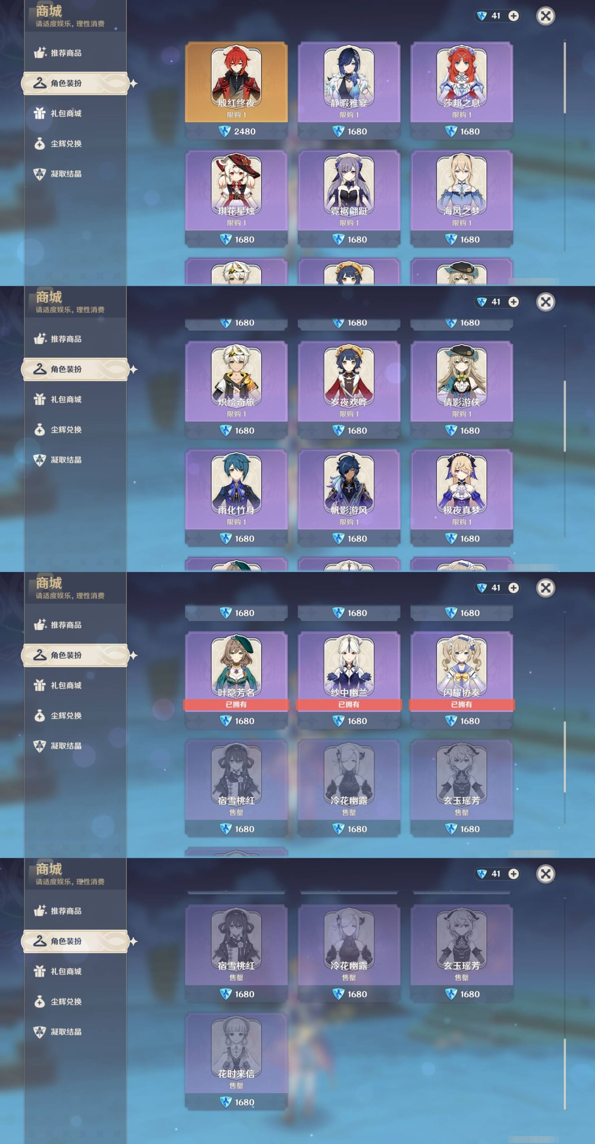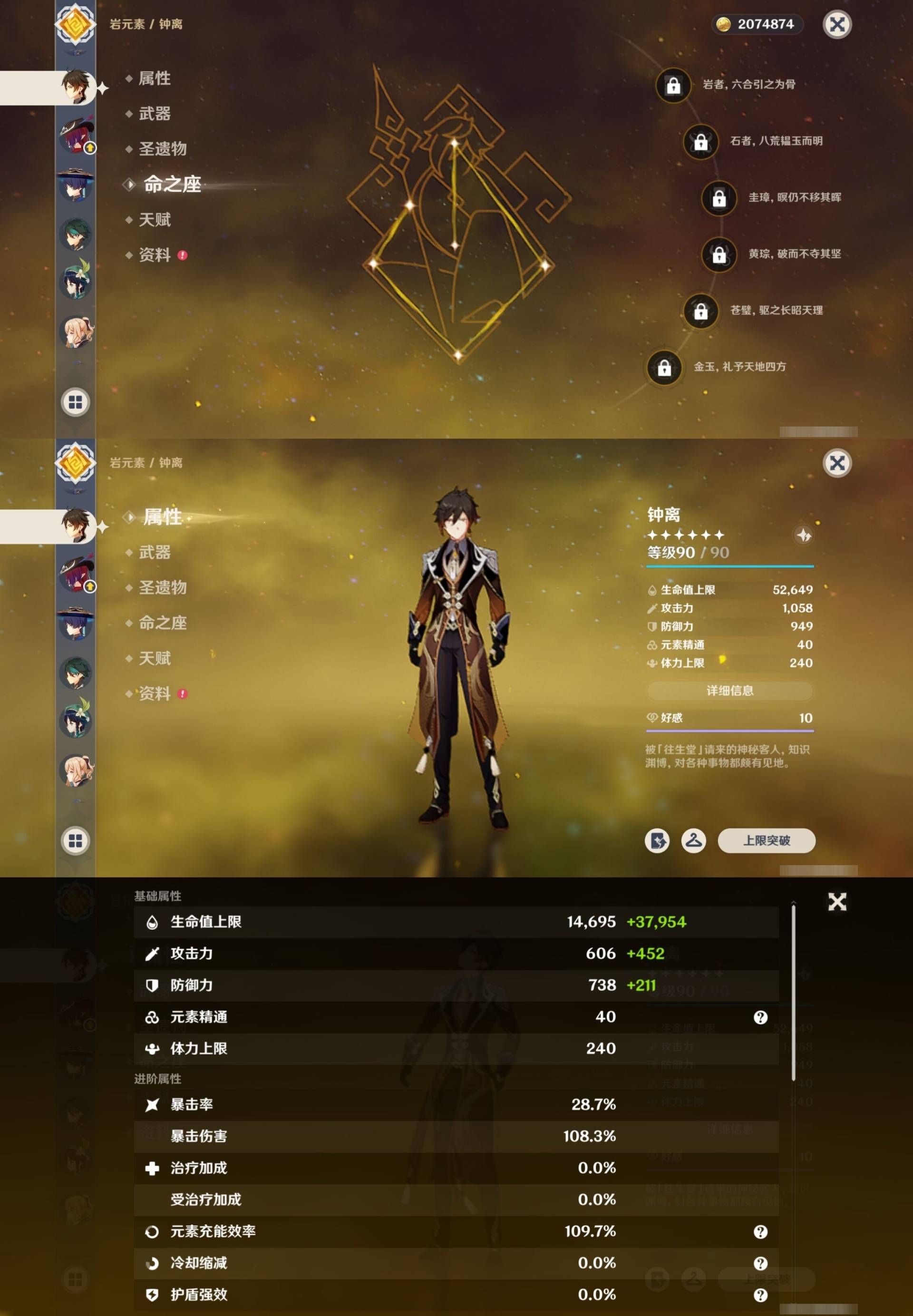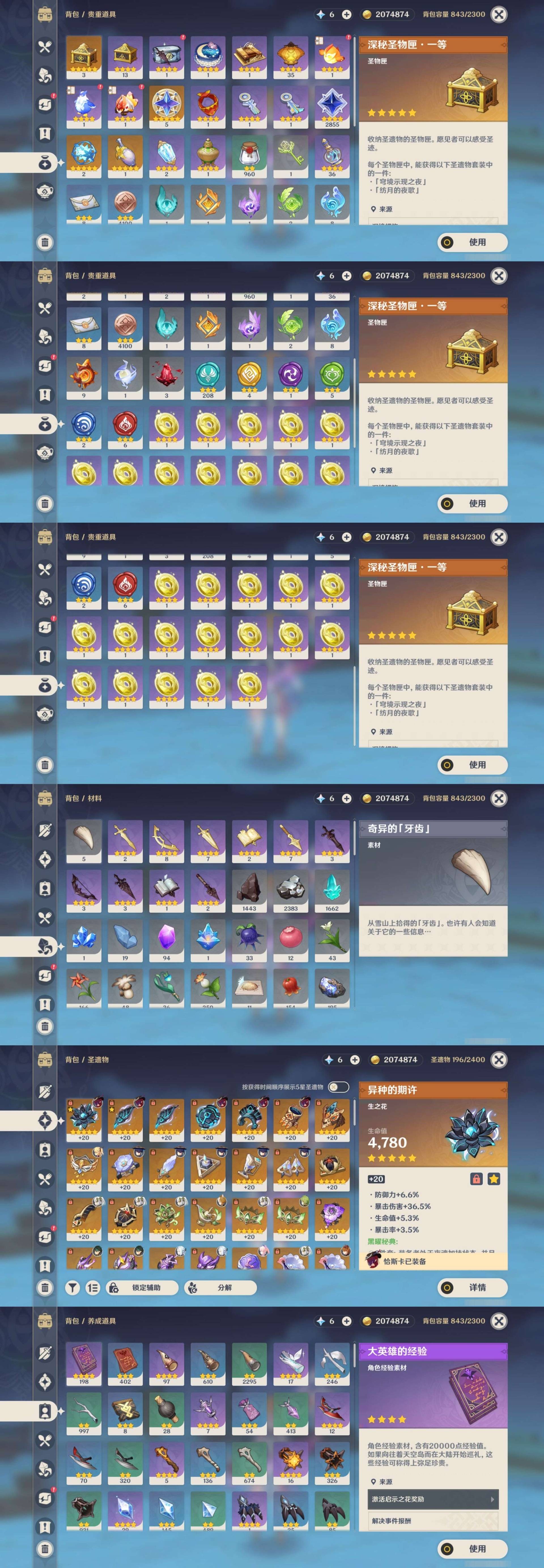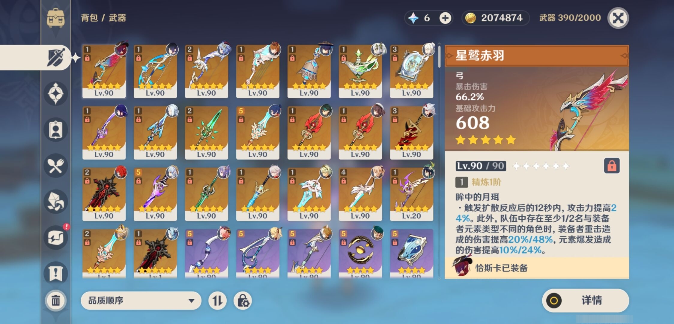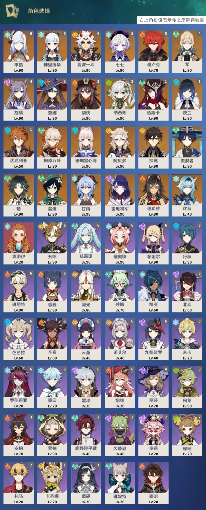 [14662332]114黄 风元素:0命枫原万叶 1命恰斯卡 0命流浪者 0命魈 0命温迪 火元素:3命胡桃 水元素:0命珊瑚宫心海 1命夜兰 1命达达利亚 雷元素:0命雷电将军 冰元素:6命申鹤 6命神里绫华 0命甘雨 0命优菈 0命埃洛伊 岩元素:6命荒泷一斗 0命阿贝多 0命钟离 草元素:2命纳西妲 【常驻五星角色及命座】 风元素:4命琴 火元素:0命迪希雅 5命迪卢克 水元素:3命莫娜 雷元素:4命刻晴 冰元素:5命七七 单手剑:精1天空之刃 精1磐岩结绿 精1苍古自由之誓 精5雾切之回光 精4风鹰剑 双手剑:精1狼的末路 精2狼的末路 精3赤角石溃杵 长柄武器:精2和璞鸢 精2天空之脊 精5天空之脊 精1息灾 精1护摩之杖 精1护摩之杖 精1薙草之稻光 法器:精1千夜浮梦 精3四风原典 精1图莱杜拉的回忆 弓:精1天空之翼 精1星鹫赤羽 精1终末嗟叹之诗 精2阿莫斯之弓 精1飞雷之弦振 【角色皮肤】 五星角色:胡桃-宿雪桃红 申鹤-冷花幽露 甘雨-玄玉瑶芳 神里绫华-花时来信 四星角色:丽莎-叶隐芳名 凝光-纱中幽兰 芭芭拉-闪耀协奏
