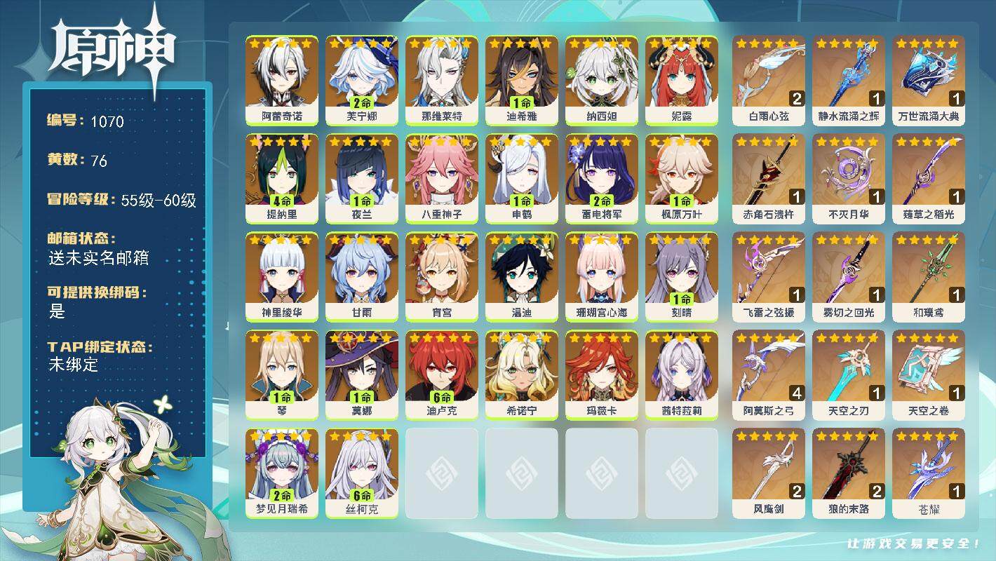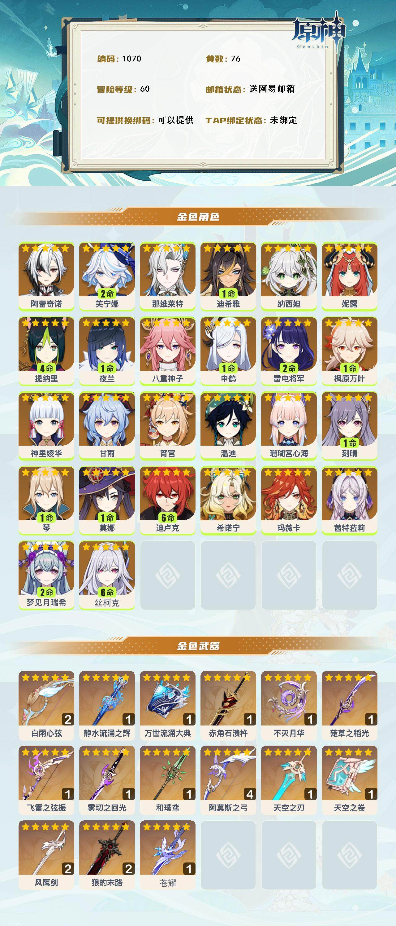 [14674719]60级/76黄/女主/26个五星角色/15个五星武器 0命阿蕾奇诺2命芙宁娜0命那维莱特1命迪希雅0命纳西妲0命妮露4命提纳里1命夜兰0命八重神子1命申鹤2命雷电将军1命枫原万叶0命神里绫华0命甘雨0命宵宫0命温迪0命珊瑚宫心海1命刻晴1命琴1命莫娜满命迪卢克0命希诺宁0命玛薇卡0命茜特菈莉2命梦见月瑞希满命丝柯克精2白雨心弦精1静水流涌之辉精1万世流涌大典精1赤角石溃杵精1不灭月华精1薙草之稻光精1飞雷之弦振精1雾切之回光精1和璞鸢精4阿莫斯之弓精1天空之刃精1天空之卷精2风鹰剑精2狼的末路精1苍耀