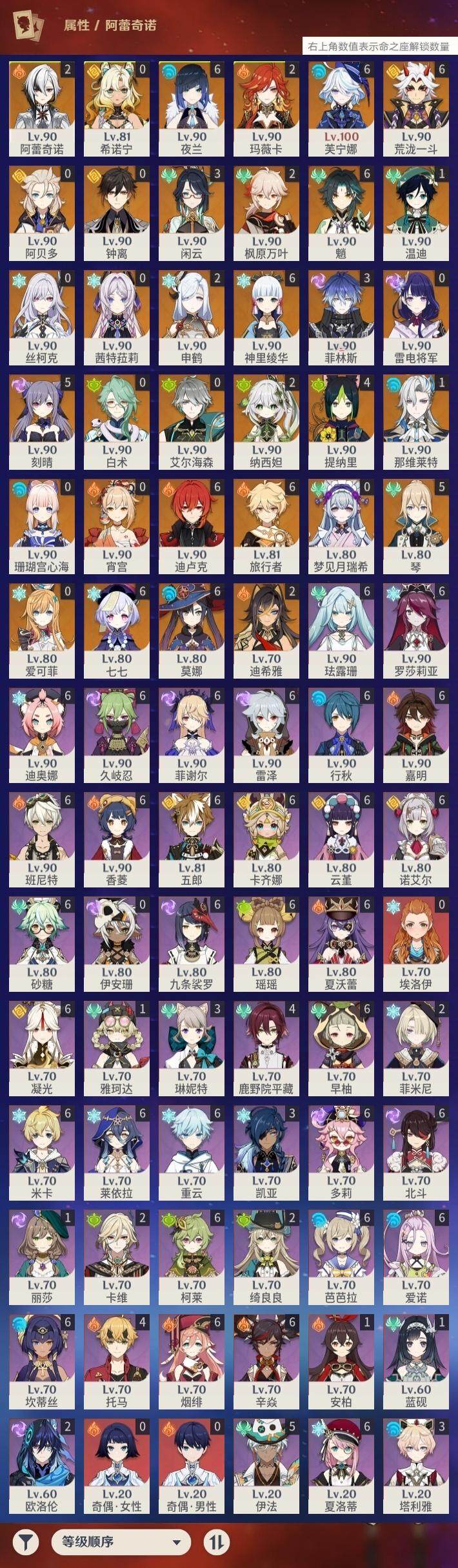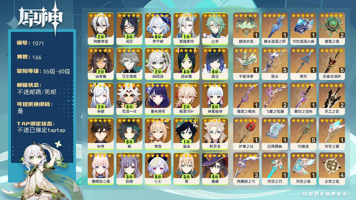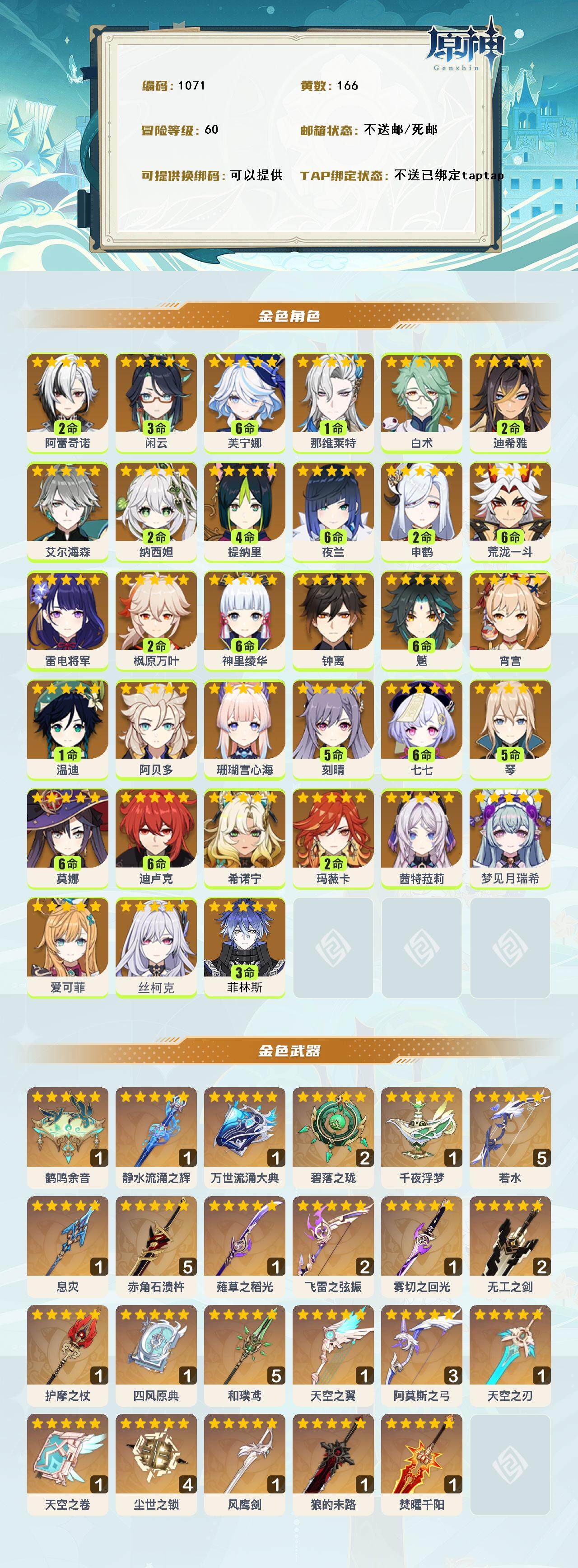 [14674825]60级/166黄/男主/33个五星角色/30个五星武器 2命阿蕾奇诺3命闲云满命芙宁娜1命那维莱特0命白术2命迪希雅0命艾尔海森2命纳西妲4命提纳里满命夜兰2命申鹤满命荒泷一斗0命雷电将军2命枫原万叶满命神里绫华0命钟离满命魈0命宵宫1命温迪0命阿贝多0命珊瑚宫心海5命刻晴满命七七5命琴满命莫娜满命迪卢克0命希诺宁2命玛薇卡0命茜特菈莉0命梦见月瑞希0命爱可菲0命丝柯克3命菲林斯精1鹤鸣余音精1静水流涌之辉精1万世流涌大典精2碧落之珑精1千夜浮梦精5若水精1息灾精5赤角石溃杵精1薙草之稻光精2飞雷之弦振精1雾切之回光精2无工之剑精1护摩之杖精1四风原典精5和璞鸢精1天空之翼精3阿莫斯之弓精1天空之刃精1天空之卷精4尘世之锁精1风鹰剑精1狼的末路精1焚曜千阳