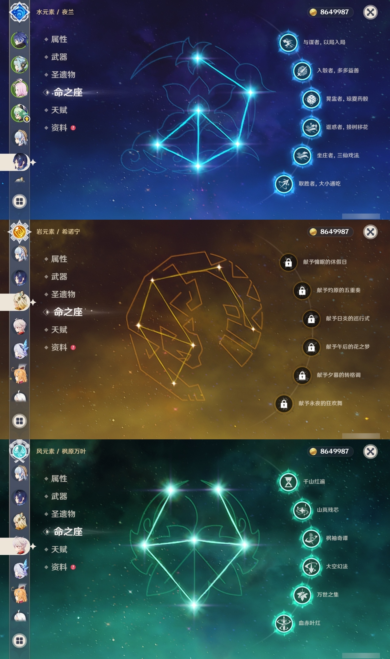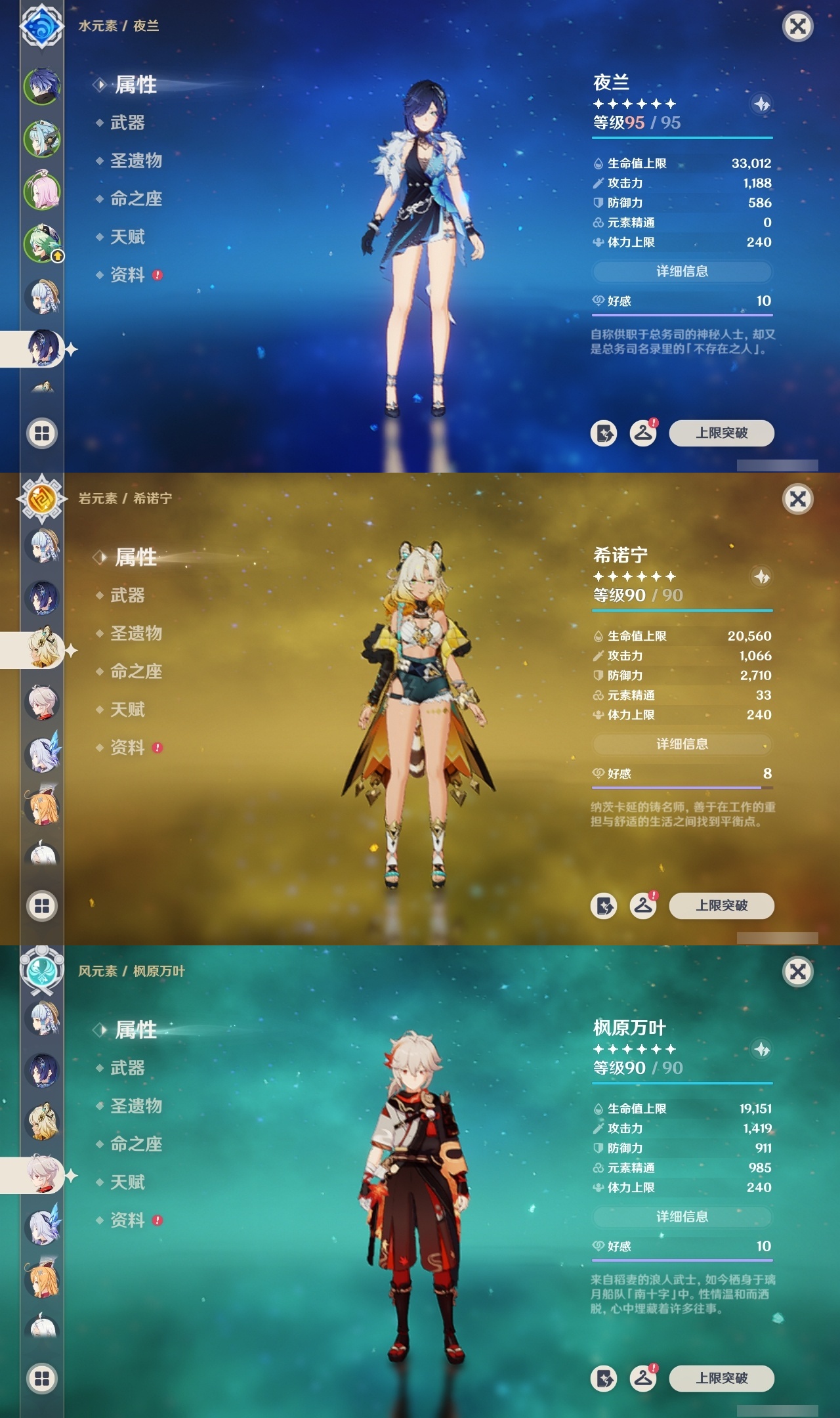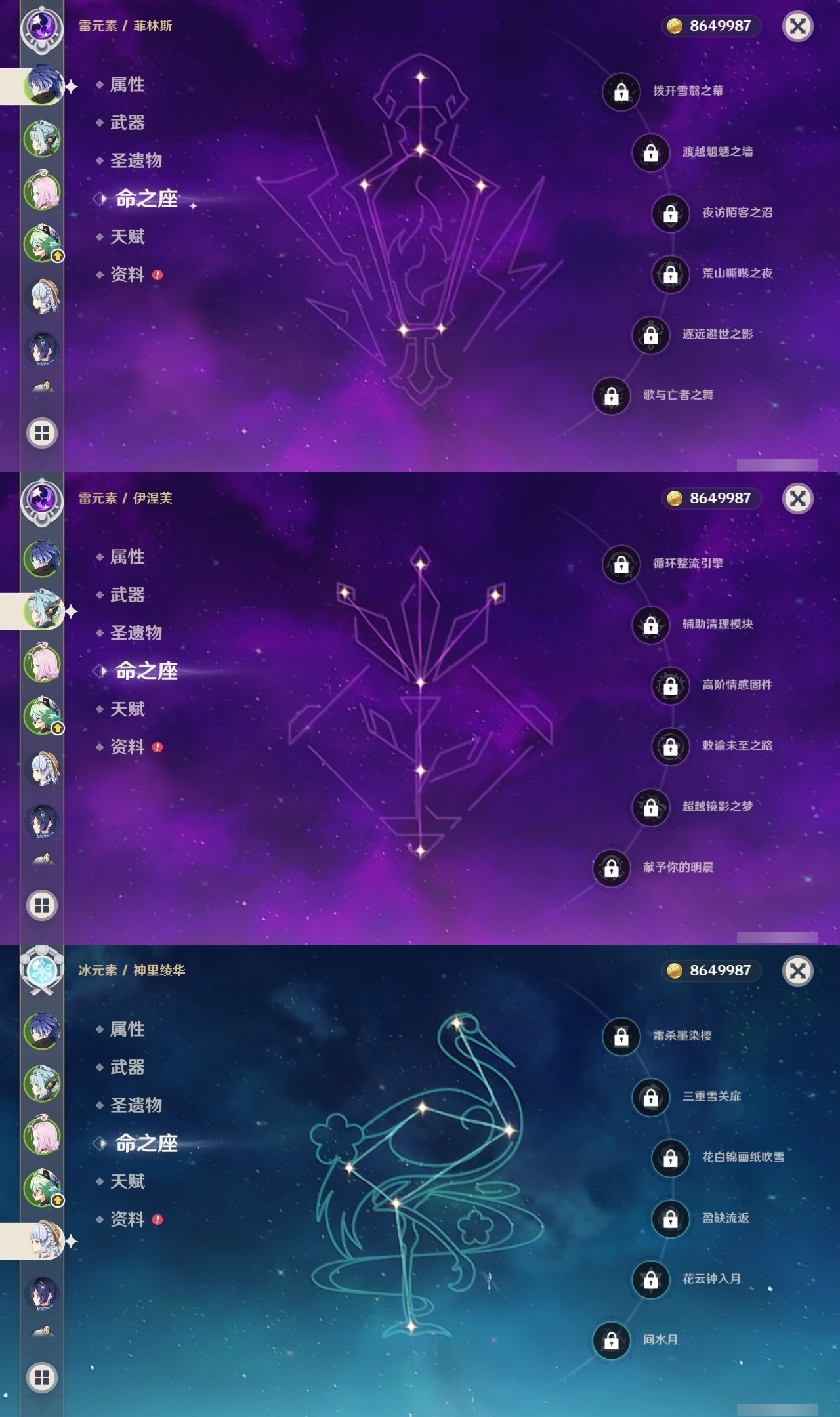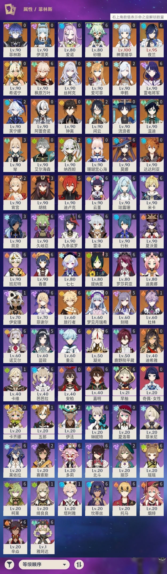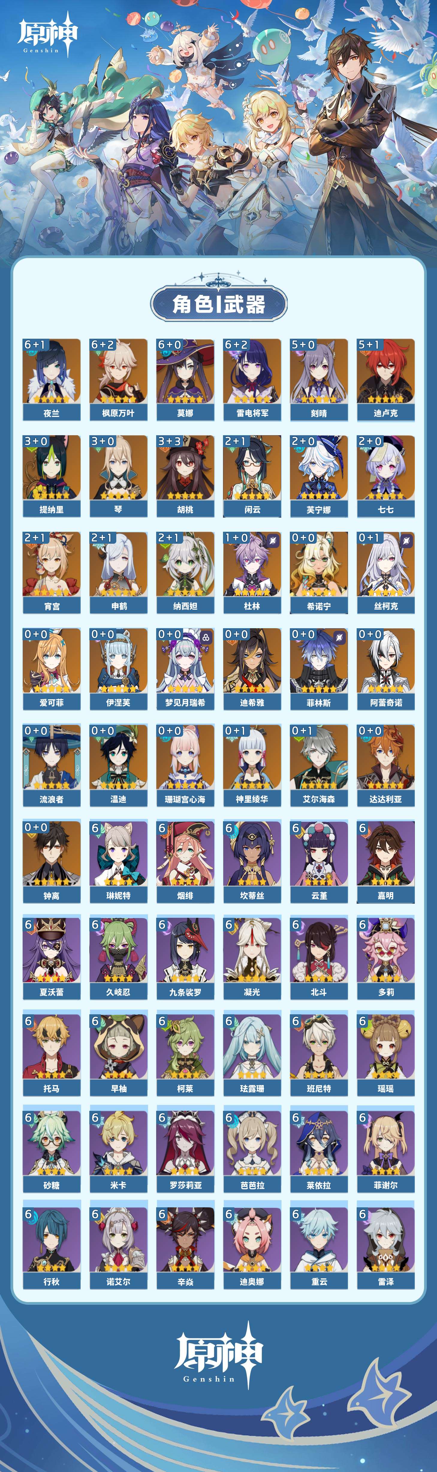 【原神】满命,冒险等级:60,五星数量:51,五星角色:枫原万叶 6命雷电将军 6命莫娜 6命夜兰 6命迪卢克 5命刻晴 5命胡桃 3命琴 3命提纳里 3命芙宁娜 2命闲云 2命七七 2命宵宫 2命申鹤 2命纳西妲 2命杜林 1命珊瑚宫心海希诺宁神里绫华温迪迪希雅钟离达达利亚梦见月瑞希爱可菲阿蕾奇诺丝柯克伊涅芙菲林斯艾尔海森流浪者__五星武器:护摩之杖 3精阿莫斯之弓 2精苍古自由之誓 2精风鹰剑 2精四风原典 2精天空之翼 2精薙草之稻光 2精鹤鸣余音苍耀黎明破晓之史裁叶萃光飞雷之弦振狼的末路天空之脊天空之刃雾切之回光息灾若水千夜浮梦__四星角色:班尼特 6命行秋 6命九条裟罗 6命香菱 6命久岐忍 6命鹿野院平藏 6命珐露珊 6命凝光 6命迪奥娜 6命砂糖 6命瑶瑶 6命莱依拉 6命米卡 6命坎蒂丝 6命多莉 6命柯莱 6命芭芭拉 6命云堇 6命早柚 6命托马 6命烟绯 6命重云 6命辛焱 6命诺艾尔 6命罗莎莉亚 6命雷泽 6命菲谢尔 6命北斗 6命琳妮特 6命夏沃蕾 6命嘉明 6命蓝砚 5命伊法 2命赛索斯 2命绮良良 1命卡维 1命五郎 1命菲米尼 1命伊安珊 1命塔利雅 1命奇偶·女性卡齐娜夏洛蒂爱诺