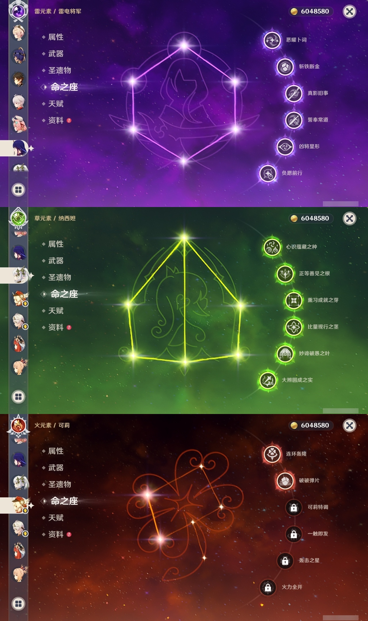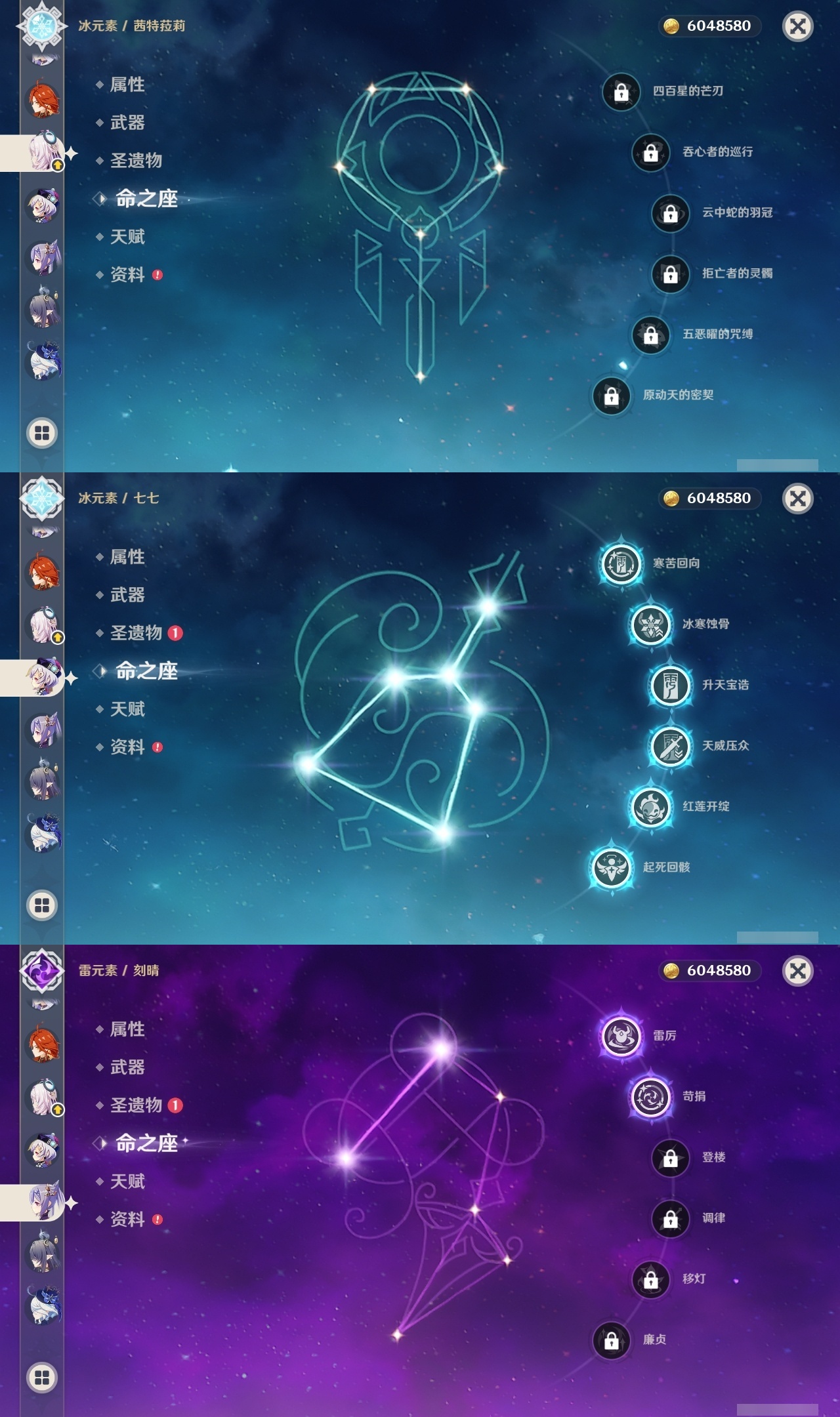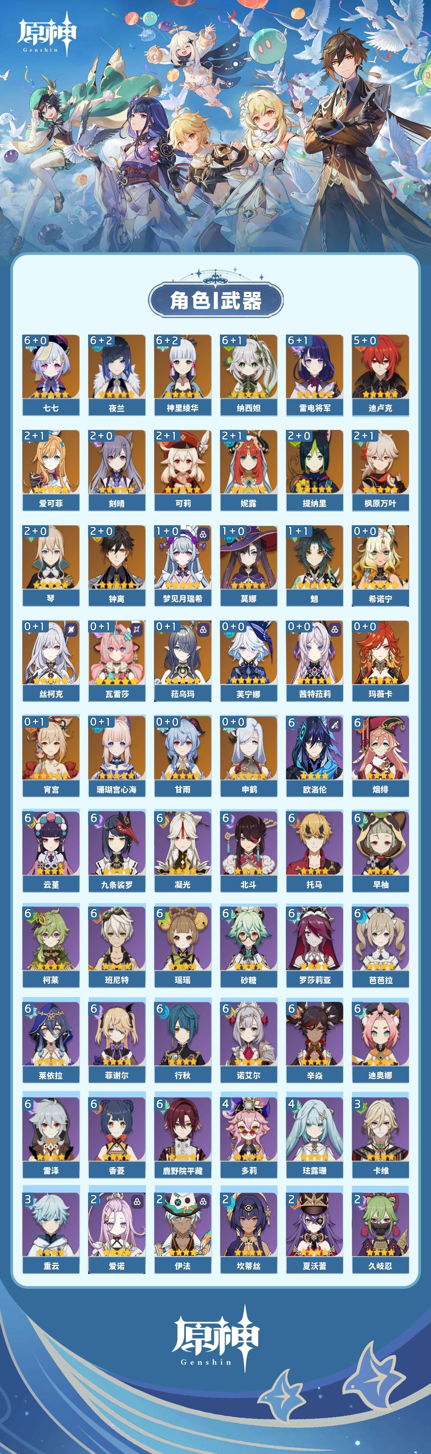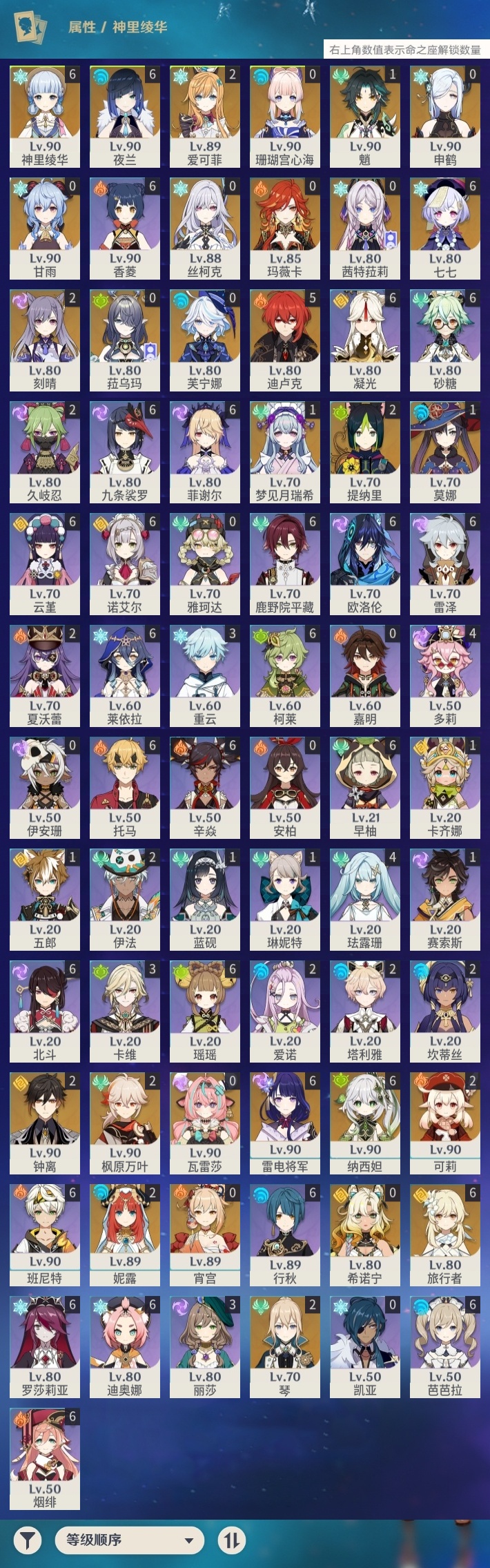 【原神】满命,冒险等级:60,五星数量:50,五星角色:雷电将军 6命七七 6命神里绫华 6命夜兰 6命纳西妲 6命迪卢克 5命爱可菲 2命枫原万叶 2命可莉 2命刻晴 2命琴 2命钟离 2命提纳里 2命妮露 2命梦见月瑞希 1命魈 1命莫娜 1命珊瑚宫心海希诺宁玛薇卡茜特菈莉宵宫申鹤瓦雷莎芙宁娜丝柯克菈乌玛甘雨__五星武器:天空之傲 2精雾切之回光 2精若水 2精溢彩心念裁断鹤鸣余音香韵奏者苍耀纺夜天镜不灭月华苍古自由之誓飞雷之弦振风鹰剑和璞鸢四风原典天空之脊天空之卷天空之翼薙草之稻光波乱月白经津圣显之钥千夜浮梦__四星角色:班尼特 6命行秋 6命九条裟罗 6命香菱 6命鹿野院平藏 6命凝光 6命迪奥娜 6命砂糖 6命瑶瑶 6命莱依拉 6命柯莱 6命芭芭拉 6命欧洛伦 6命云堇 6命早柚 6命托马 6命烟绯 6命辛焱 6命诺艾尔 6命罗莎莉亚 6命雷泽 6命菲谢尔 6命北斗 6命珐露珊 4命多莉 4命卡维 3命重云 3命久岐忍 2命坎蒂丝 2命夏沃蕾 2命伊法 2命塔利雅 2命爱诺 2命卡齐娜 1命蓝砚 1命五郎 1命琳妮特 1命赛索斯 1命嘉明伊安珊