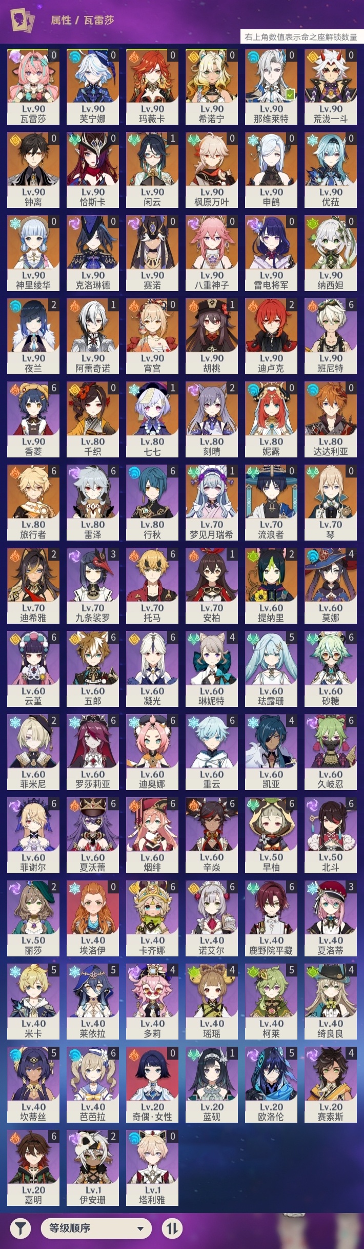 【原神】【lyys9472】冒险等级:60,五星数量:61,五星角色:莫娜 4命迪希雅 2命迪卢克 2命刻晴 2命夜兰 2命提纳里 2命梦见月瑞希 1命闲云 1命阿蕾奇诺 1命胡桃 1命七七 1命琴希诺宁神里绫华恰斯卡玛薇卡宵宫优菈钟离荒泷一斗达达利亚申鹤瓦雷莎八重神子那维莱特芙宁娜千织赛诺妮露纳西妲流浪者枫原万叶克洛琳德雷电将军__五星武器:风鹰剑 3精最初的大魔术 2精狼的末路 2精星鹫赤羽祭星者之望焚曜千阳苇海信标万世流涌大典鹤鸣余音赤月之形苍古自由之誓飞雷之弦振护摩之杖四风原典松籁响起之时天空之脊天空之翼雾切之回光薙草之稻光赤角石溃杵息灾贯虹之槊波乱月白经津若水赤沙之杖__四星角色:卡齐娜 6命班尼特 6命行秋 6命香菱 6命久岐忍 6命鹿野院平藏 6命凝光 6命迪奥娜 6命砂糖 6命芭芭拉 6命云堇 6命早柚 6命托马 6命五郎 6命烟绯 6命重云 6命辛焱 6命诺艾尔 6命罗莎莉亚 6命雷泽 6命菲谢尔 6命北斗 6命夏沃蕾 6命嘉明 6命珐露珊 5命莱依拉 5命米卡 5命坎蒂丝 5命柯莱 5命欧洛伦 5命绮良良 4命瑶瑶 4命多莉 4命琳妮特 4命赛索斯 4命九条裟罗 3命夏洛蒂 3命菲米尼 2命伊安珊 2命蓝砚 1命埃洛伊奇偶·女性塔利雅