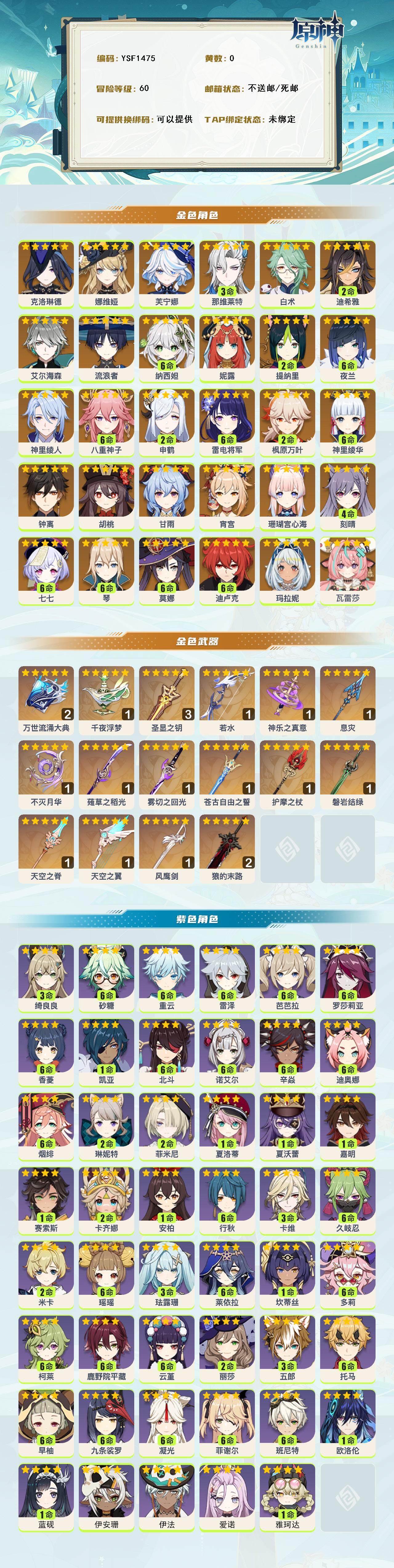 【ysf1475】60级/女主/32个五星角色/0命瓦雷莎/0命玛拉妮/0命克洛琳德/0命娜维娅/0命芙宁娜/3命那维莱特/0命白术/2命迪希雅/0命艾尔海森/0命流浪者/满命纳西妲/0命妮露/2命提纳里/满命夜兰/0命神里绫人/满命八重神子/2命申鹤/0命珊瑚宫心海/满命雷电将军/0命宵宫/满命神里绫华/2命枫原万叶/0命胡桃/0命甘雨/0命钟离/满命琴/4命刻晴/满命迪卢克/满命莫娜/满命七七/精2万世流涌大典/精1千夜浮梦/精3圣显之钥/精1若水/精1神乐之真意/精1息灾/精1薙草之稻光/精1不灭月华/精1雾切之回光/精1苍古自由之誓/精1护摩之杖/精1磐岩结绿/精2狼的末路/精1风鹰剑/精1天空之脊/精1天空之翼/1命雅珂达/0命爱诺/0命伊法/0命伊安珊/1命蓝砚/0命欧洛伦/2命卡齐娜/1命赛索斯/1命嘉明/1命夏沃蕾/0命夏洛蒂/2命菲米尼/2命琳妮特/3命绮良良/3命卡维/2命米卡/满命瑶瑶/3命珐露珊/满命莱依拉/1命坎蒂丝/满命多莉/满命柯莱/满命鹿野院平藏/满命久岐忍/满命云堇/3命五郎/满命托马/满命九条裟罗/满命早柚/满命烟绯/满命罗莎莉亚/满命辛焱/满命迪奥娜/满命砂糖/满命雷泽/满命菲谢尔/2命丽莎/满命北斗/满命香菱/1命安柏/满命班尼特/满命行秋/满命芭芭拉/满命凝光/满命诺艾尔/1命凯亚/满命重云