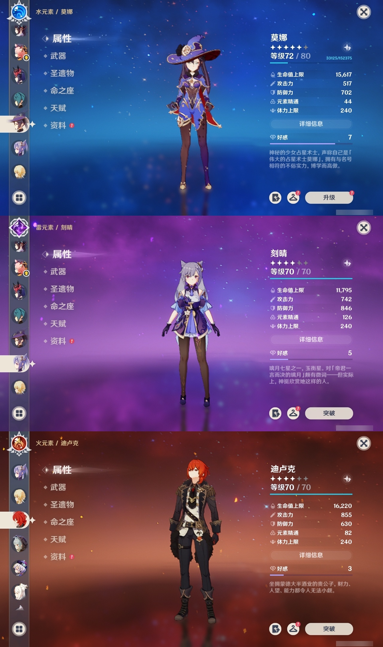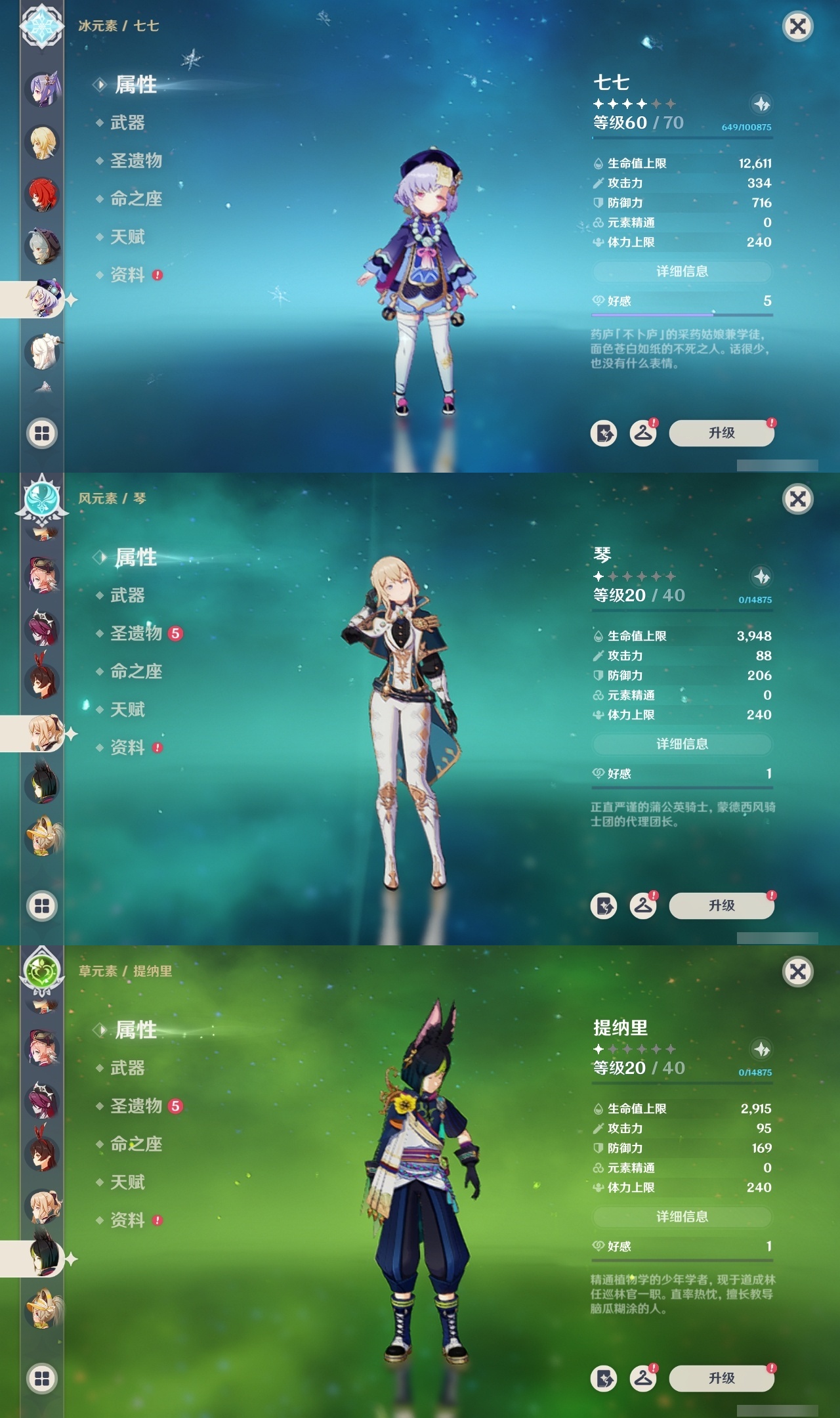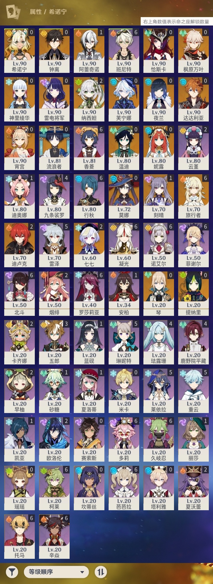 【原神】【lyys9592】冒险等级:59,五星数量:33,五星角色:迪卢克 2命七七 2命纳西妲 2命阿蕾奇诺 1命刻晴 1命莫娜琴希诺宁神里绫华温迪恰斯卡宵宫钟离达达利亚夜兰芙宁娜提纳里妮露流浪者枫原万叶雷电将军__五星武器:星鹫赤羽赤月之形飞雷之弦振风鹰剑和璞鸢四风原典天空之傲天空之卷天空之翼雾切之回光若水千夜浮梦__四星角色:班尼特 6命行秋 6命香菱 6命久岐忍 6命凝光 6命多莉 6命柯莱 6命芭芭拉 6命托马 6命辛焱 6命诺艾尔 6命罗莎莉亚 6命菲谢尔 6命北斗 6命莱依拉 5命重云 5命雷泽 5命琳妮特 5命九条裟罗 4命鹿野院平藏 4命珐露珊 4命五郎 3命卡齐娜 2命欧洛伦 2命云堇 2命早柚 2命烟绯 2命夏沃蕾 2命迪奥娜 1命砂糖 1命蓝砚 1命夏洛蒂 1命瑶瑶米卡坎蒂丝塔利雅赛索斯