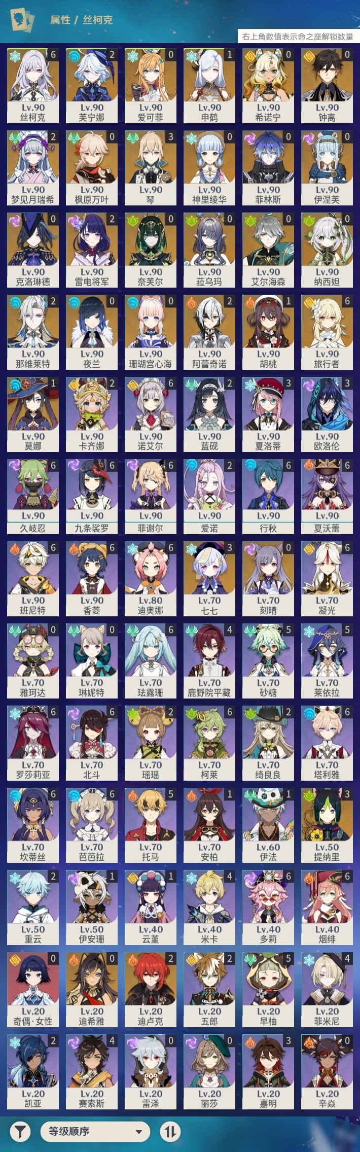 【原神】【lyys9666】冒险等级:60,五星数量:45,五星角色:丝柯克 6命七七 3命琴 3命提纳里 3命梦见月瑞希 2命那维莱特 2命芙宁娜 2命阿蕾奇诺 2命迪卢克 2命雷电将军 2命胡桃 1命莫娜 1命申鹤 1命珊瑚宫心海希诺宁神里绫华迪希雅钟离夜兰爱可菲伊涅芙纳西妲菈乌玛菲林斯艾尔海森奈芙尔枫原万叶克洛琳德刻晴__五星武器:万世流涌大典赤月之形苍耀裁叶萃光苍古自由之誓护摩之杖狼的末路四风原典天空之傲天空之脊天空之卷天空之翼雾切之回光薙草之稻光赦罪__四星角色:班尼特 6命行秋 6命九条裟罗 6命香菱 6命久岐忍 6命珐露珊 6命凝光 6命迪奥娜 6命坎蒂丝 6命多莉 6命柯莱 6命芭芭拉 6命烟绯 6命诺艾尔 6命罗莎莉亚 6命菲谢尔 6命北斗 6命夏沃蕾 6命塔利雅 6命砂糖 5命莱依拉 5命早柚 5命托马 5命鹿野院平藏 4命米卡 4命菲米尼 4命赛索斯 4命欧洛伦 3命夏洛蒂 3命嘉明 3命卡齐娜 2命绮良良 2命瑶瑶 2命蓝砚 2命五郎 2命重云 2命爱诺 2命云堇 1命伊法 1命伊安珊 1命奇偶·女性辛焱雷泽琳妮特