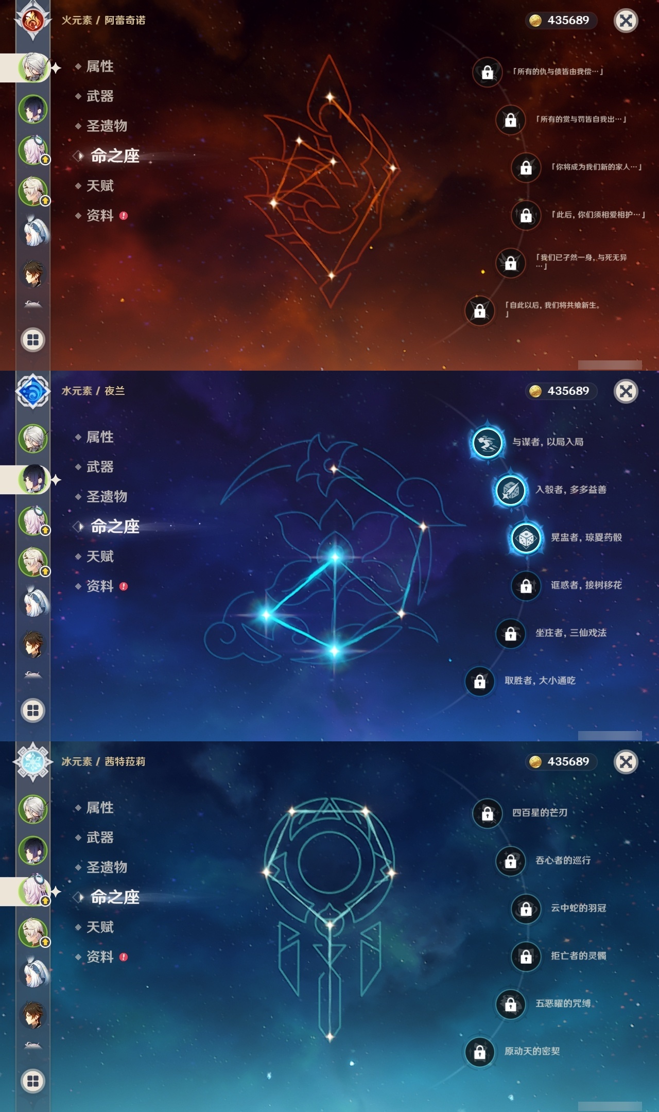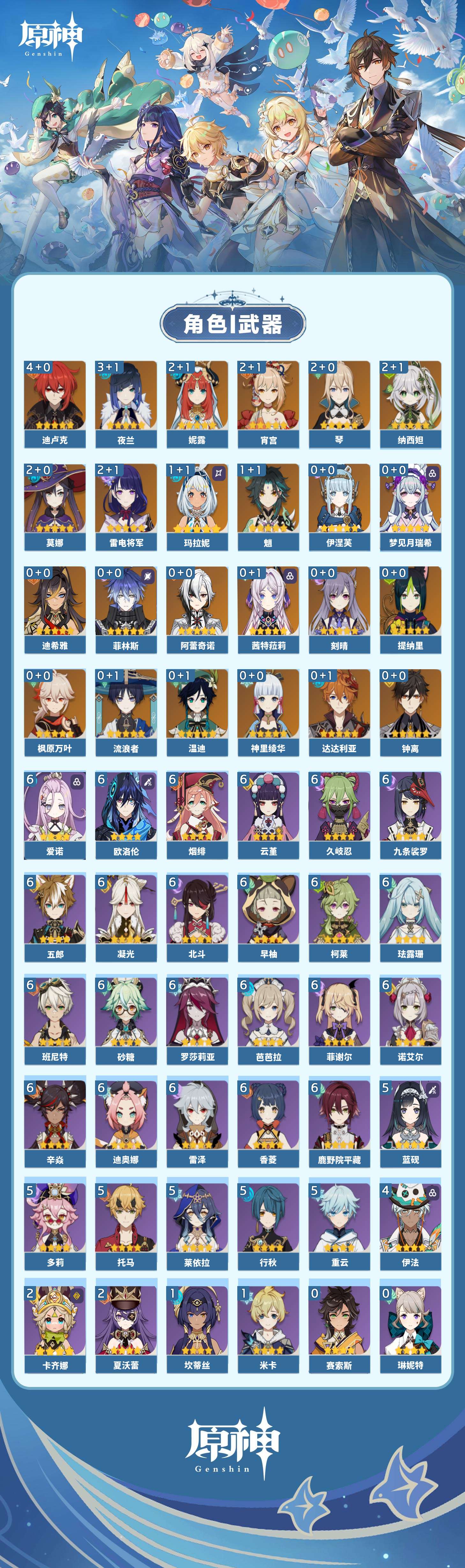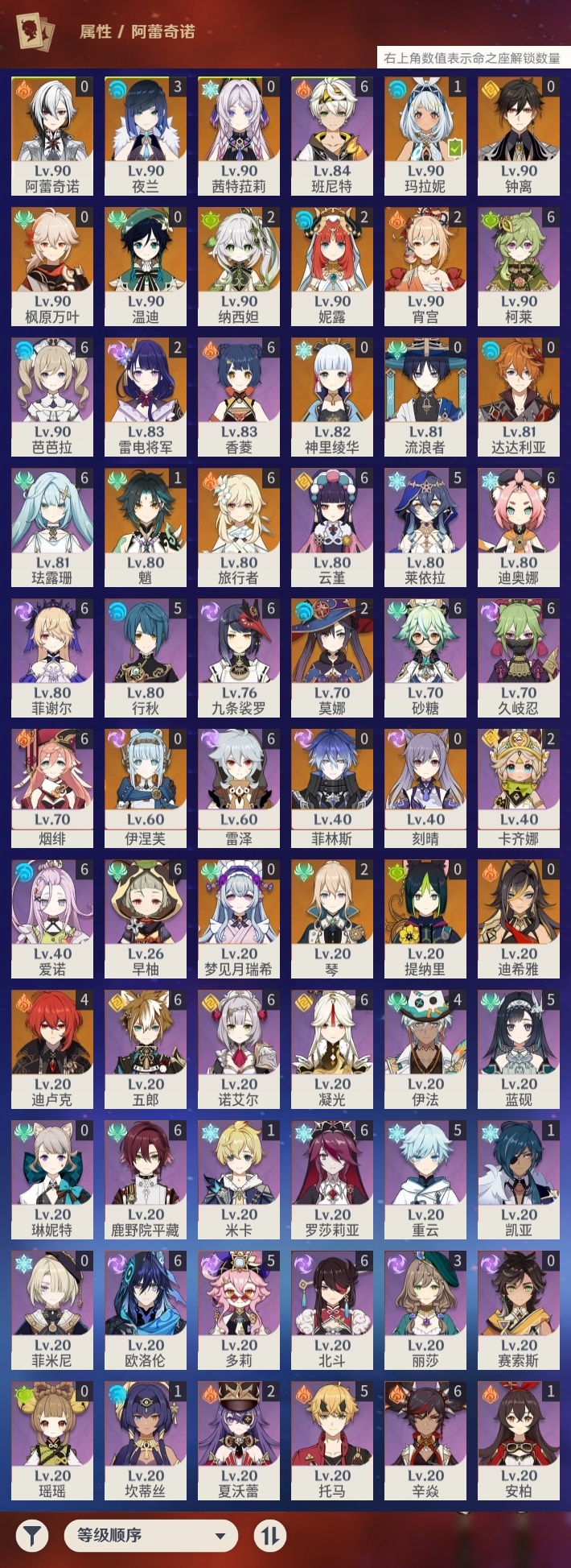 【原神】【lyys9844】冒险等级:58,五星数量:43,五星角色:迪卢克 4命夜兰 3命雷电将军 2命莫娜 2命琴 2命宵宫 2命妮露 2命纳西妲 2命玛拉妮 1命魈 1命神里绫华温迪茜特菈莉迪希雅钟离达达利亚梦见月瑞希提纳里阿蕾奇诺伊涅芙菲林斯流浪者枫原万叶刻晴__五星武器:冲浪时光祭星者之望图莱杜拉的回忆阿莫斯之弓飞雷之弦振和璞鸢护摩之杖磐岩结绿天空之傲天空之脊天空之刃薙草之稻光终末嗟叹之诗斫峰之刃赤角石溃杵冬极白星若水圣显之钥千夜浮梦__四星角色:班尼特 6命九条裟罗 6命香菱 6命久岐忍 6命鹿野院平藏 6命珐露珊 6命凝光 6命迪奥娜 6命砂糖 6命柯莱 6命芭芭拉 6命欧洛伦 6命云堇 6命早柚 6命五郎 6命烟绯 6命辛焱 6命诺艾尔 6命罗莎莉亚 6命雷泽 6命菲谢尔 6命北斗 6命爱诺 6命行秋 5命莱依拉 5命多莉 5命蓝砚 5命托马 5命重云 5命伊法 4命卡齐娜 2命夏沃蕾 2命米卡 1命坎蒂丝 1命瑶瑶菲米尼琳妮特赛索斯