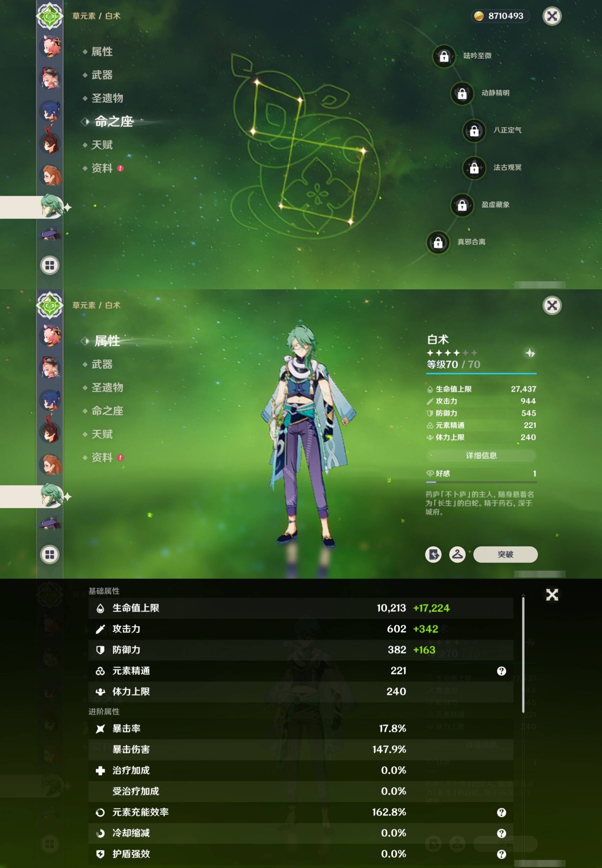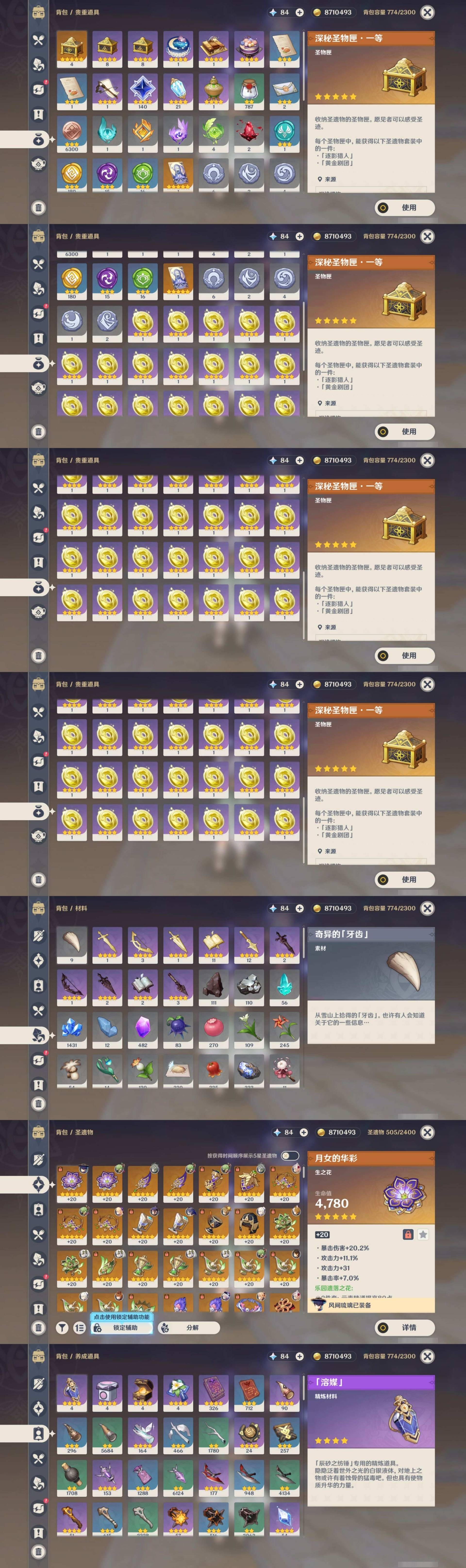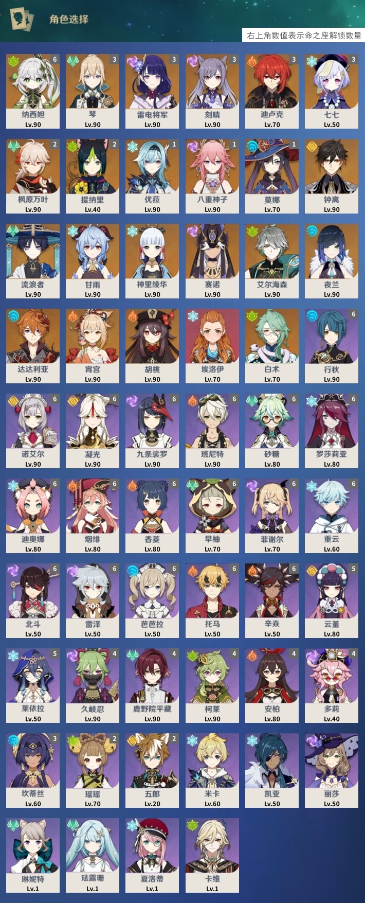 [15056623]79黄 风系:0命流浪者/2命枫原万叶/3命琴 火系:0命宵宫/0命胡桃/3命迪卢克 水系:0命夜兰/0命达达利亚/1命莫娜 冰系:1命优菈/0命甘雨/0命神里绫华/0命埃洛伊/3命七七 岩系:0命钟离 雷系:0命赛诺/1命八重神子/3命雷电将军/3命刻晴 草系:6命纳西妲/0命艾尔海森/0命白术/2命提纳里 [四星角色等级及命座] 风系: 4命鹿野院平藏/6命砂糖/6命早柚/0命琳妮特/0命珐露珊 火系: 6命班尼特/6命烟绯/6命香菱/4命安柏/6命托马/6命辛焱 水系:6命行秋/3命坎蒂丝/6命芭芭拉 冰系:6命罗莎莉亚/6命迪奥娜/0命米卡/6命重云/0命凯亚/5命莱依拉/0命夏洛蒂 岩系:6命诺艾尔/6命凝光/5命云堇/2命五郎 雷系:4命久岐忍/6命九条裟罗/6命菲谢尔/6命北斗/6命雷泽/0命丽莎/4命多莉 草系:4命柯莱/2命瑶瑶/0命卡维 [角色经验书] 紫色326/蓝色712 [小物品] 异梦溶媒21/嬗变之尘787