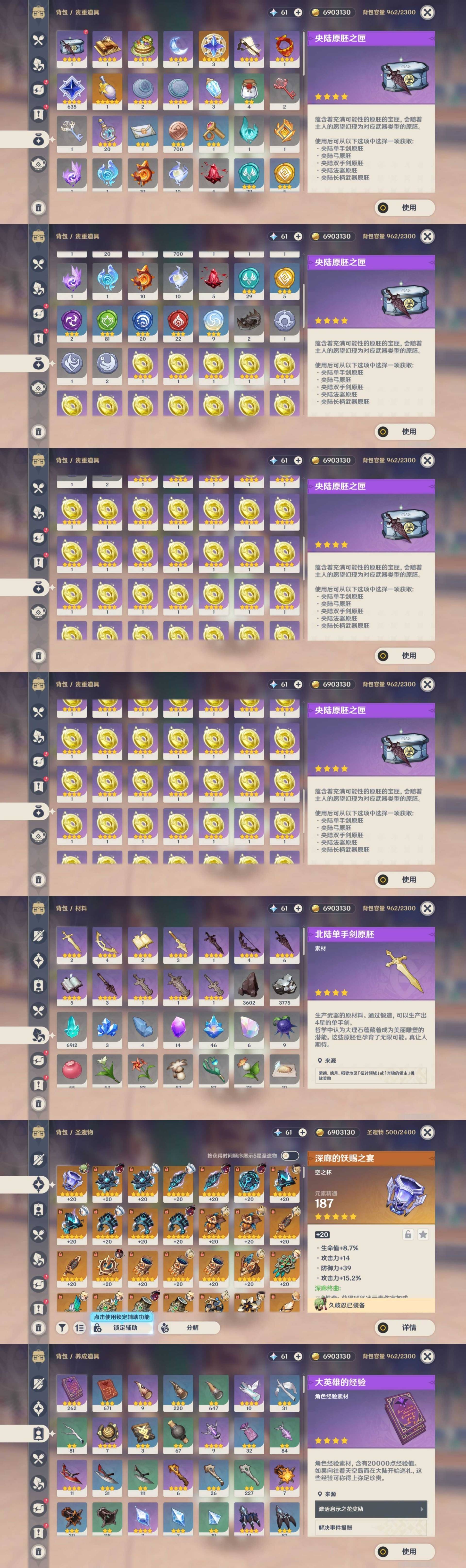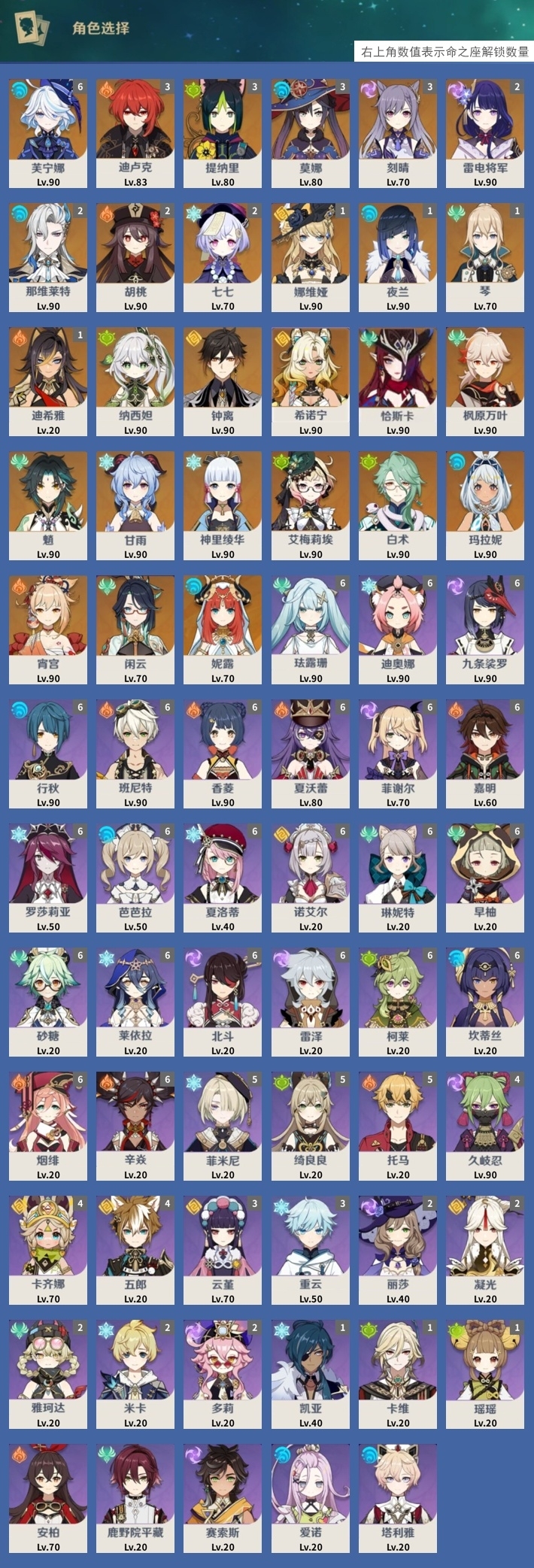[15094609]82黄 风系:0命恰斯卡/0命枫原万叶/0命魈/0命闲云/1命琴 火系:0命宵宫/2命胡桃/3命迪卢克/1命迪希雅 水系:6命芙宁娜/0命玛拉妮/2命那维莱特/1命夜兰/3命莫娜/0命妮露 冰系:0命甘雨/0命神里绫华/2命七七 岩系:0命钟离/0命希诺宁/1命娜维娅 雷系:2命雷电将军/3命刻晴 草系:0命纳西妲/0命艾梅莉埃/0命白术/3命提纳里 [四星角色等级及命座] 风系: 6命珐露珊/6命琳妮特/0命鹿野院平藏/6命早柚/6命砂糖 火系: 6命班尼特/6命香菱/6命夏沃蕾/0命安柏/6命嘉明/5命托马/6命烟绯/6命辛焱 水系:6命行秋/6命芭芭拉/0命爱诺/0命塔利雅/6命坎蒂丝 冰系:6命迪奥娜/6命罗莎莉亚/3命重云/6命夏洛蒂/1命凯亚/5命菲米尼/2命米卡/6命莱依拉 岩系:3命云堇/4命五郎/6命诺艾尔/2命凝光 雷系:4命久岐忍/6命九条裟罗/6命菲谢尔/2命丽莎/0命赛索斯/2命多莉/6命北斗/6命雷泽 草系:1命卡维/1命瑶瑶/6命柯莱/5命绮良良 [角色经验书] 紫色262/蓝色671 [小物品] 脆弱树脂7/异梦溶媒3/嬗变之尘4 [特殊材料] 东风之翎10/东风之爪7/东风的吐息7/北风之尾3/北风之环4/北风的魂匣8/吞天之鲸·只角4 魔王之刃·残片5/武炼之魂·孤影4/龙王之冕3/血玉之枝4/鎏金之鳞4/智识之冕29
