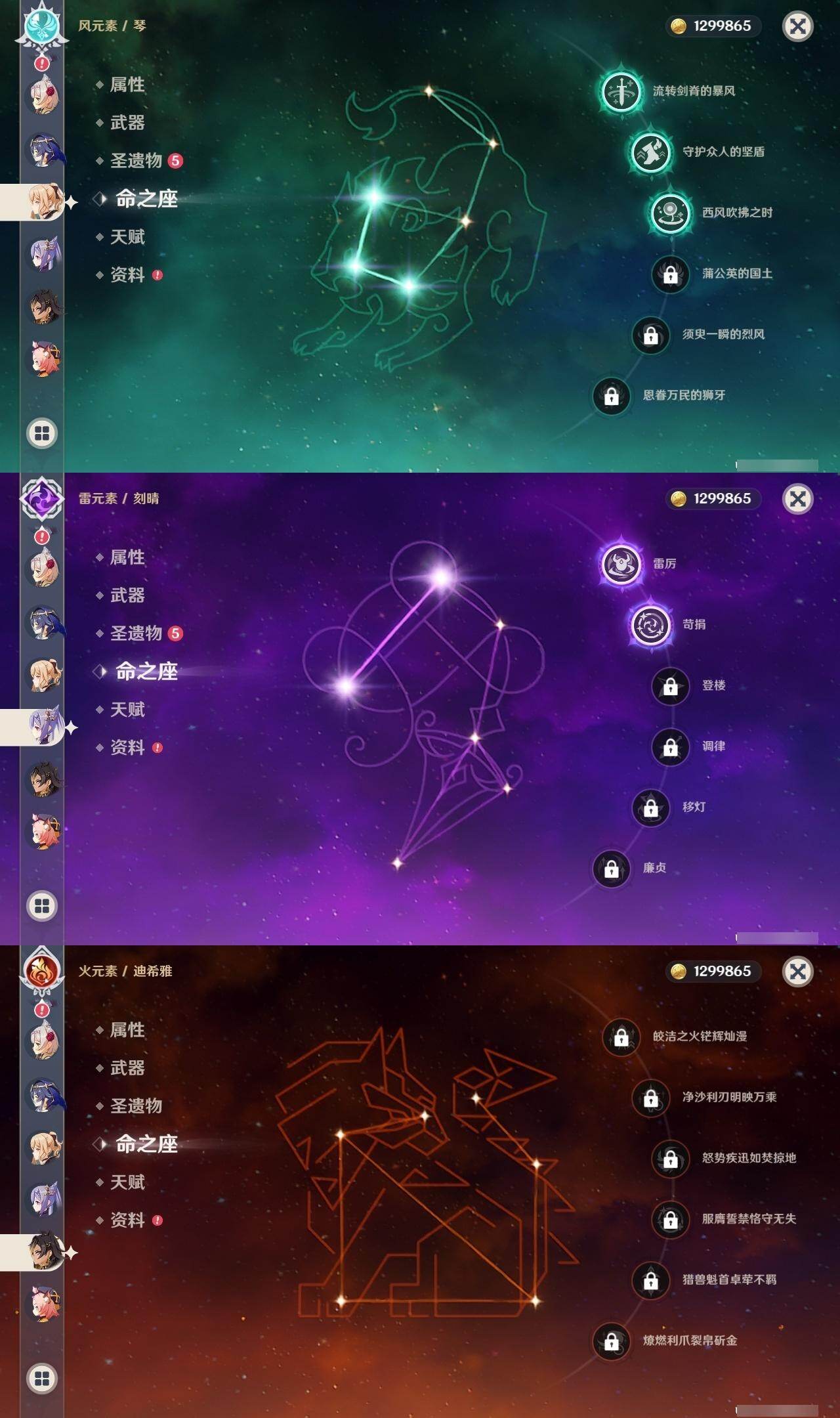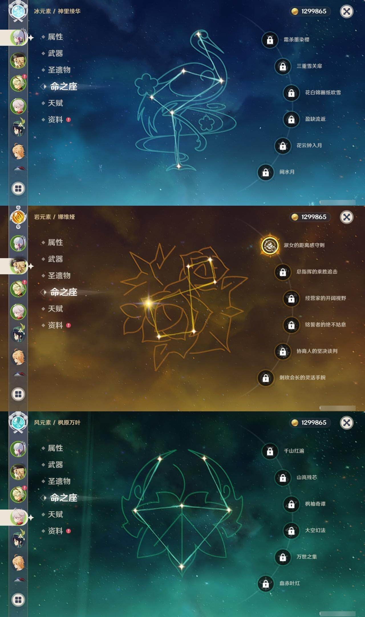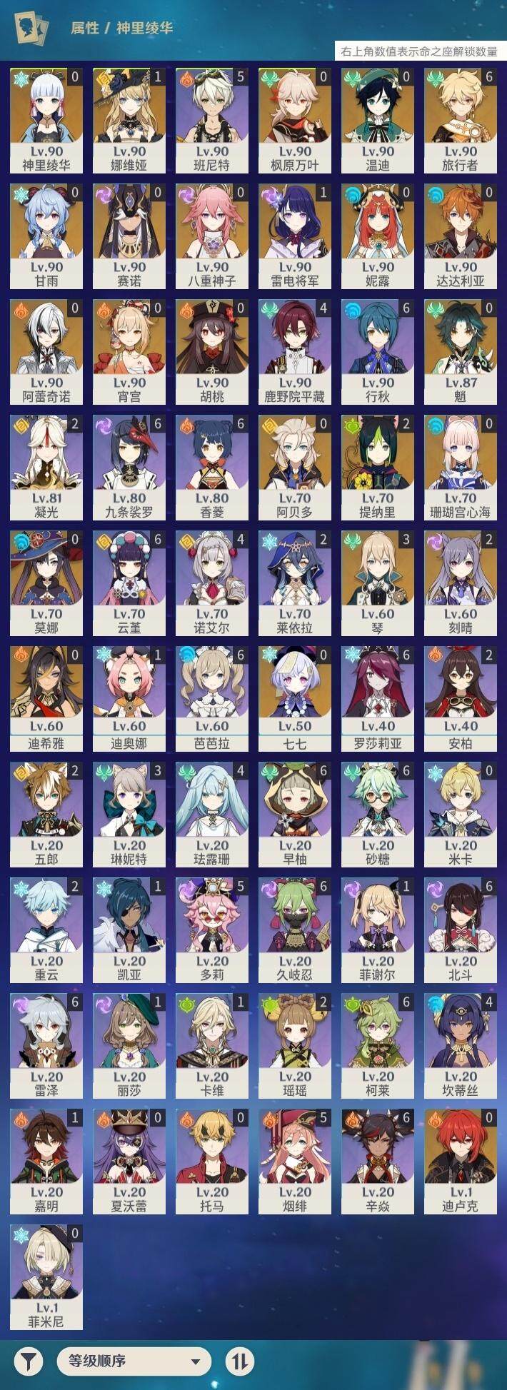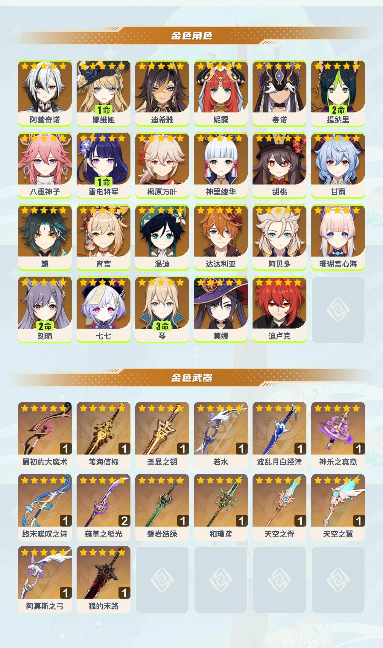 58级/48黄/男主/23个五星角色/15个五星武器 0命阿蕾奇诺1命娜维娅0命迪希雅0命妮露0命赛诺2命提纳里0命八重神子1命雷电将军0命枫原万叶0命神里绫华0命胡桃0命甘雨0命魈0命宵宫0命温迪0命达达利亚0命阿贝多0命珊瑚宫心海2命刻晴0命七七3命琴0命莫娜0命迪卢克精1最初的大魔术精1苇海信标精1圣显之钥精1若水精1波乱月白经津精1神乐之真意精1终末嗟叹之诗精2薙草之稻光精1磐岩结绿精1和璞鸢精1天空之脊精1天空之翼精1阿莫斯之弓精1狼的末路