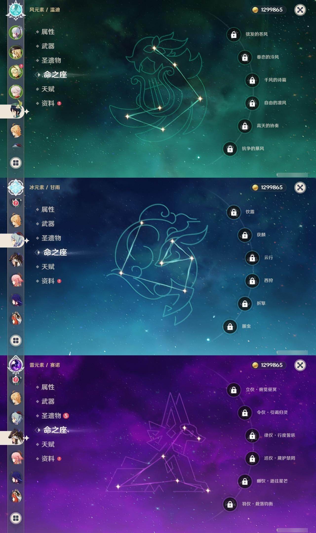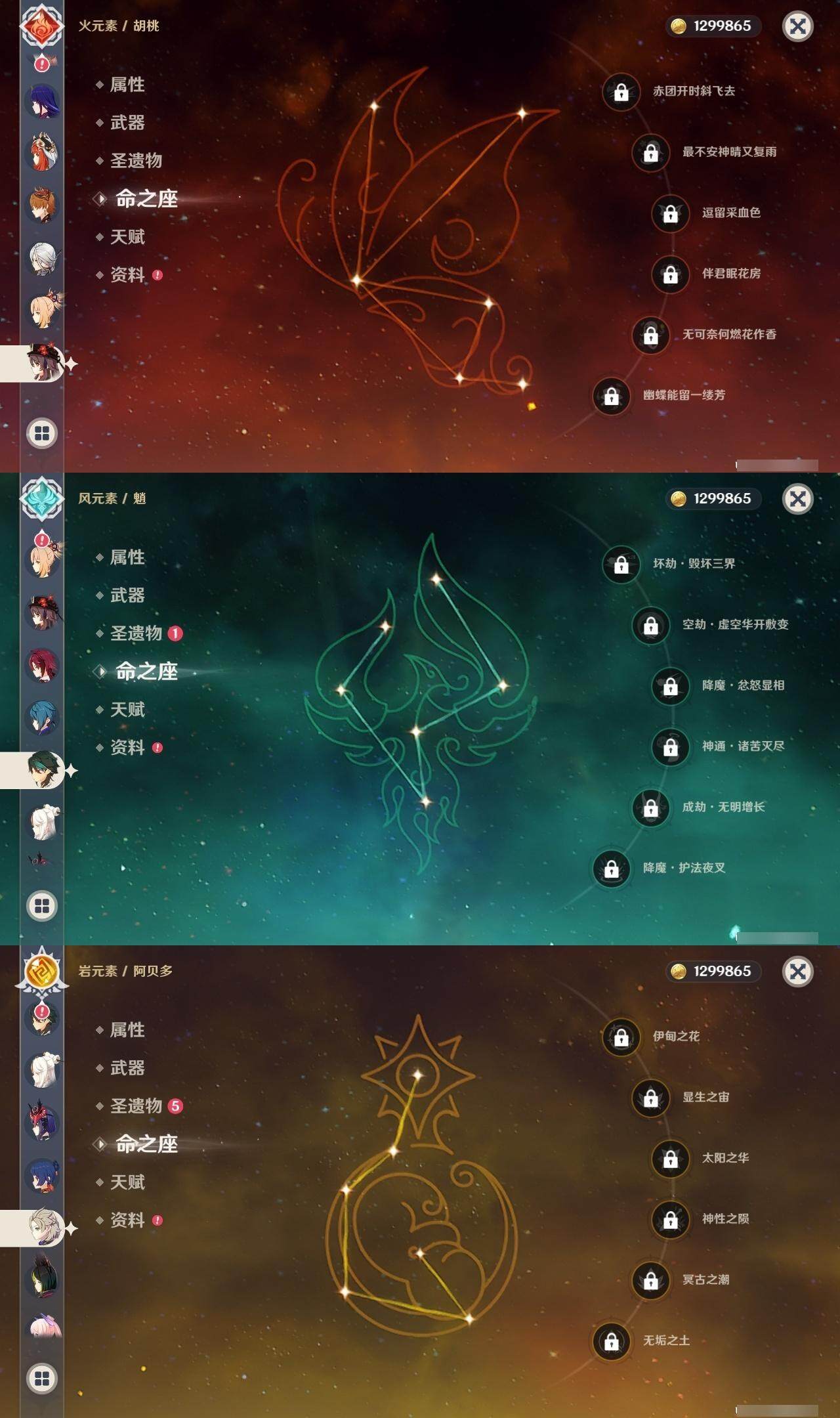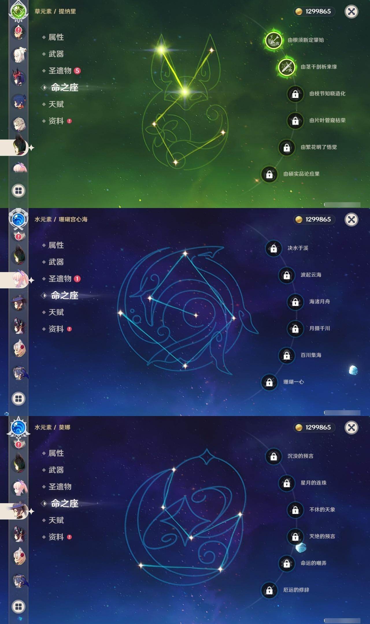 58级/48黄/男主/23个五星角色/15个五星武器 0命阿蕾奇诺1命娜维娅0命迪希雅0命妮露0命赛诺2命提纳里0命八重神子1命雷电将军0命枫原万叶0命神里绫华0命胡桃0命甘雨0命魈0命宵宫0命温迪0命达达利亚0命阿贝多0命珊瑚宫心海2命刻晴0命七七3命琴0命莫娜0命迪卢克精1最初的大魔术精1苇海信标精1圣显之钥精1若水精1波乱月白经津精1神乐之真意精1终末嗟叹之诗精2薙草之稻光精1磐岩结绿精1和璞鸢精1天空之脊精1天空之翼精1阿莫斯之弓精1狼的末路