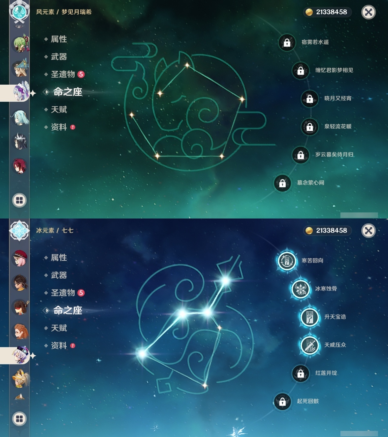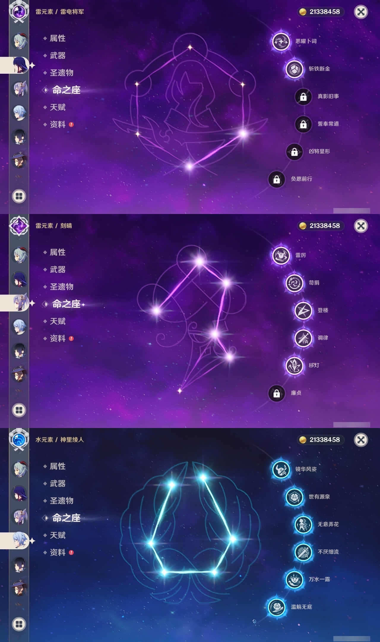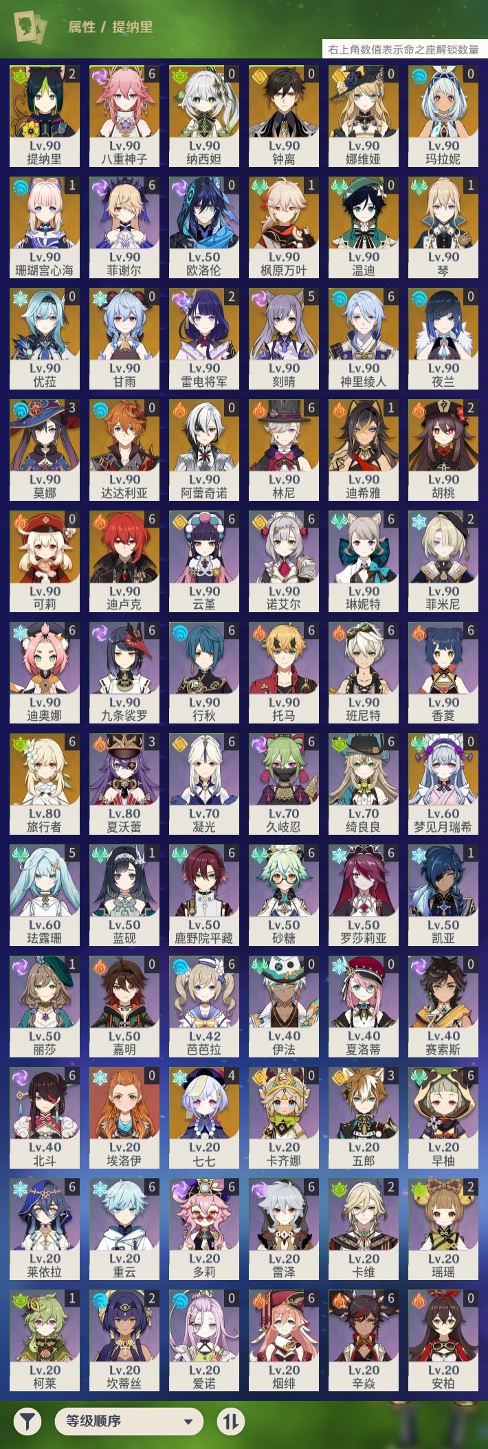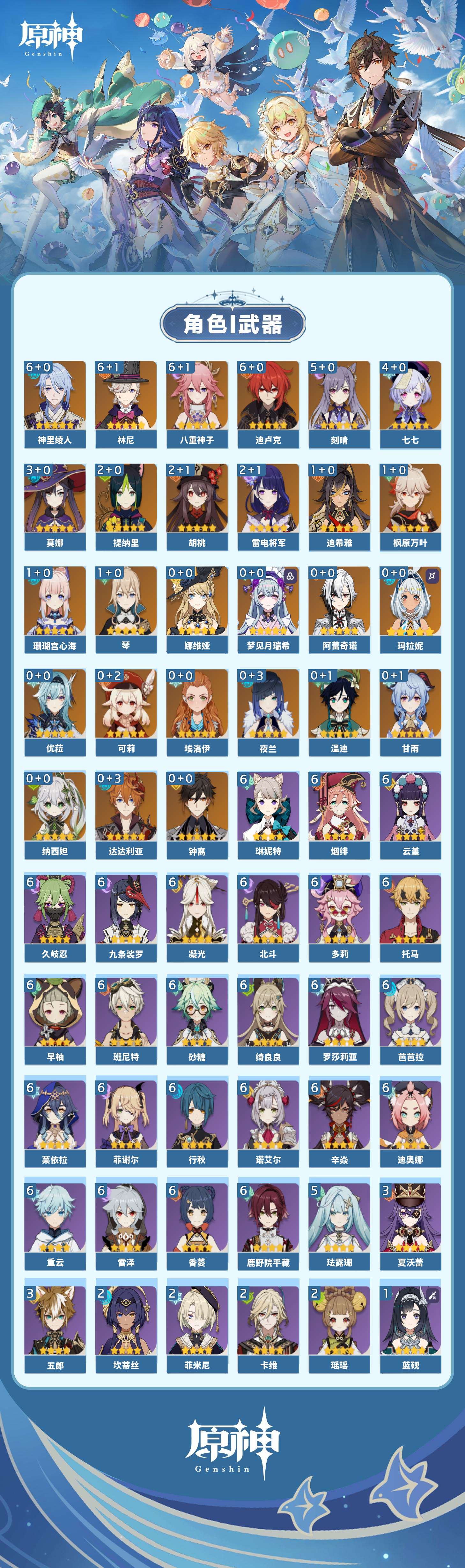 【原神】满命,冒险等级:60,五星数量:46,五星角色:林尼 6命迪卢克 6命八重神子 6命神里绫人 6命刻晴 5命七七 4命莫娜 3命胡桃 2命雷电将军 2命提纳里 2命迪希雅 1命枫原万叶 1命琴 1命珊瑚宫心海 1命玛拉妮温迪优菈钟离达达利亚梦见月瑞希夜兰娜维娅阿蕾奇诺纳西妲甘雨可莉__五星武器:风鹰剑 5精无工之剑 3精冬极白星 3精若水 3精四风原典 2精天空之脊 2精天空之卷 2精最初的大魔术阿莫斯之弓飞雷之弦振护摩之杖磐岩结绿天空之傲天空之翼雾切之回光薙草之稻光终末嗟叹之诗息灾神乐之真意__四星角色:班尼特 6命行秋 6命九条裟罗 6命香菱 6命久岐忍 6命鹿野院平藏 6命凝光 6命迪奥娜 6命砂糖 6命绮良良 6命莱依拉 6命多莉 6命芭芭拉 6命云堇 6命早柚 6命托马 6命烟绯 6命重云 6命辛焱 6命诺艾尔 6命罗莎莉亚 6命雷泽 6命菲谢尔 6命北斗 6命琳妮特 6命珐露珊 5命五郎 3命夏沃蕾 3命瑶瑶 2命坎蒂丝 2命卡维 2命菲米尼 2命柯莱 1命蓝砚 1命埃洛伊卡齐娜欧洛伦夏洛蒂嘉明伊法爱诺赛索斯