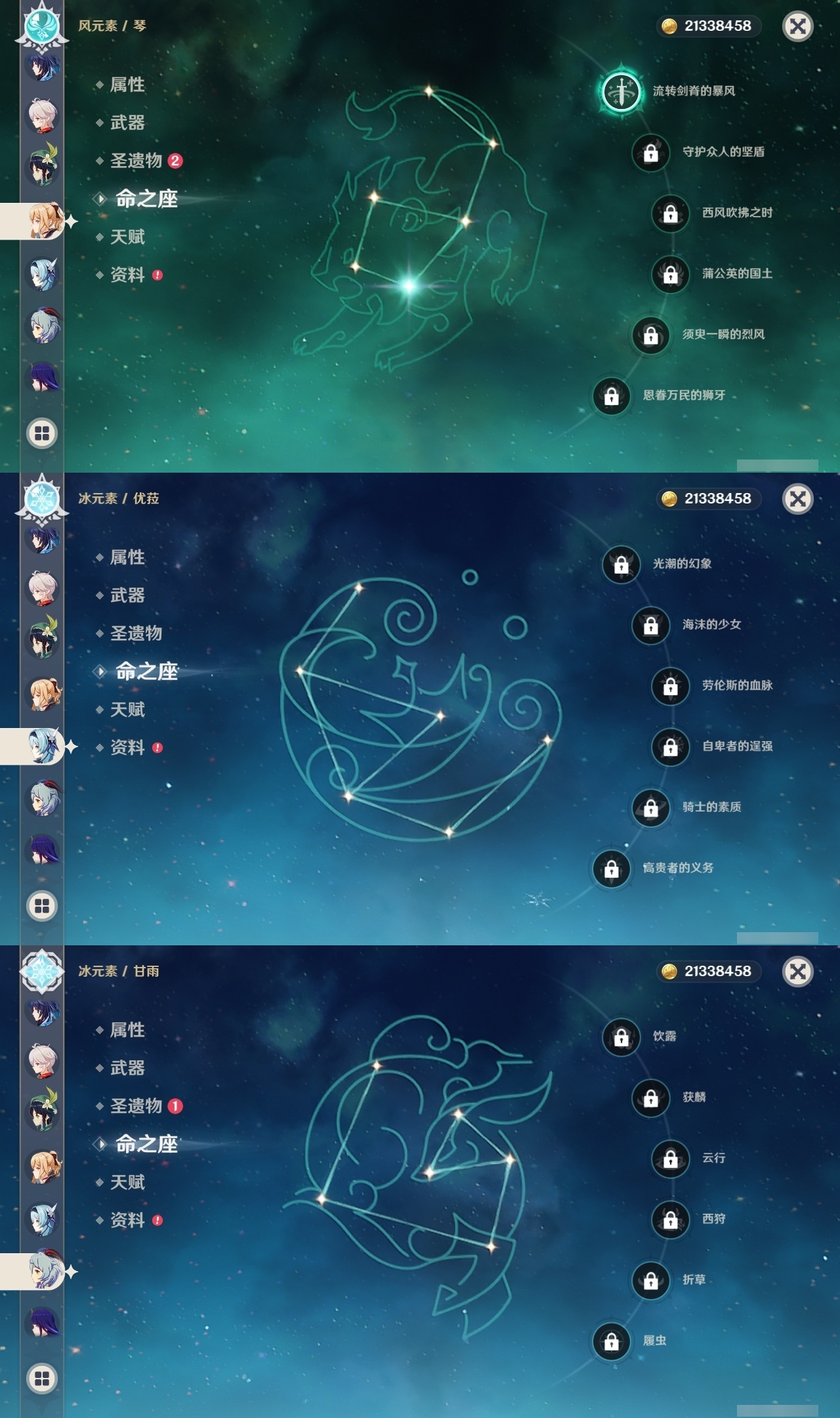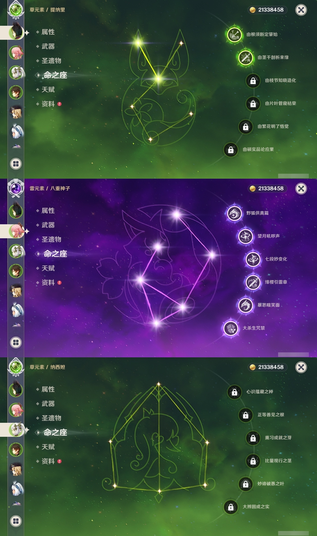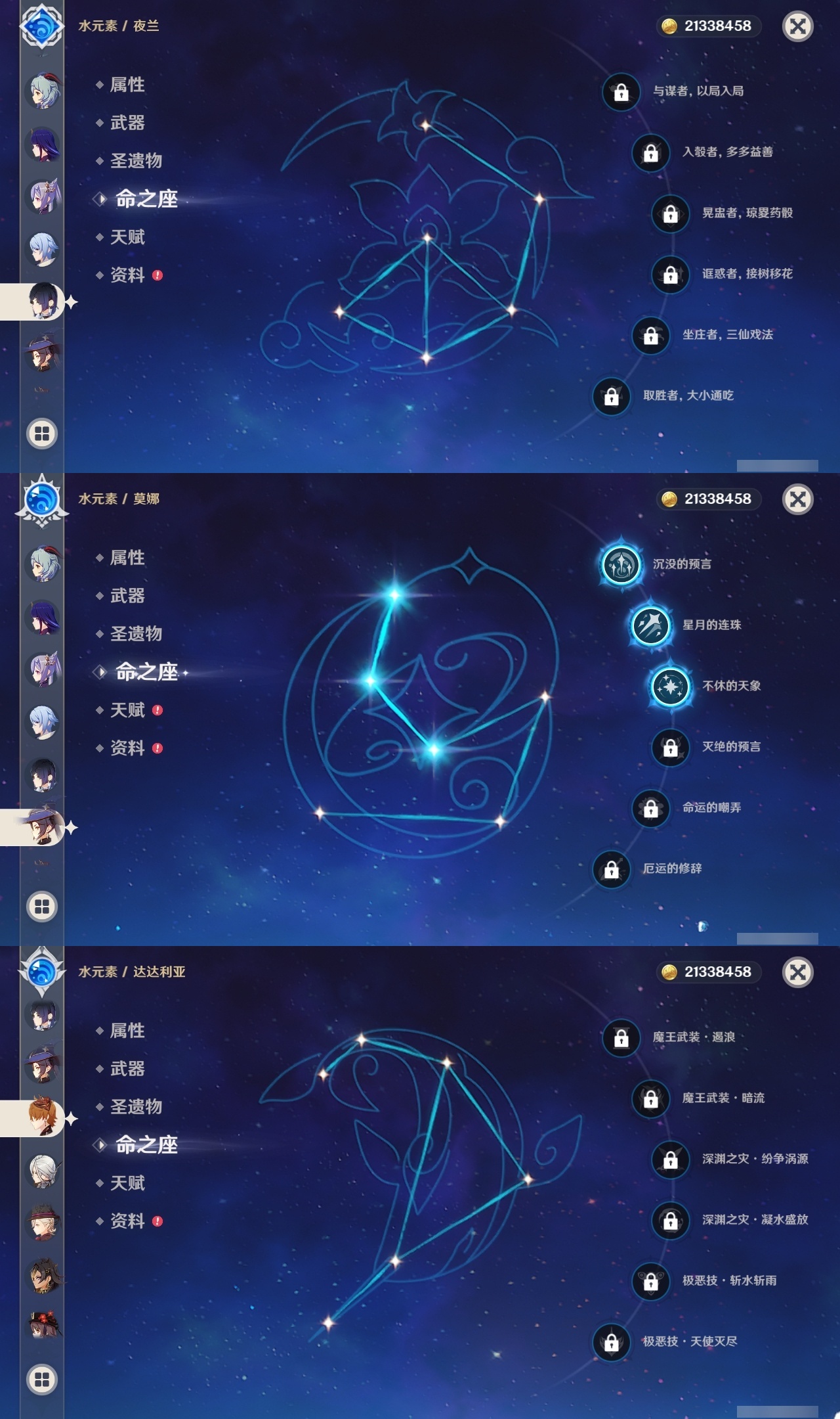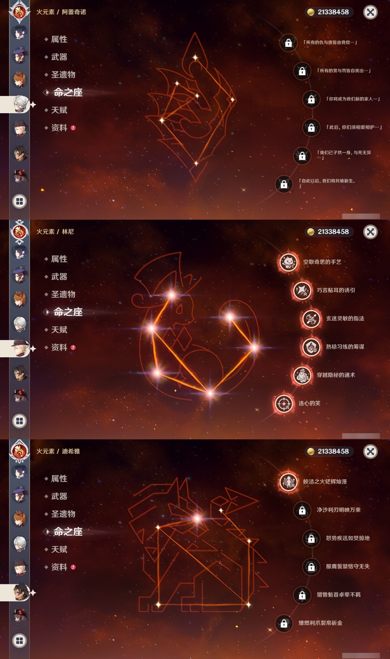 【原神】满命,冒险等级:60,五星数量:46,五星角色:林尼 6命迪卢克 6命八重神子 6命神里绫人 6命刻晴 5命七七 4命莫娜 3命胡桃 2命雷电将军 2命提纳里 2命迪希雅 1命枫原万叶 1命琴 1命珊瑚宫心海 1命玛拉妮温迪优菈钟离达达利亚梦见月瑞希夜兰娜维娅阿蕾奇诺纳西妲甘雨可莉__五星武器:风鹰剑 5精无工之剑 3精冬极白星 3精若水 3精四风原典 2精天空之脊 2精天空之卷 2精最初的大魔术阿莫斯之弓飞雷之弦振护摩之杖磐岩结绿天空之傲天空之翼雾切之回光薙草之稻光终末嗟叹之诗息灾神乐之真意__四星角色:班尼特 6命行秋 6命九条裟罗 6命香菱 6命久岐忍 6命鹿野院平藏 6命凝光 6命迪奥娜 6命砂糖 6命绮良良 6命莱依拉 6命多莉 6命芭芭拉 6命云堇 6命早柚 6命托马 6命烟绯 6命重云 6命辛焱 6命诺艾尔 6命罗莎莉亚 6命雷泽 6命菲谢尔 6命北斗 6命琳妮特 6命珐露珊 5命五郎 3命夏沃蕾 3命瑶瑶 2命坎蒂丝 2命卡维 2命菲米尼 2命柯莱 1命蓝砚 1命埃洛伊卡齐娜欧洛伦夏洛蒂嘉明伊法爱诺赛索斯