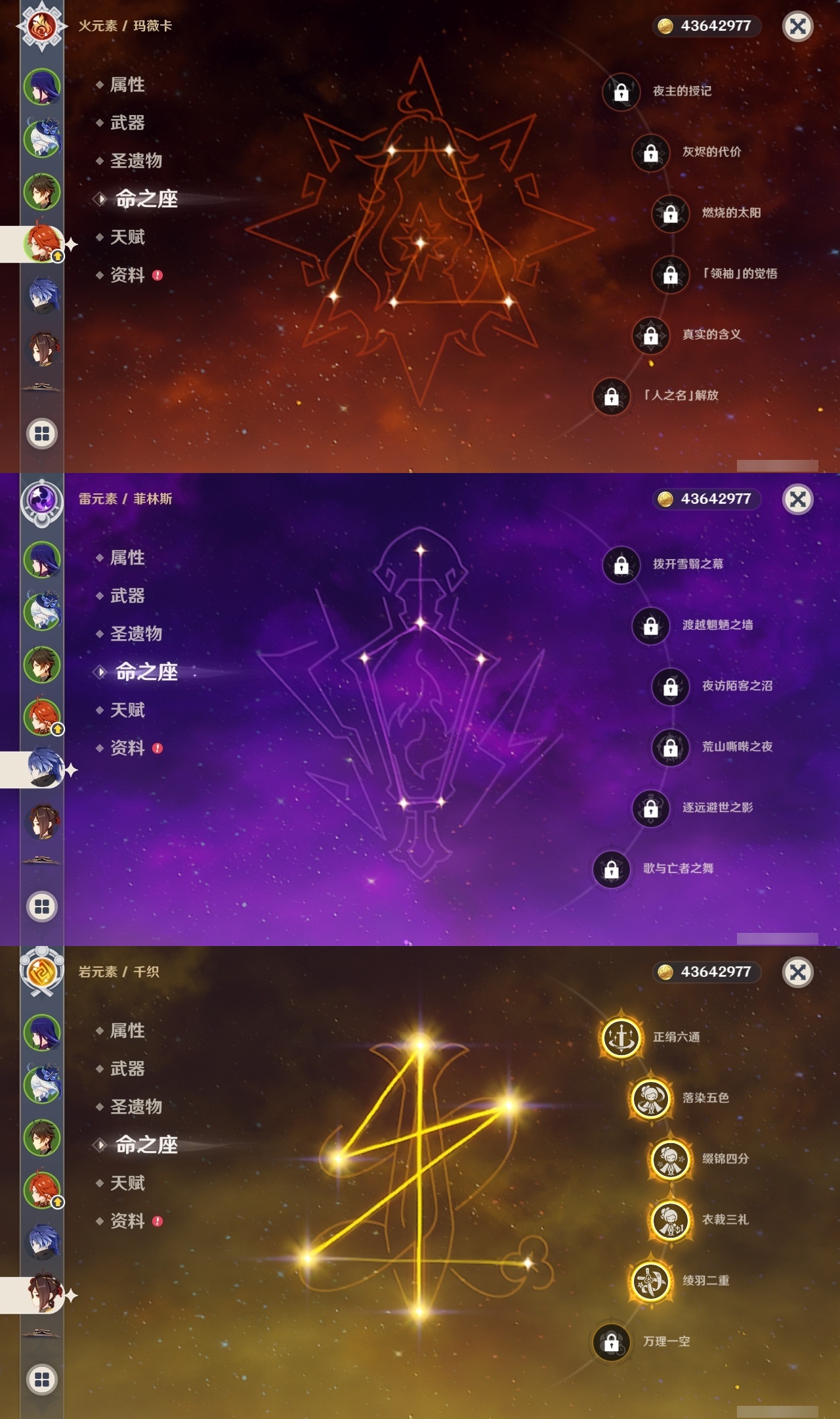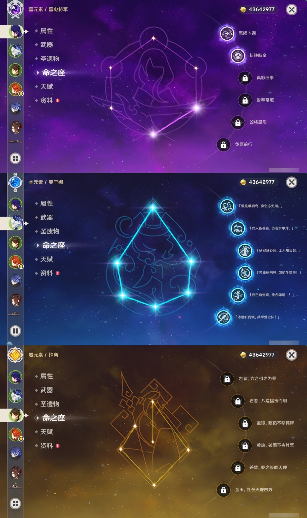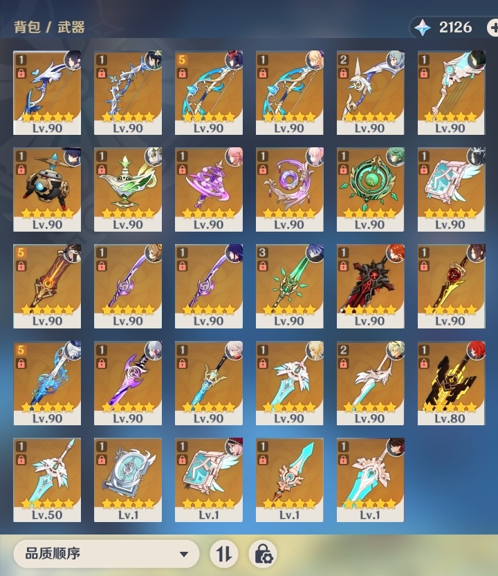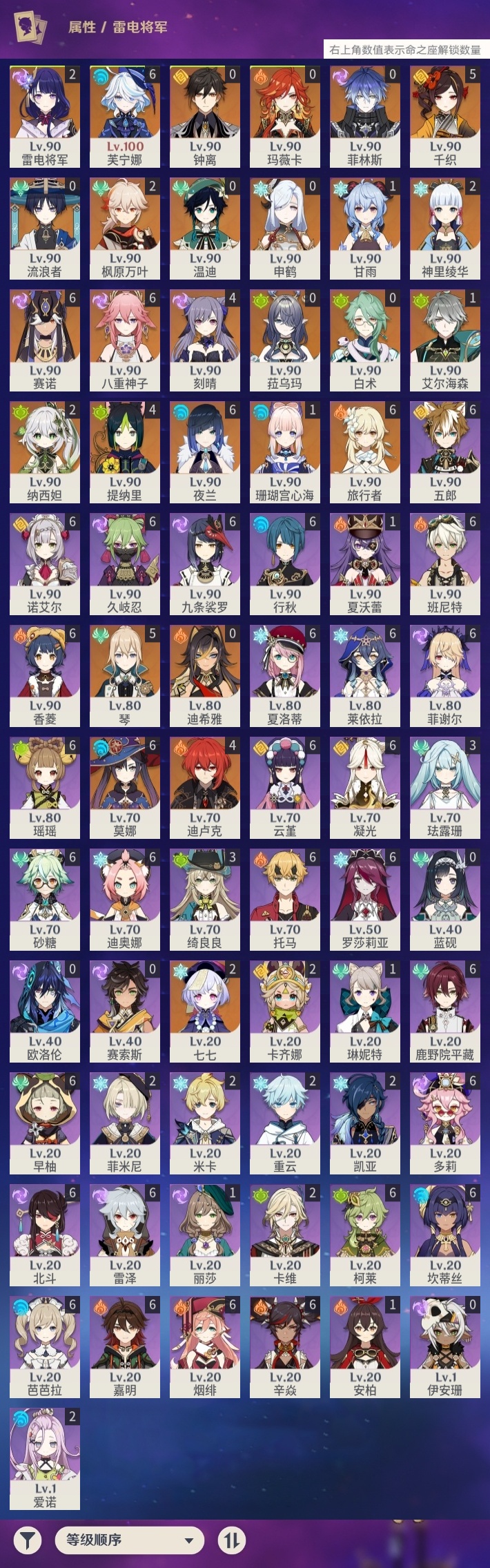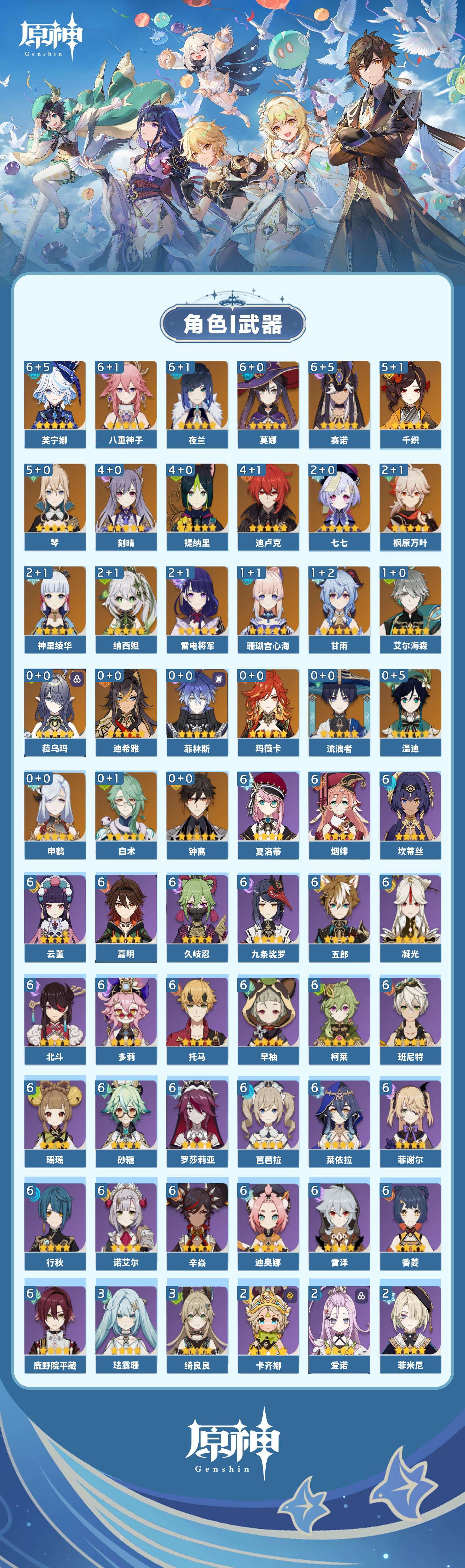 【原神】满命,冒险等级:60,五星数量:52,五星角色:芙宁娜 6命莫娜 6命八重神子 6命夜兰 6命赛诺 6命千织 5命琴 5命迪卢克 4命刻晴 4命提纳里 4命枫原万叶 2命雷电将军 2命七七 2命神里绫华 2命纳西妲 2命甘雨 1命珊瑚宫心海 1命艾尔海森 1命白术温迪玛薇卡迪希雅钟离申鹤菈乌玛菲林斯流浪者__五星武器:静水流涌之辉 5精终末嗟叹之诗 5精赤沙之杖 5精和璞鸢 3精阿莫斯之弓 2精风鹰剑 2精碧落之珑金流监督有乐御簾切不灭月华苍古自由之誓狼的末路四风原典天空之傲天空之脊天空之卷天空之刃天空之翼无工之剑雾切之回光薙草之稻光冬极白星神乐之真意若水千夜浮梦__四星角色:班尼特 6命行秋 6命九条裟罗 6命香菱 6命久岐忍 6命鹿野院平藏 6命凝光 6命迪奥娜 6命砂糖 6命瑶瑶 6命莱依拉 6命坎蒂丝 6命多莉 6命柯莱 6命芭芭拉 6命云堇 6命早柚 6命托马 6命五郎 6命烟绯 6命辛焱 6命诺艾尔 6命罗莎莉亚 6命雷泽 6命菲谢尔 6命北斗 6命夏洛蒂 6命嘉明 6命珐露珊 3命绮良良 3命卡齐娜 2命米卡 2命卡维 2命重云 2命菲米尼 2命爱诺 2命琳妮特 1命夏沃蕾 1命欧洛伦蓝砚伊安珊赛索斯