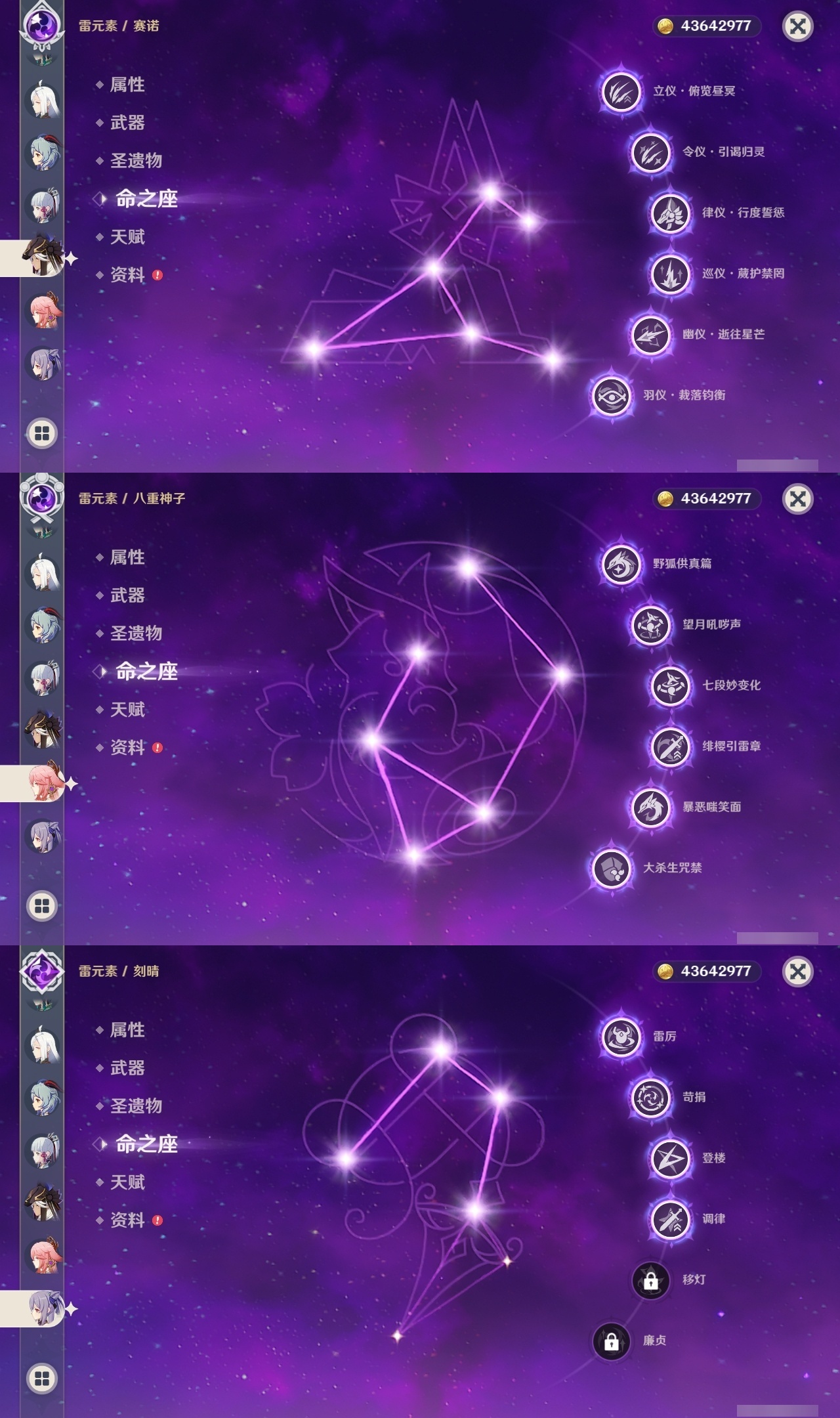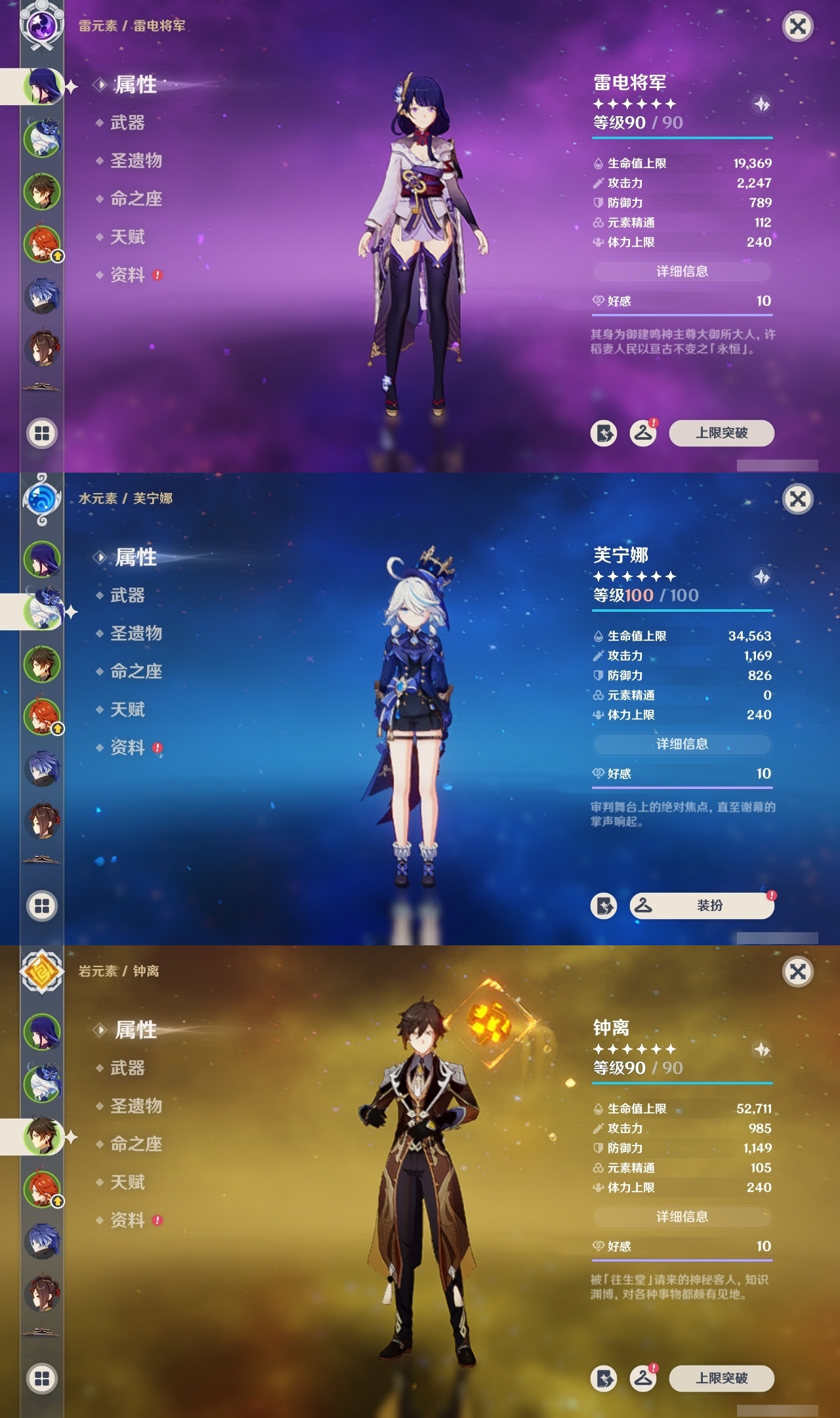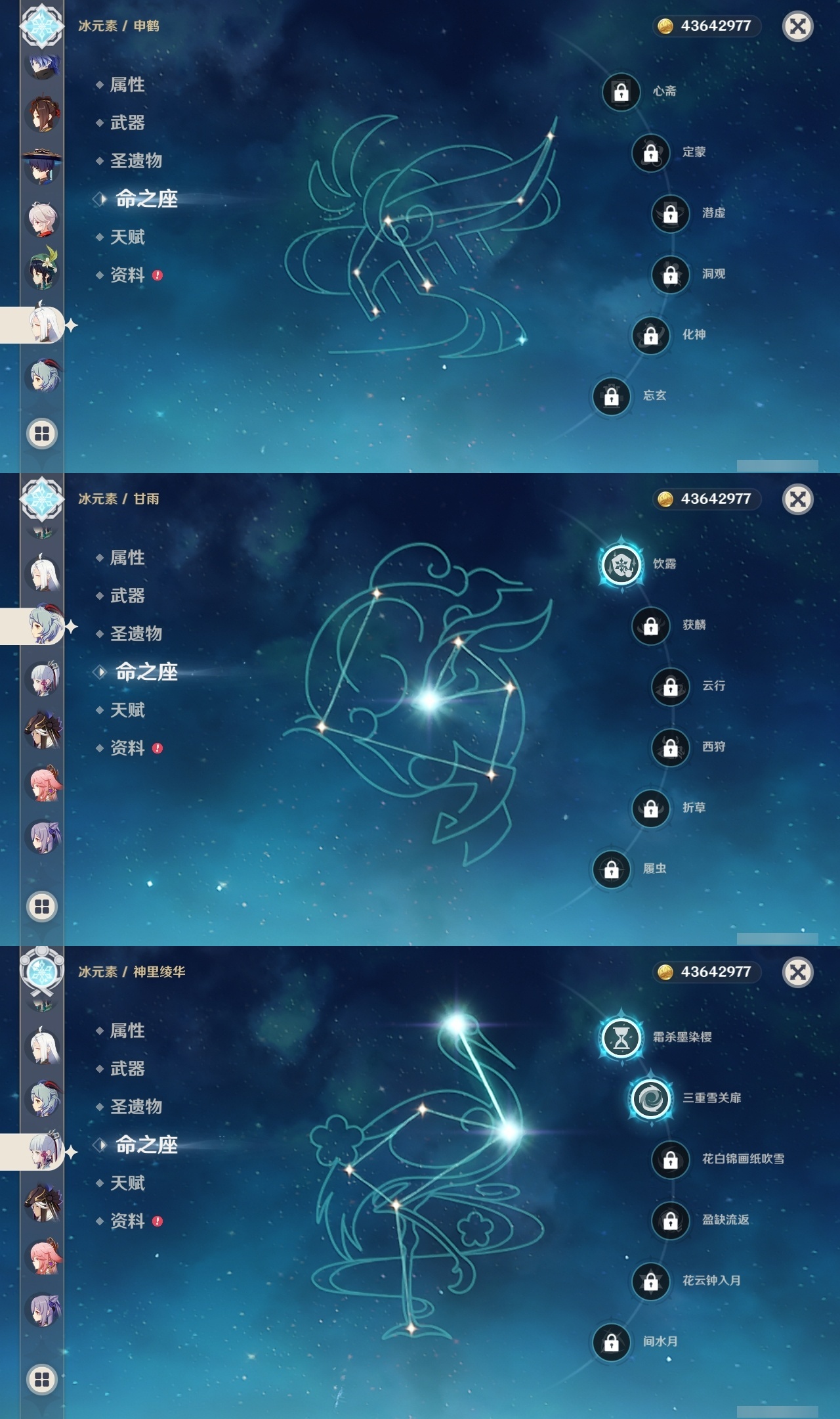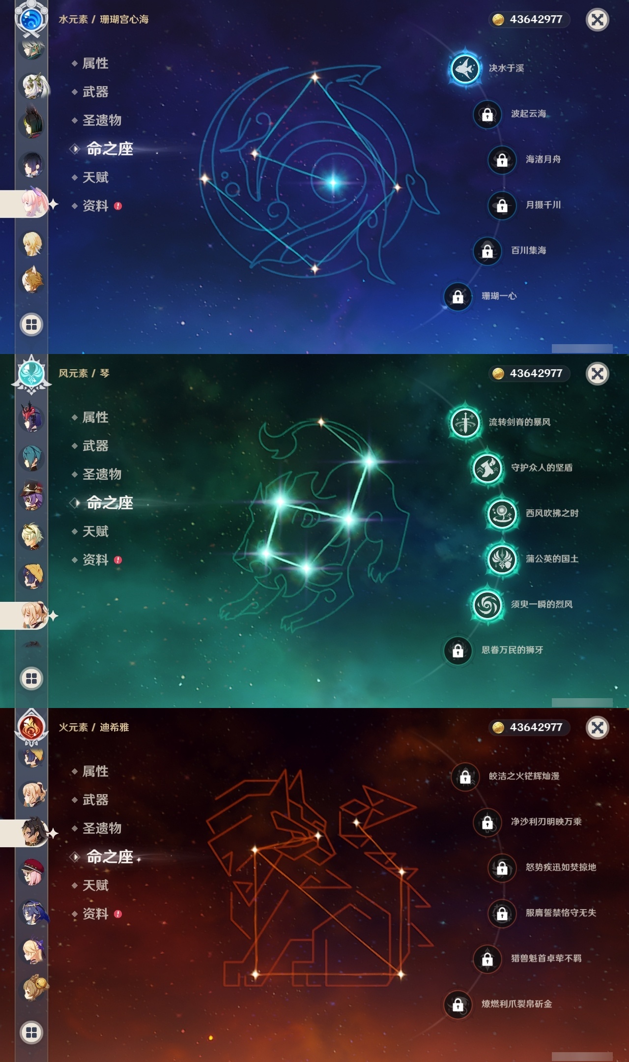 【原神】满命,冒险等级:60,五星数量:52,五星角色:芙宁娜 6命莫娜 6命八重神子 6命夜兰 6命赛诺 6命千织 5命琴 5命迪卢克 4命刻晴 4命提纳里 4命枫原万叶 2命雷电将军 2命七七 2命神里绫华 2命纳西妲 2命甘雨 1命珊瑚宫心海 1命艾尔海森 1命白术温迪玛薇卡迪希雅钟离申鹤菈乌玛菲林斯流浪者__五星武器:静水流涌之辉 5精终末嗟叹之诗 5精赤沙之杖 5精和璞鸢 3精阿莫斯之弓 2精风鹰剑 2精碧落之珑金流监督有乐御簾切不灭月华苍古自由之誓狼的末路四风原典天空之傲天空之脊天空之卷天空之刃天空之翼无工之剑雾切之回光薙草之稻光冬极白星神乐之真意若水千夜浮梦__四星角色:班尼特 6命行秋 6命九条裟罗 6命香菱 6命久岐忍 6命鹿野院平藏 6命凝光 6命迪奥娜 6命砂糖 6命瑶瑶 6命莱依拉 6命坎蒂丝 6命多莉 6命柯莱 6命芭芭拉 6命云堇 6命早柚 6命托马 6命五郎 6命烟绯 6命辛焱 6命诺艾尔 6命罗莎莉亚 6命雷泽 6命菲谢尔 6命北斗 6命夏洛蒂 6命嘉明 6命珐露珊 3命绮良良 3命卡齐娜 2命米卡 2命卡维 2命重云 2命菲米尼 2命爱诺 2命琳妮特 1命夏沃蕾 1命欧洛伦蓝砚伊安珊赛索斯