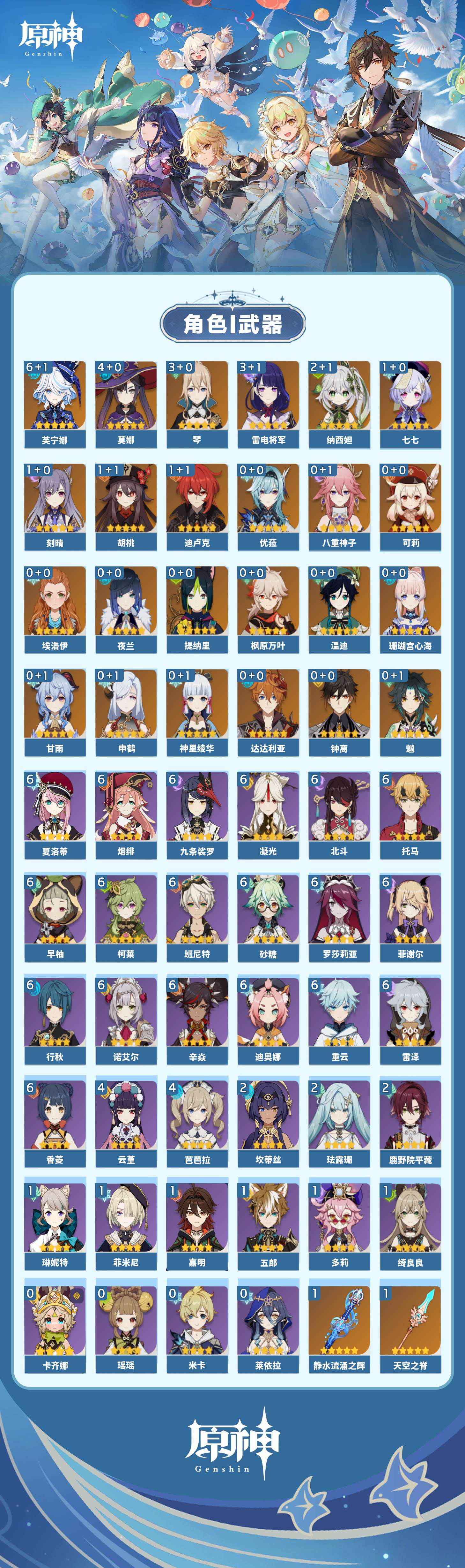 【原神】【lyys10003】冒险等级:60,五星数量:40,五星角色:芙宁娜 6命莫娜 4命雷电将军 3命琴 3命纳西妲 2命迪卢克 1命胡桃 1命刻晴 1命七七 1命珊瑚宫心海神里绫华温迪优菈钟离达达利亚申鹤八重神子夜兰提纳里枫原万叶甘雨魈可莉__五星武器:静水流涌之辉阿莫斯之弓风鹰剑和璞鸢护摩之杖狼的末路天空之傲天空之脊天空之卷无工之剑雾切之回光薙草之稻光息灾神乐之真意圣显之钥千夜浮梦__四星角色:班尼特 6命行秋 6命九条裟罗 6命香菱 6命凝光 6命迪奥娜 6命砂糖 6命柯莱 6命早柚 6命托马 6命烟绯 6命重云 6命辛焱 6命诺艾尔 6命罗莎莉亚 6命雷泽 6命菲谢尔 6命北斗 6命夏洛蒂 6命芭芭拉 4命云堇 4命鹿野院平藏 2命珐露珊 2命坎蒂丝 2命绮良良 1命多莉 1命五郎 1命菲米尼 1命琳妮特 1命嘉明 1命埃洛伊卡齐娜瑶瑶莱依拉米卡带350抽