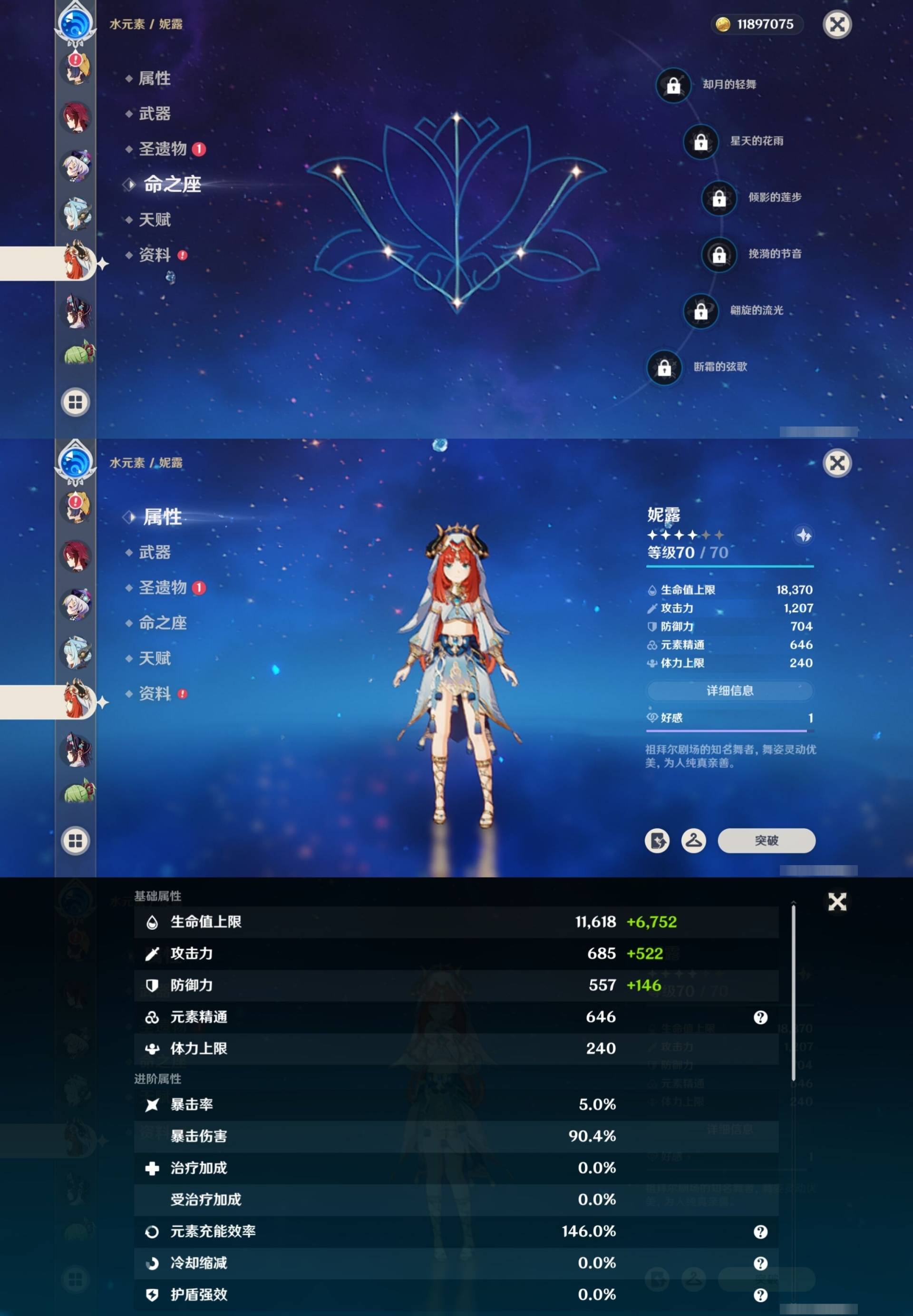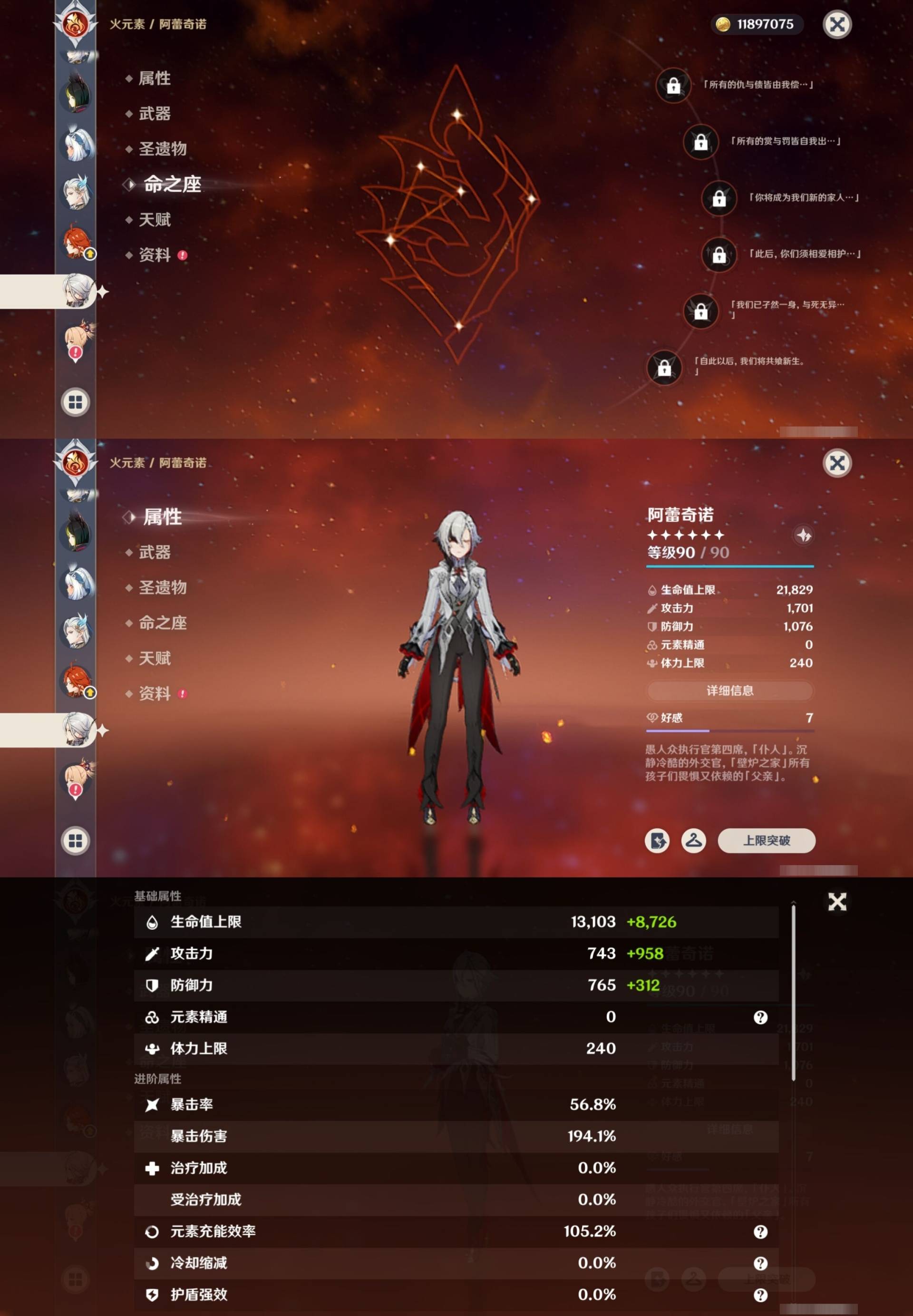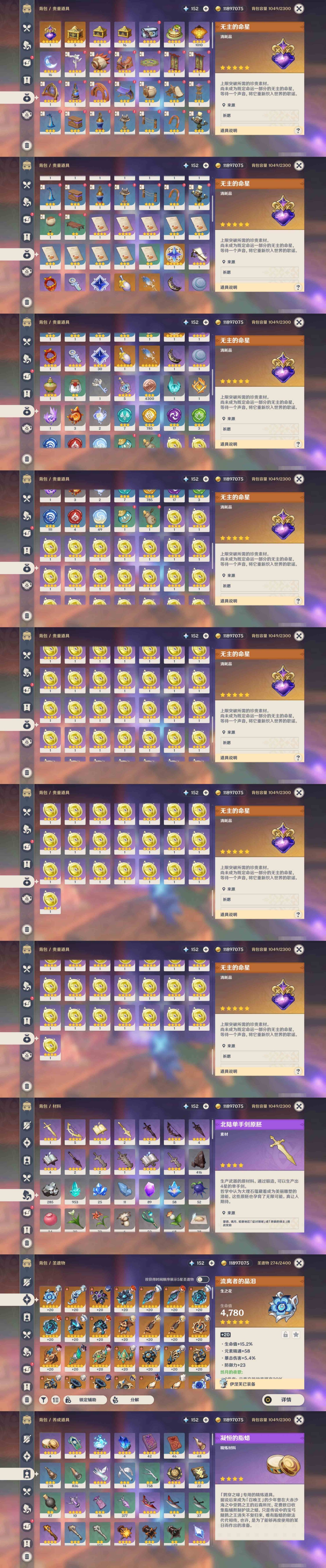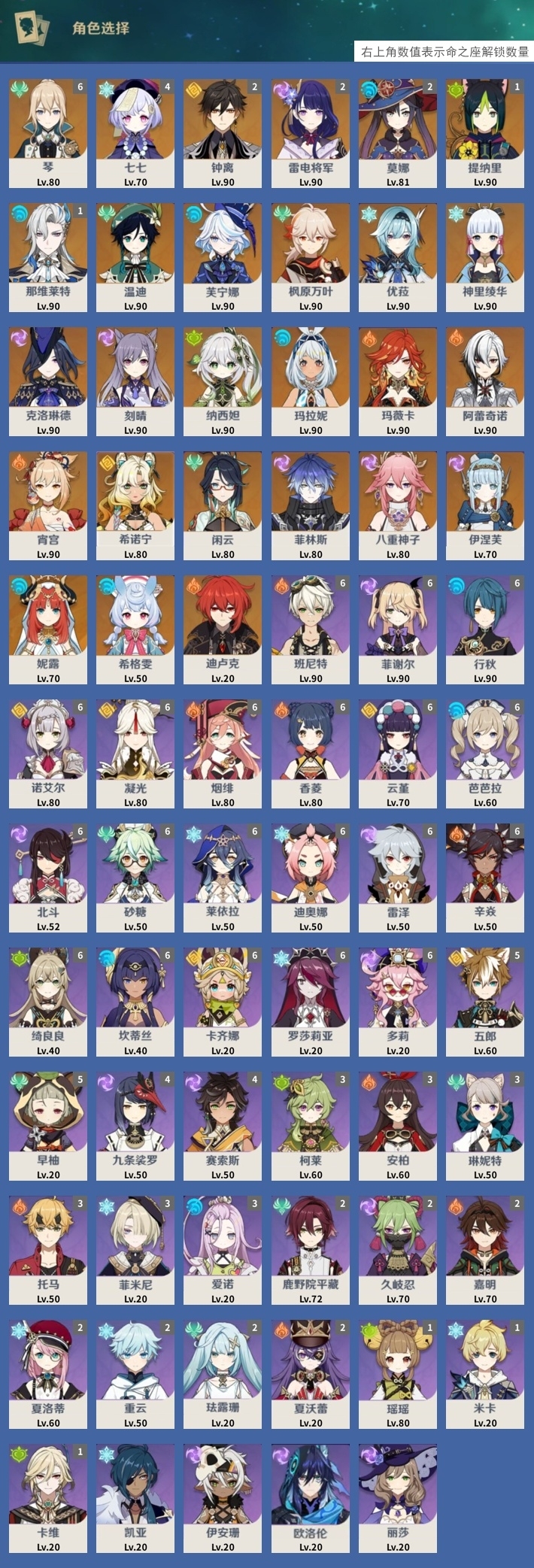 [15170894]57黄 风系:0命枫原万叶/0命闲云/6命琴/0命温迪 火系:0命玛薇卡/0命阿蕾奇诺/0命宵宫/0命迪卢克 水系:0命芙宁娜/0命玛拉妮/1命那维莱特/2命莫娜/0命妮露/0命希格雯 冰系:0命优菈/0命神里绫华/4命七七 岩系:2命钟离/0命希诺宁 雷系:0命克洛琳德/2命雷电将军/0命刻晴/0命菲林斯/0命八重神子/0命伊涅芙 草系:0命纳西妲/1命提纳里 [四星角色等级及命座] 风系: 2命鹿野院平藏/3命琳妮特/6命砂糖/2命珐露珊/5命早柚 火系: 6命烟绯/6命香菱/2命嘉明/3命安柏/3命托马/6命辛焱/2命夏沃蕾/6命班尼特 水系:6命行秋/6命芭芭拉/6命坎蒂丝/3命爱诺 冰系:2命夏洛蒂/6命莱依拉/6命迪奥娜/2命重云/3命菲米尼/1命米卡/6命罗莎莉亚/0命凯亚 岩系:6命诺艾尔/6命凝光/6命云堇/5命五郎 雷系:2命久岐忍/6命北斗/4命九条裟罗/6命雷泽/4命赛索斯/0命伊安珊/0命欧洛伦/6命多莉/0命丽莎/6命菲谢尔 草系:1命瑶瑶/3命柯莱/6命绮良良/1命卡维 [角色经验书] 紫色42/蓝色46 [小物品] 脆弱树脂16/嬗变之尘6 [特殊材料] 东风之翎1/东风之爪1/东风的吐息6/北风之环3/北风的魂匣3/吞天之鲸·只角13/魔王之刃·残片9 武炼之魂·孤影12/龙王之冕2/血玉之枝4/鎏金之鳞5/智识之冕31 [神瞳剩余数量] 风神瞳1/岩神瞳1/雷神瞳1