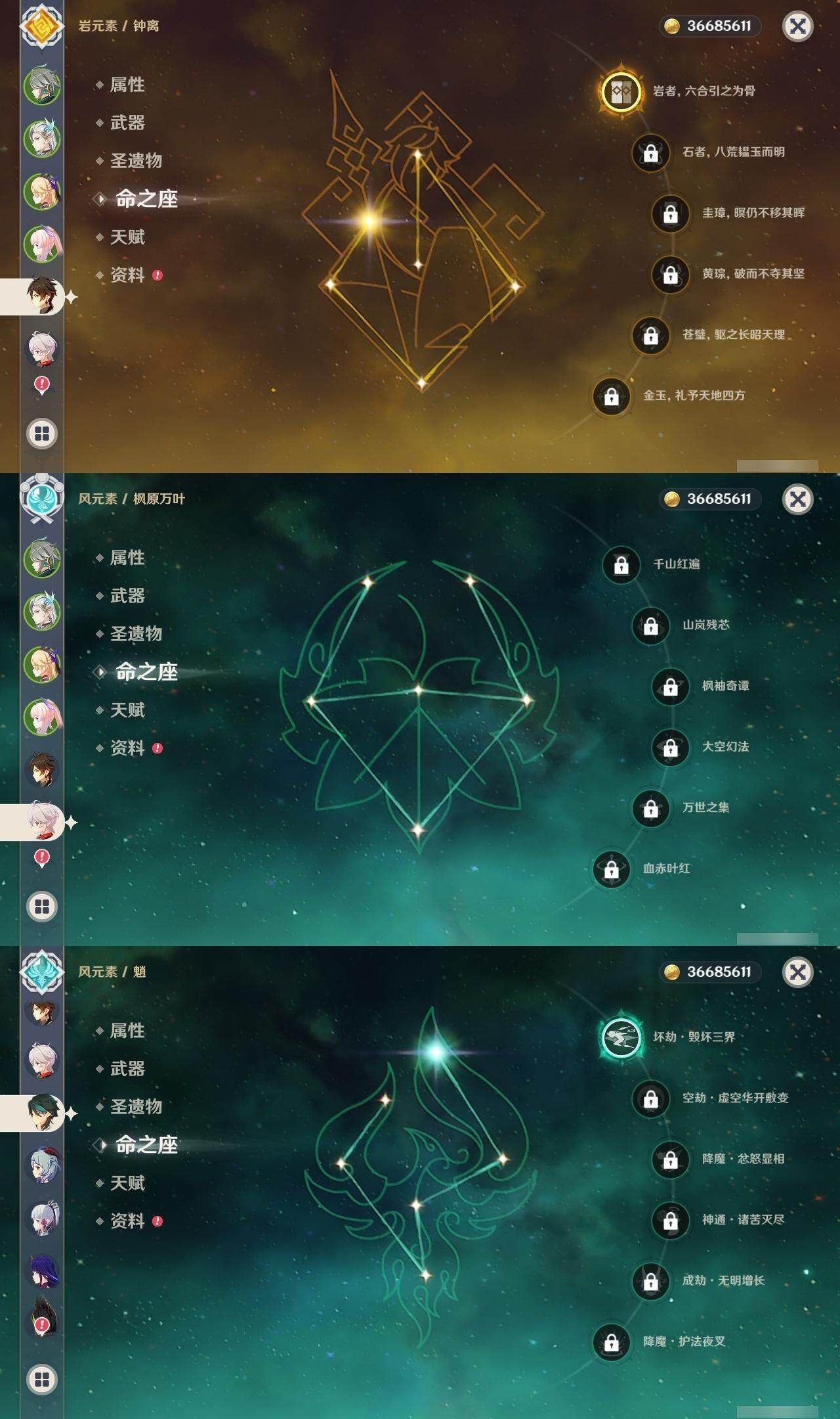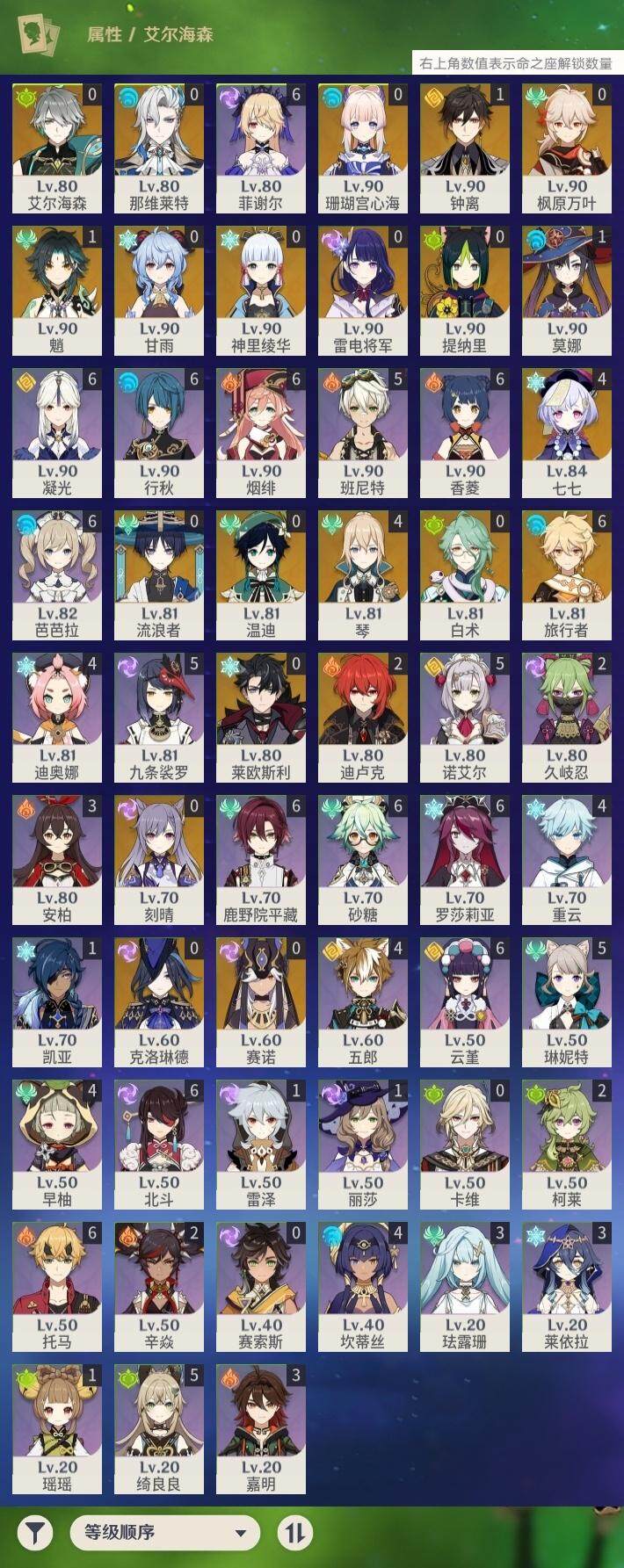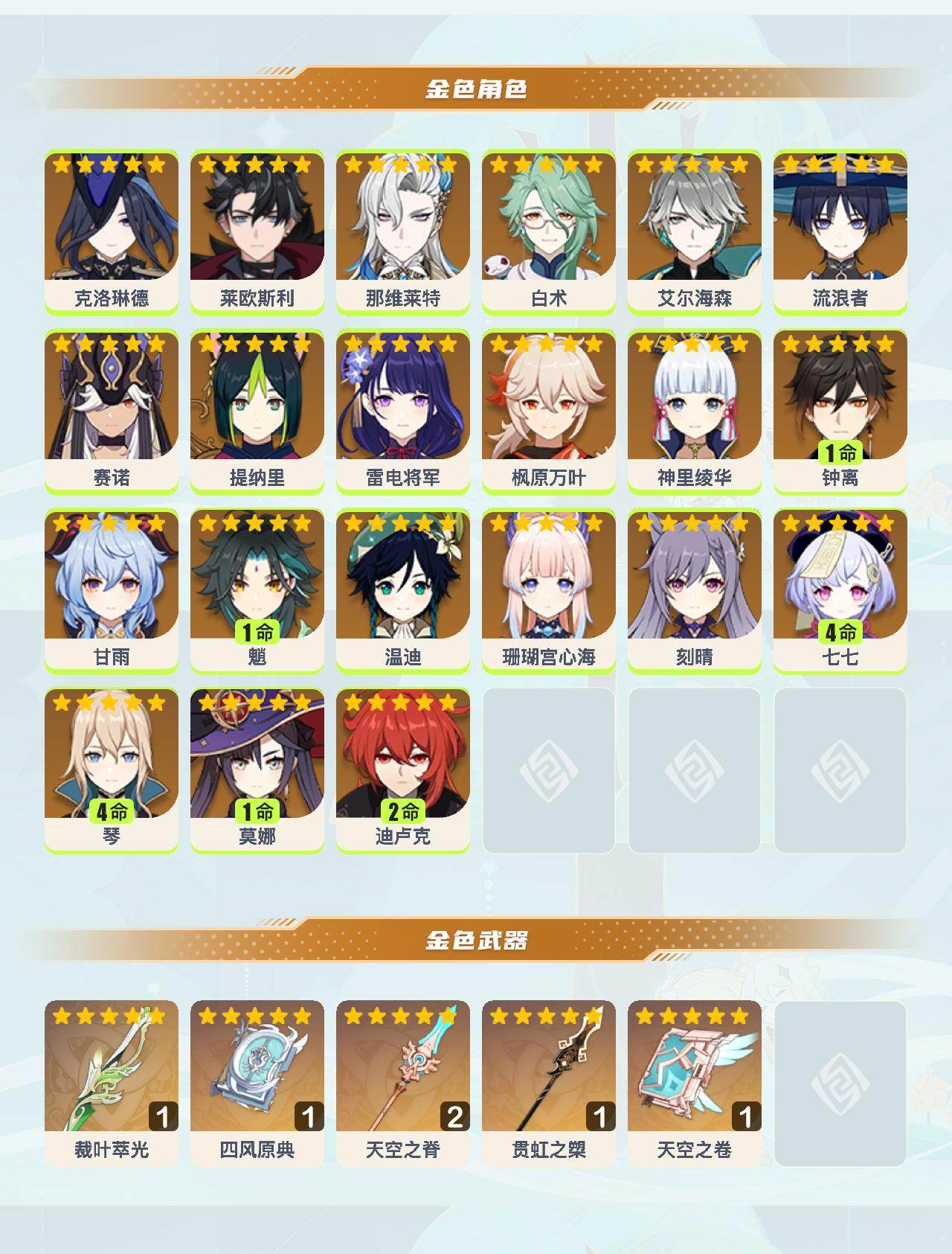 59级/40黄/男主/21个五星角色/5个五星武器 0命克洛琳德0命莱欧斯利0命那维莱特0命白术0命艾尔海森0命流浪者0命赛诺0命提纳里0命雷电将军0命枫原万叶0命神里绫华1命钟离0命甘雨1命魈0命温迪0命珊瑚宫心海0命刻晴4命七七4命琴1命莫娜2命迪卢克精1裁叶萃光精1四风原典精2天空之脊精1贯虹之槊精1天空之卷