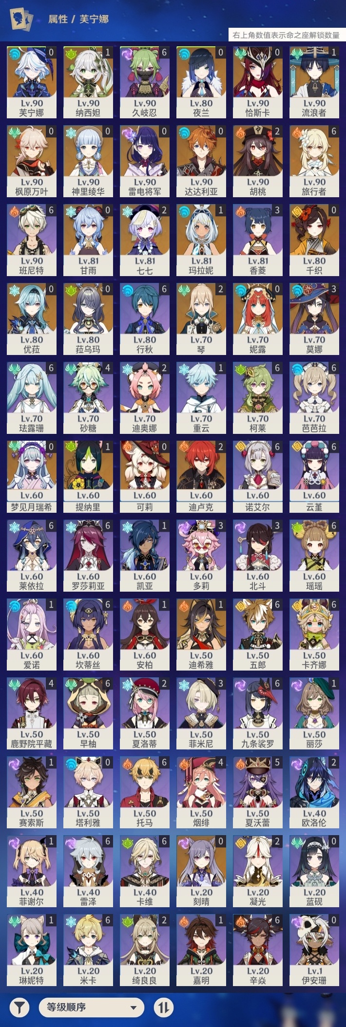 【原神】【lyys10049】冒险等级:58,五星数量:38,五星角色:莫娜 3命迪卢克 2命胡桃 2命七七 2命琴 2命玛拉妮 1命迪希雅 1命提纳里 1命纳西妲 1命流浪者 1命神里绫华恰斯卡优菈达达利亚梦见月瑞希夜兰芙宁娜千织妮露菈乌玛枫原万叶甘雨可莉刻晴雷电将军__五星武器:冲浪时光苇海信标有乐御簾切纺夜天镜阿莫斯之弓护摩之杖狼的末路四风原典松籁响起之时天空之脊天空之刃薙草之稻光千夜浮梦__四星角色:卡齐娜 6命班尼特 6命行秋 6命九条裟罗 6命久岐忍 6命珐露珊 6命瑶瑶 6命莱依拉 6命米卡 6命坎蒂丝 6命柯莱 6命卡维 6命芭芭拉 6命云堇 6命早柚 6命托马 6命五郎 6命辛焱 6命诺艾尔 6命罗莎莉亚 6命雷泽 6命夏沃蕾 5命鹿野院平藏 4命砂糖 4命烟绯 4命香菱 3命多莉 3命北斗 3命菲米尼 3命凝光 2命迪奥娜 2命绮良良 2命欧洛伦 2命夏洛蒂 2命重云 1命菲谢尔 1命琳妮特 1命嘉明 1命爱诺 1命赛索斯 1命蓝砚伊安珊塔利雅
