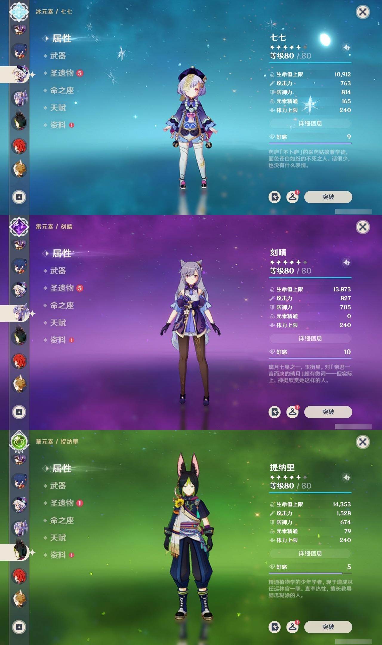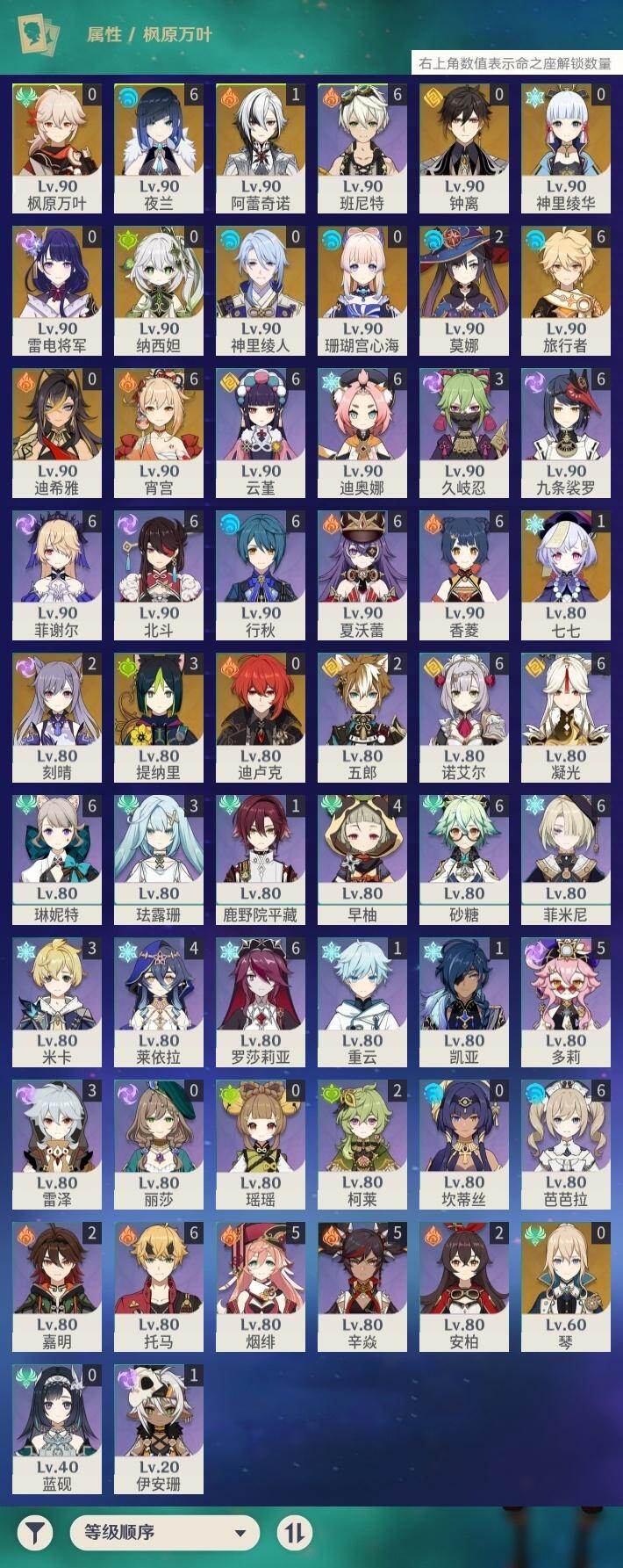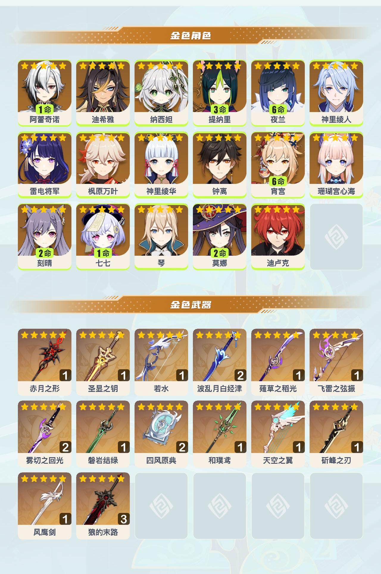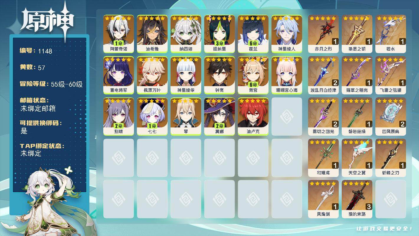 [14952664]60级/57黄/男主/17个五星角色/14个五星武器 1命阿蕾奇诺0命迪希雅0命纳西妲3命提纳里满命夜兰0命神里绫人0命雷电将军0命枫原万叶0命神里绫华0命钟离满命宵宫0命珊瑚宫心海2命刻晴1命七七0命琴2命莫娜0命迪卢克精1赤月之形精1圣显之钥精1若水精2波乱月白经津精1薙草之稻光精1飞雷之弦振精2雾切之回光精1磐岩结绿精2四风原典精1和璞鸢精1天空之翼精1斫峰之刃精1风鹰剑精3狼的末路