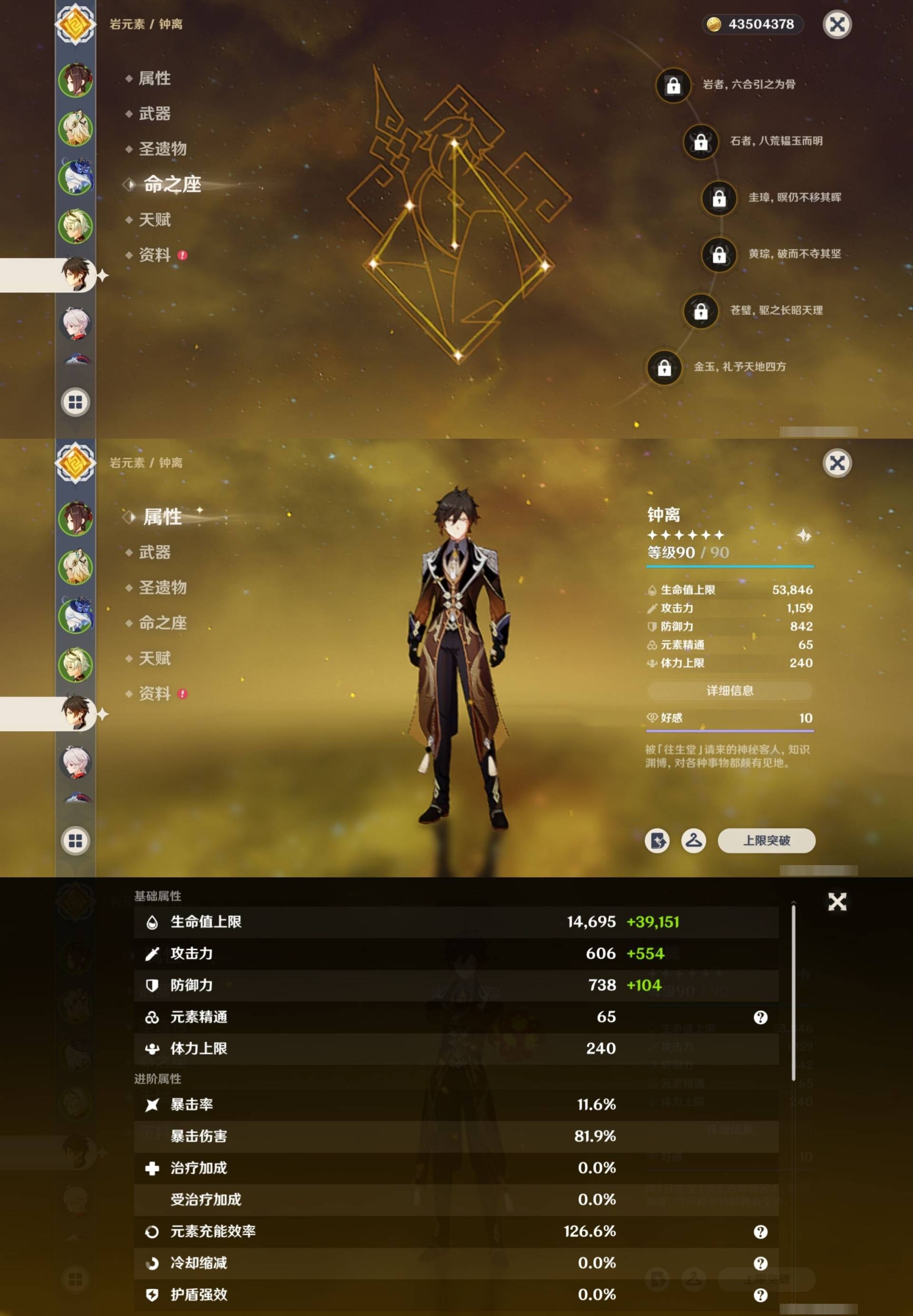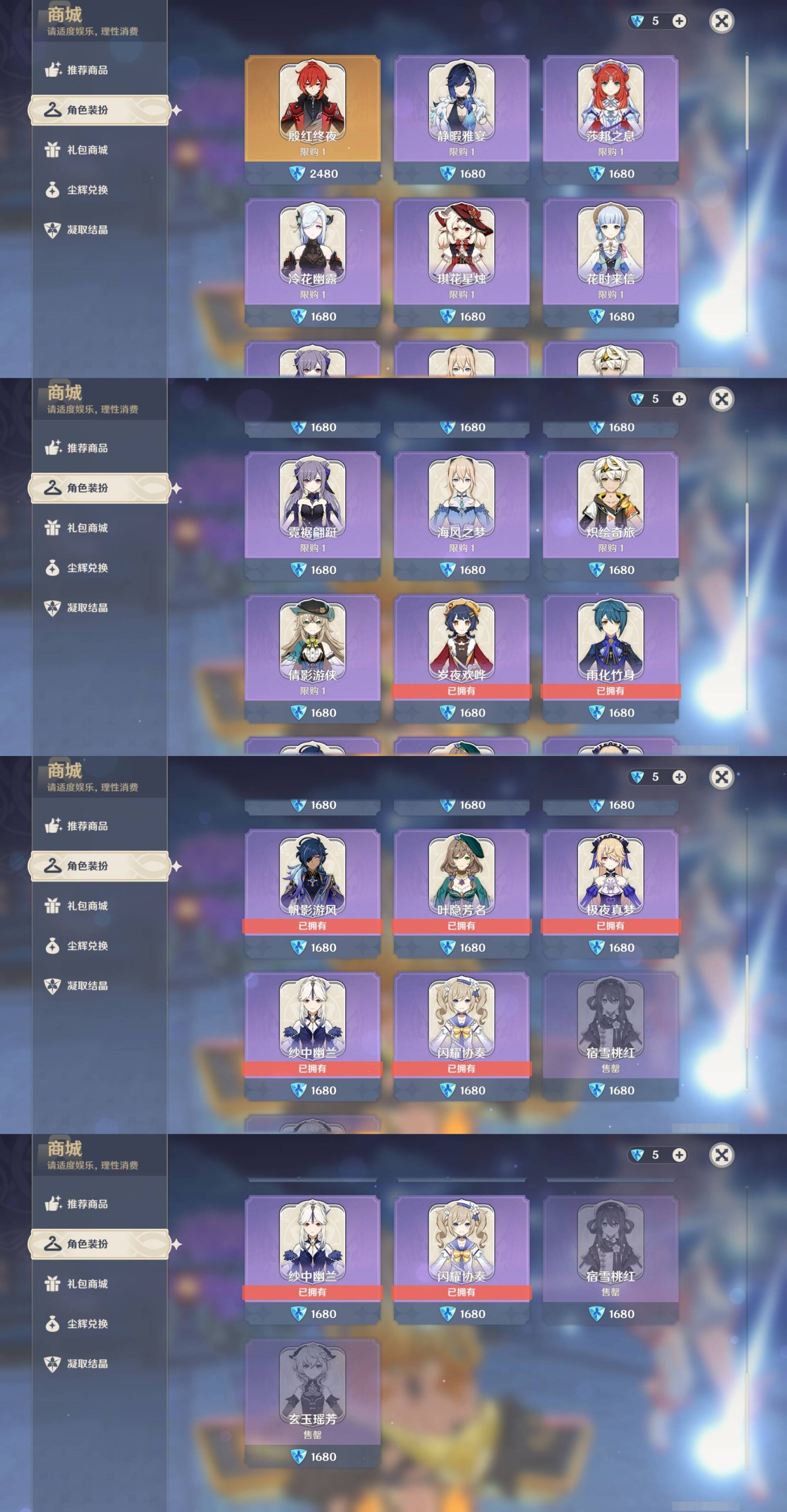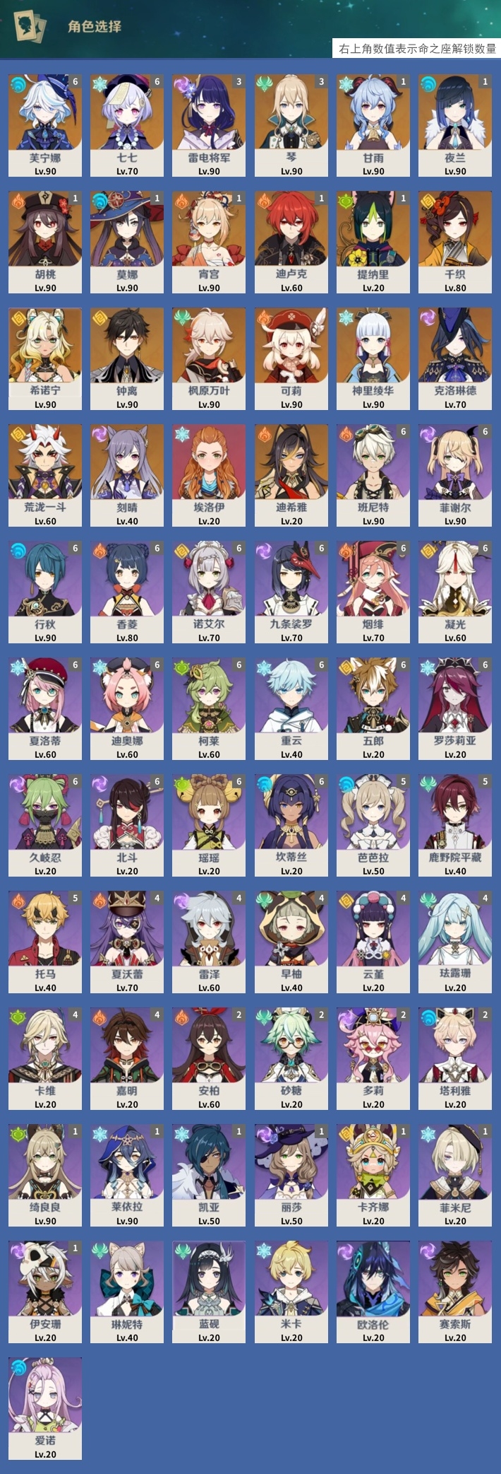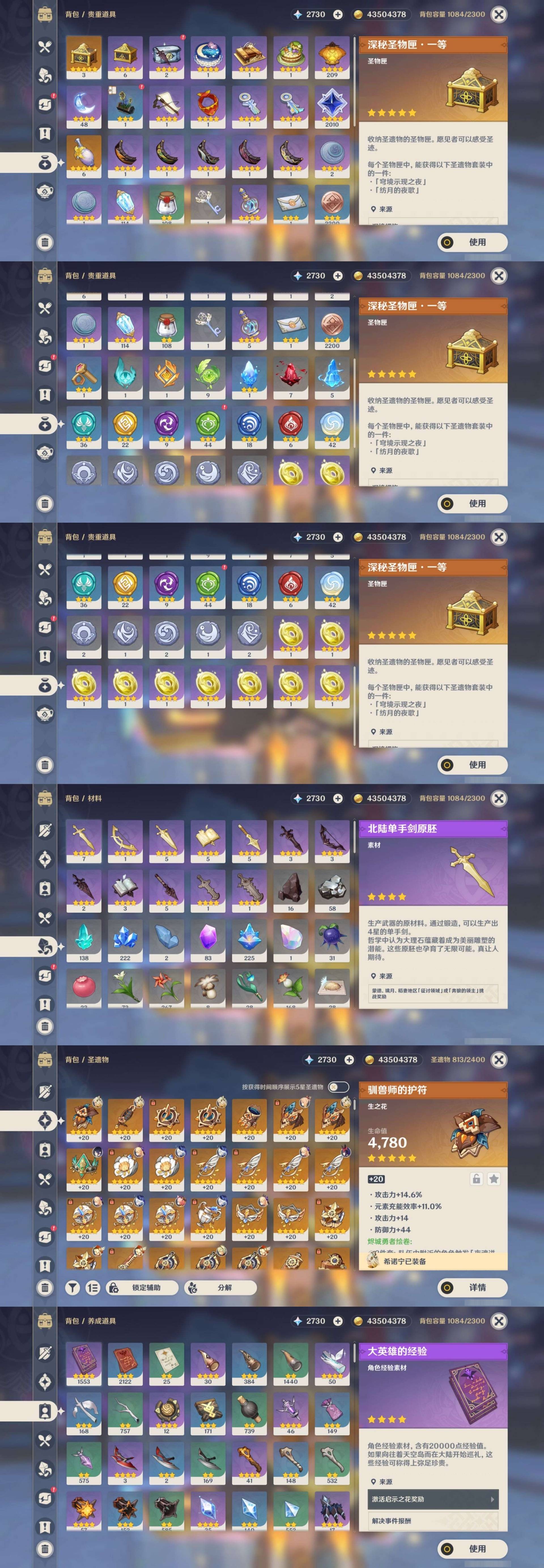 [15205221]62黄 风系:0命枫原万叶/3命琴 火系:1命胡桃/0命可莉/1命宵宫/1命迪卢克/0命迪希雅 水系:6命芙宁娜/1命夜兰/1命莫娜 冰系:1命甘雨/0命神里绫华/6命七七/0命埃洛伊 岩系:0命希诺宁/0命钟离/0命荒泷一斗/0命千织 雷系:3命雷电将军/0命克洛琳德/0命刻晴 草系:1命提纳里 [四星角色等级及命座] 风系: 0命琳妮特/5命鹿野院平藏/4命早柚/0命蓝砚/4命珐露珊/2命砂糖 火系: 6命班尼特/4命夏沃蕾/6命香菱/6命烟绯/2命安柏/5命托马/4命嘉明 水系:6命行秋/5命芭芭拉/0命爱诺/2命塔利雅/6命坎蒂丝 冰系:1命莱依拉/6命夏洛蒂/6命迪奥娜/1命凯亚/6命重云/1命菲米尼/0命米卡/6命罗莎莉亚 岩系:6命诺艾尔/6命凝光/4命云堇/6命五郎 雷系:6命菲谢尔/6命九条裟罗/4命雷泽/1命丽莎/1命伊安珊/0命欧洛伦/0命赛索斯/2命多莉/6命久岐忍/6命北斗 草系:1命绮良良/6命柯莱/4命卡维/6命瑶瑶 [角色经验书] 紫色1553/蓝色2122/绿色25 [小物品] 脆弱树脂48/异梦溶媒114/嬗变之尘108 [特殊材料] 东风之翎23/东风之爪28/东风的吐息32/北风之尾27/北风之环20/北风的魂匣30/吞天之鲸·只角36 魔王之刃·残片19/武炼之魂·孤影34/龙王之冕27/血玉之枝22/鎏金之鳞15/智识之冕20