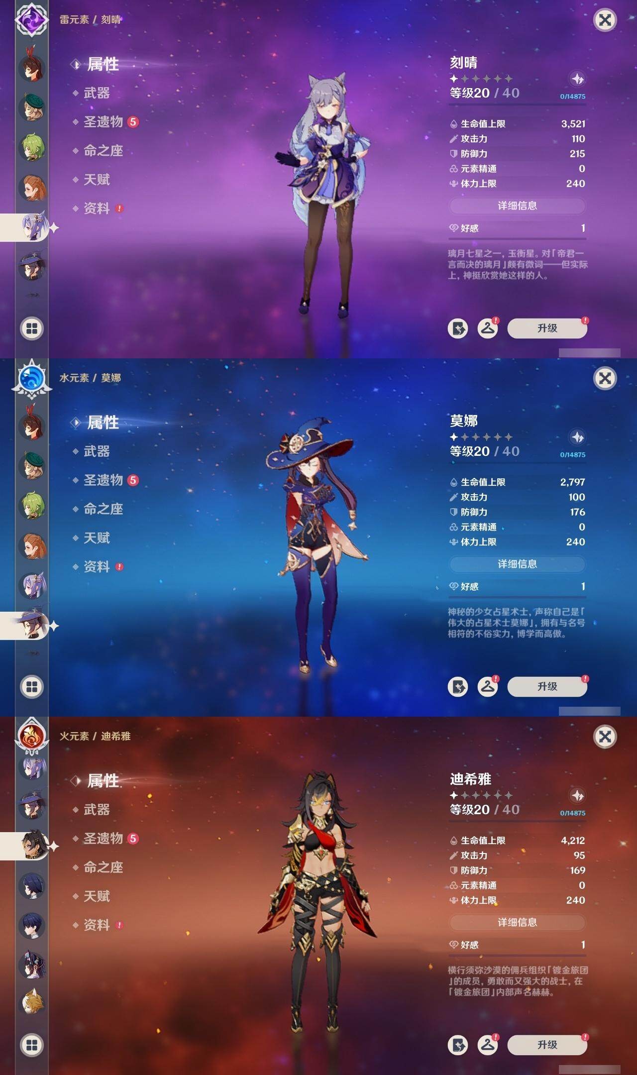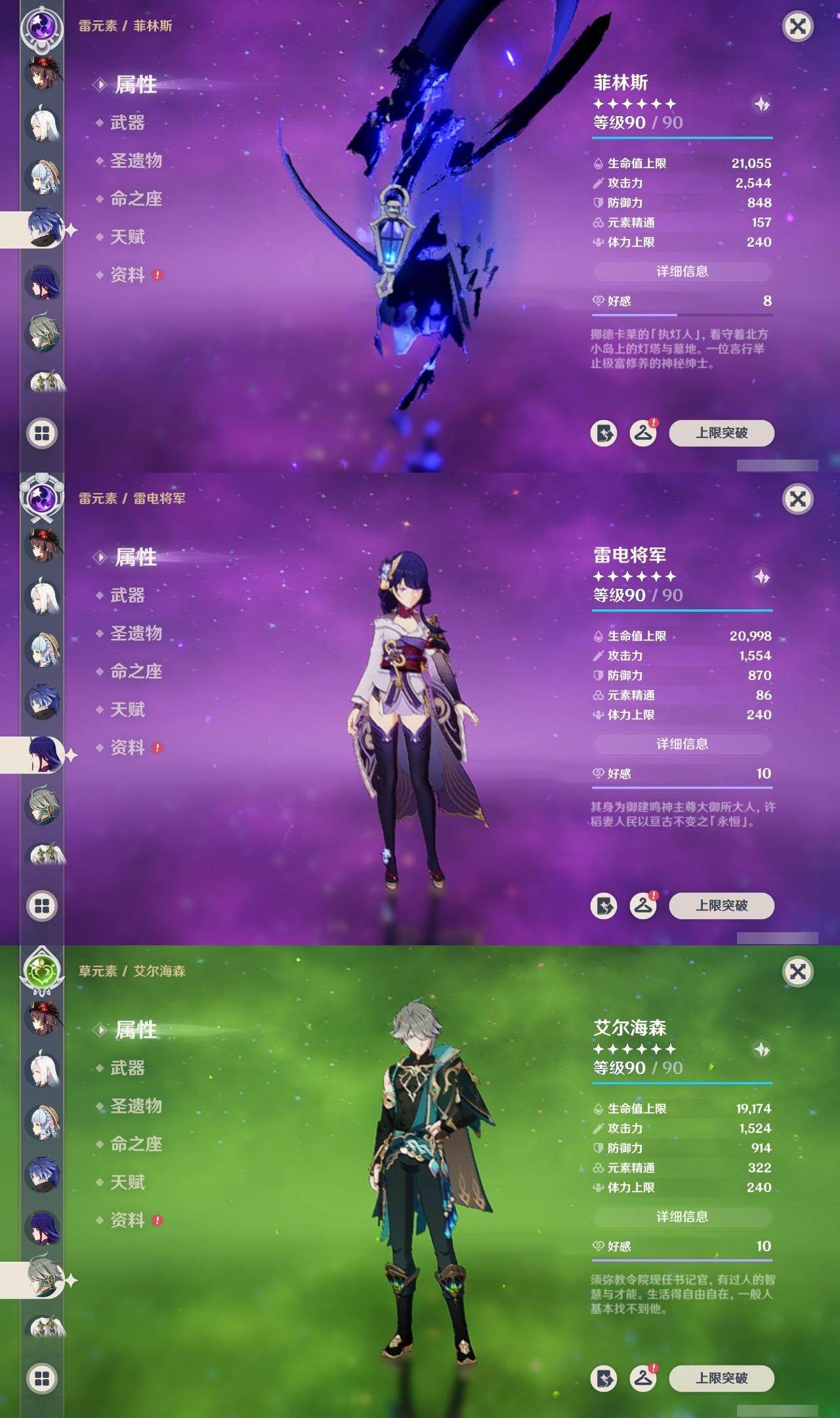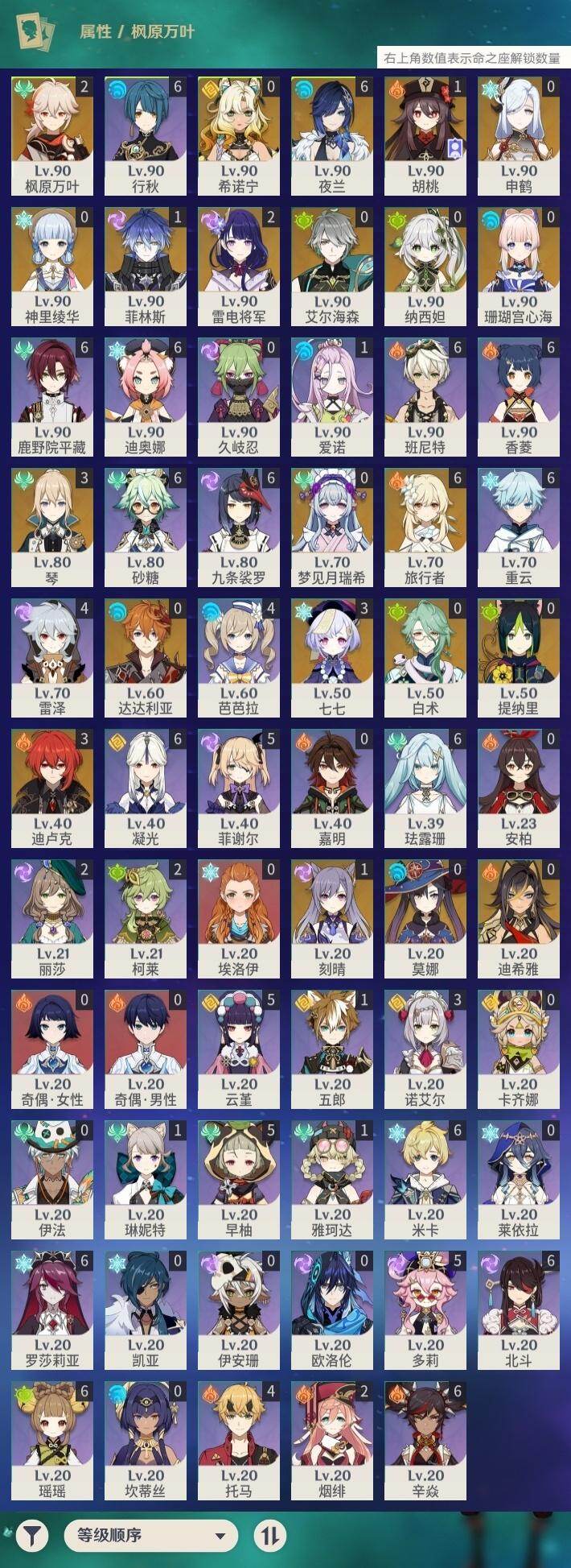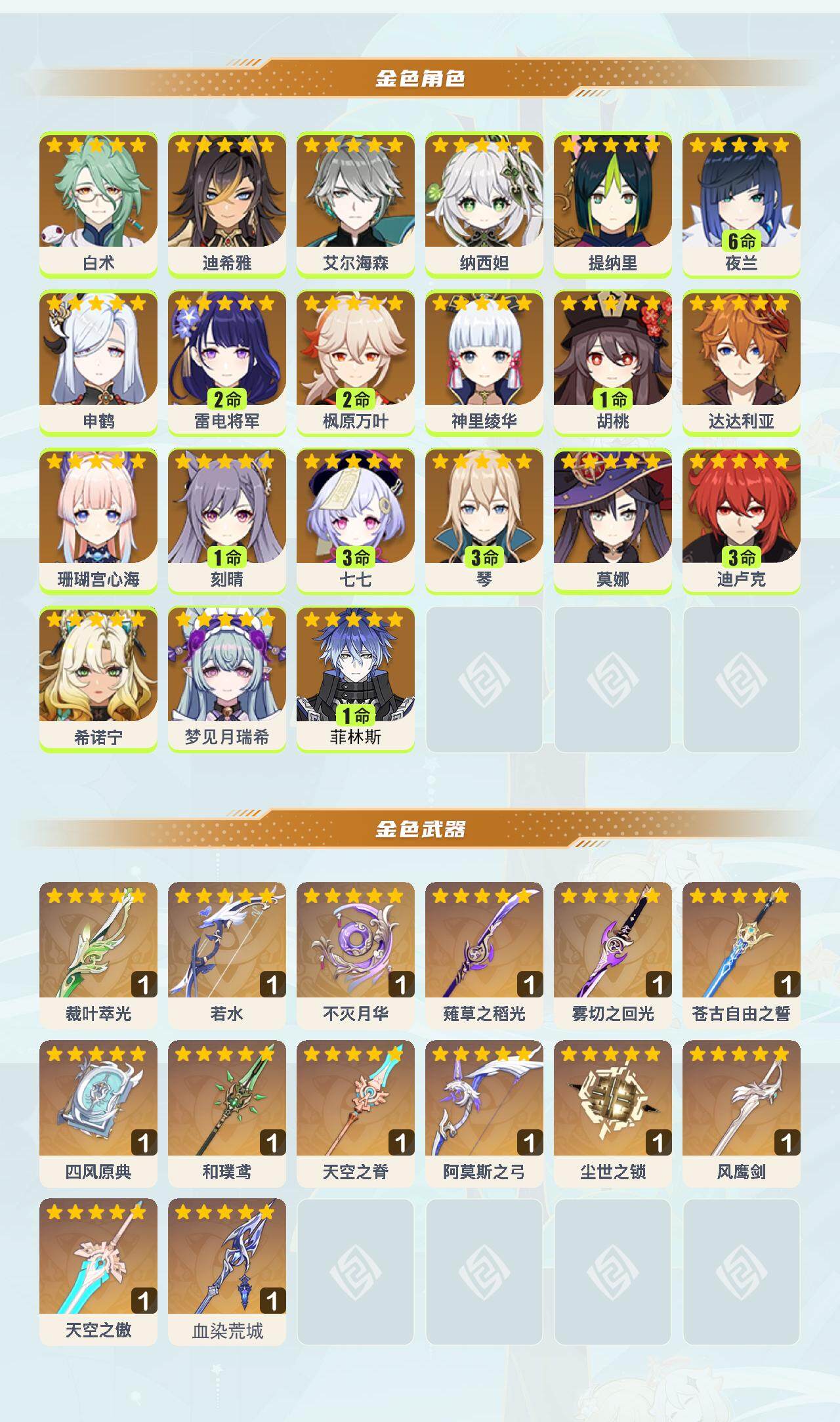 59级/61黄/女主/21个五星角色/18个五星武器 0命白术0命迪希雅0命艾尔海森0命纳西妲0命提纳里满命夜兰0命申鹤2命雷电将军2命枫原万叶0命神里绫华1命胡桃0命达达利亚0命珊瑚宫心海1命刻晴3命七七3命琴0命莫娜3命迪卢克0命希诺宁0命梦见月瑞希1命菲林斯精1裁叶萃光精1若水精1不灭月华精1薙草之稻光精1雾切之回光精1苍古自由之誓精1四风原典精1和璞鸢精1天空之脊精1阿莫斯之弓精1尘世之锁精1风鹰剑精1天空之傲精1血染荒城