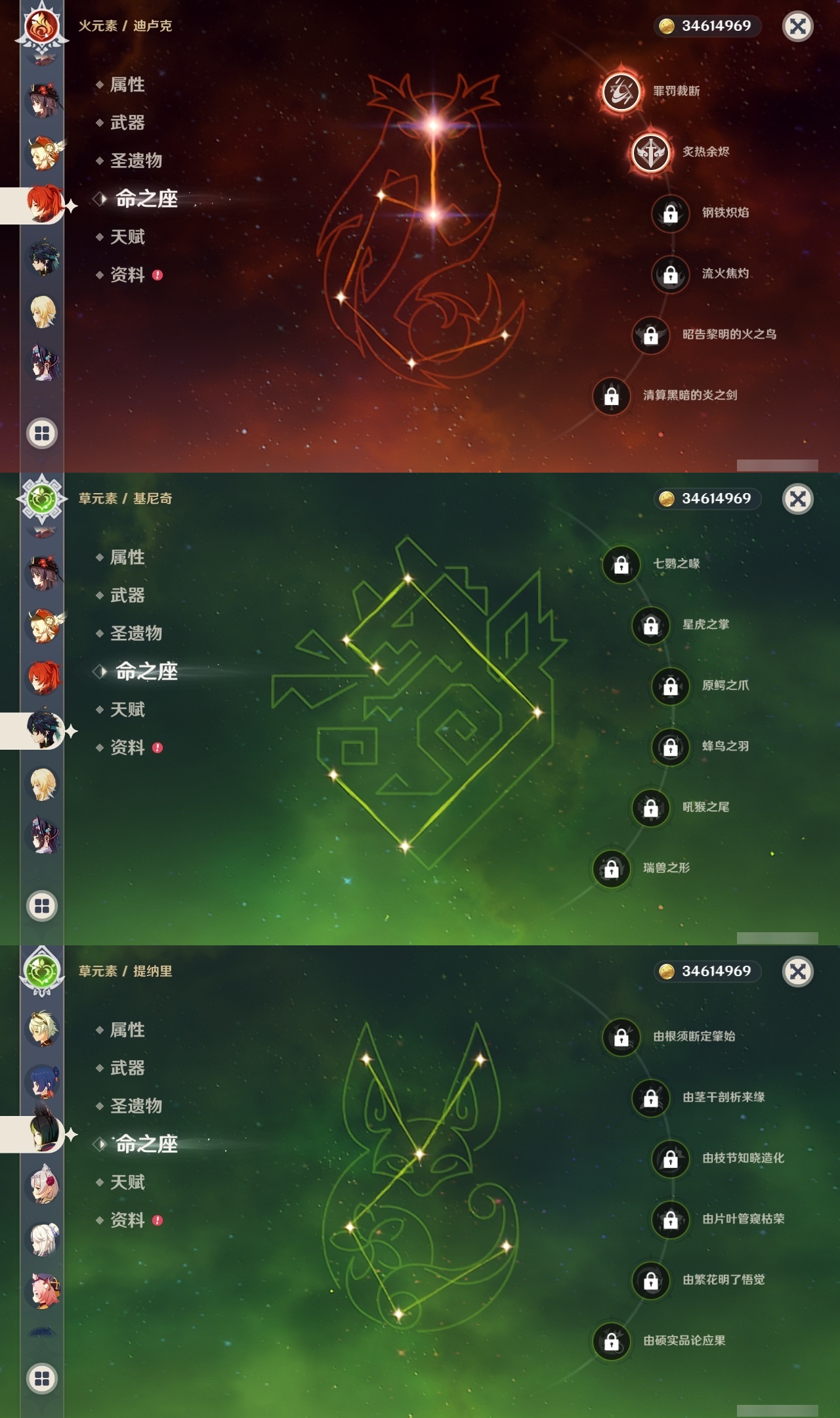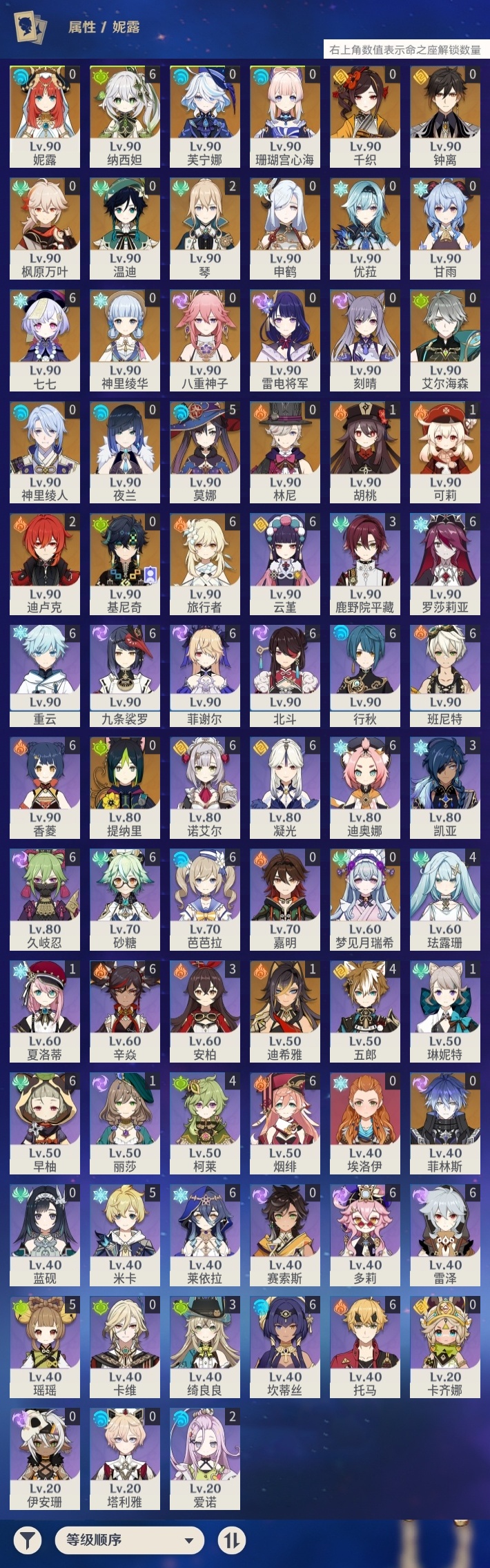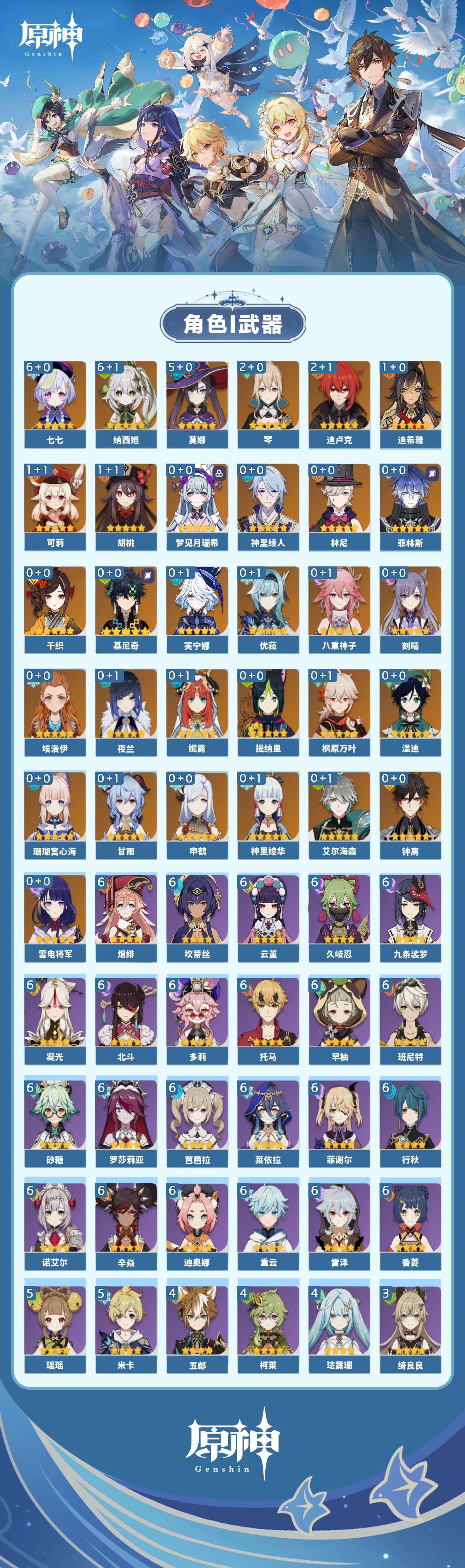 【原神】【lyys10086】冒险等级:60,五星数量:51,五星角色:七七 6命纳西妲 6命莫娜 5命迪卢克 2命琴 2命迪希雅 1命胡桃 1命可莉 1命基尼奇珊瑚宫心海神里绫华温迪优菈钟离梦见月瑞希申鹤八重神子神里绫人林尼夜兰芙宁娜提纳里千织妮露菲林斯艾尔海森枫原万叶甘雨刻晴雷电将军__五星武器:碧落之珑静水流涌之辉裁叶萃光阿莫斯之弓苍古自由之誓风鹰剑和璞鸢护摩之杖狼的末路磐岩结绿四风原典松籁响起之时天空之傲天空之刃天空之翼雾切之回光神乐之真意若水圣显之钥千夜浮梦__四星角色:班尼特 6命行秋 6命九条裟罗 6命香菱 6命久岐忍 6命凝光 6命迪奥娜 6命砂糖 6命莱依拉 6命坎蒂丝 6命多莉 6命芭芭拉 6命云堇 6命早柚 6命托马 6命烟绯 6命重云 6命辛焱 6命诺艾尔 6命罗莎莉亚 6命雷泽 6命菲谢尔 6命北斗 6命瑶瑶 5命米卡 5命珐露珊 4命柯莱 4命五郎 4命鹿野院平藏 3命绮良良 3命爱诺 2命琳妮特 1命夏洛蒂 1命埃洛伊卡齐娜卡维蓝砚嘉明伊安珊塔利雅赛索斯